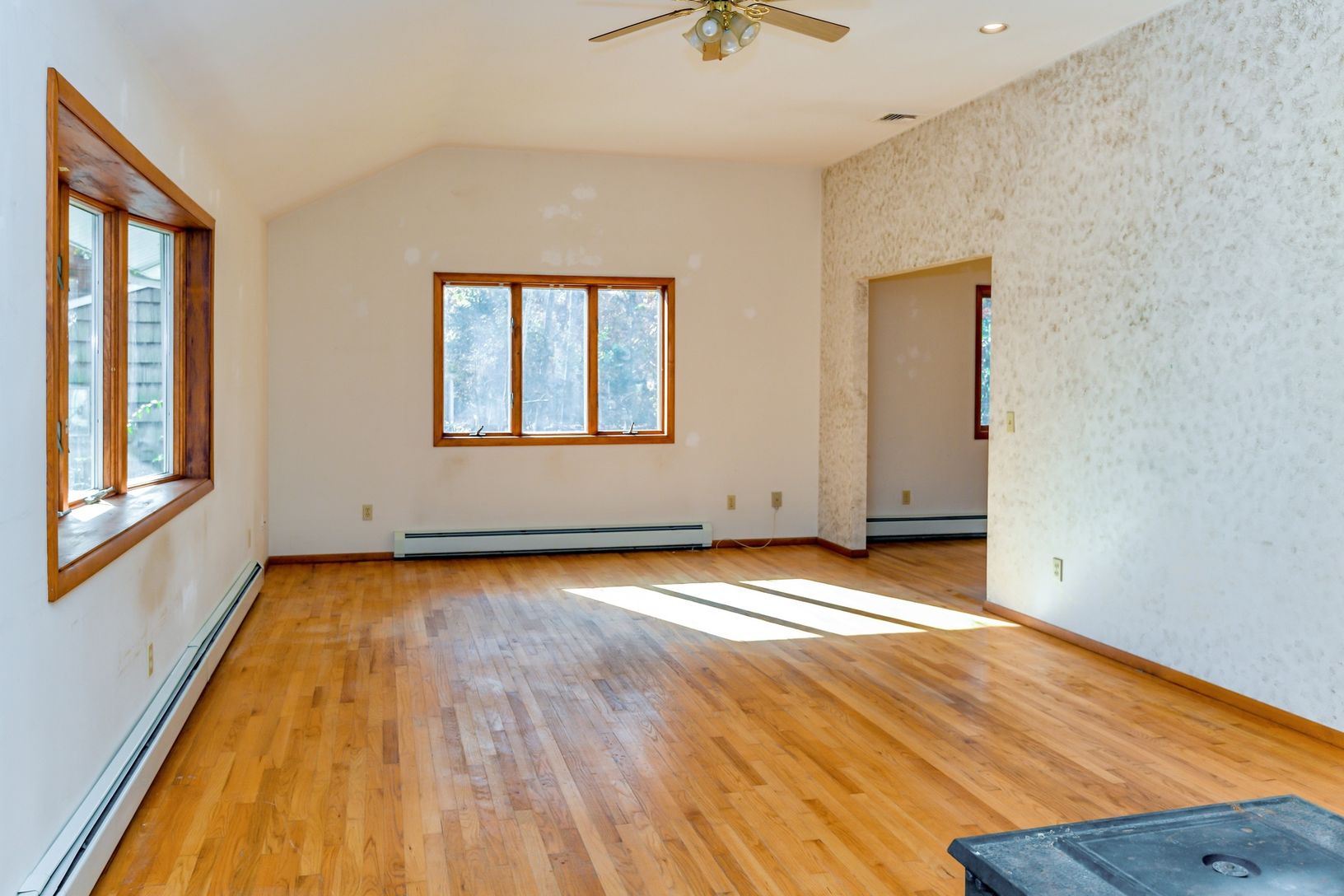Terrific potential to create a sparkling gem in a private beach community. Sited on .56 +/- acres and conveniently located between both Clearwater Beach & Gerard Point, this home features three bedrooms, one bath, and a vaulted ceiling great room complete with a wood stove for cozy evenings. The attached two car garage leads down to a full basement with full height ceilings, egress out and potential to be turned into a finished space. The