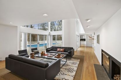 Here is the perfect setting for a relaxing summer in the Hamptons. The five-bedroom, five-bath Modern home on 2.4 +/- acres was just renovated and features a heated pool, spa, and tennis court! Interior highlights include a living room with fireplace, family room, office, formal dining, eat-in kitchen, a newly finished basement with state-of-the-art gym, billiard room and extra Bedroom/Den w 65" TV screen. Also features a new elevator. Each be