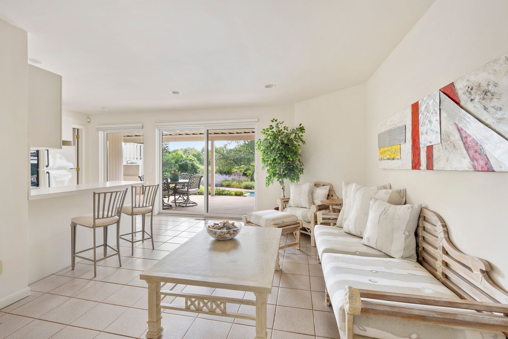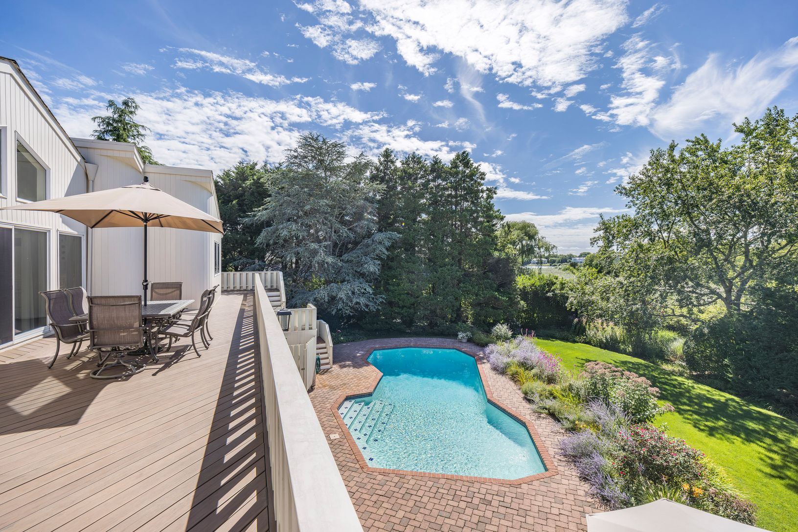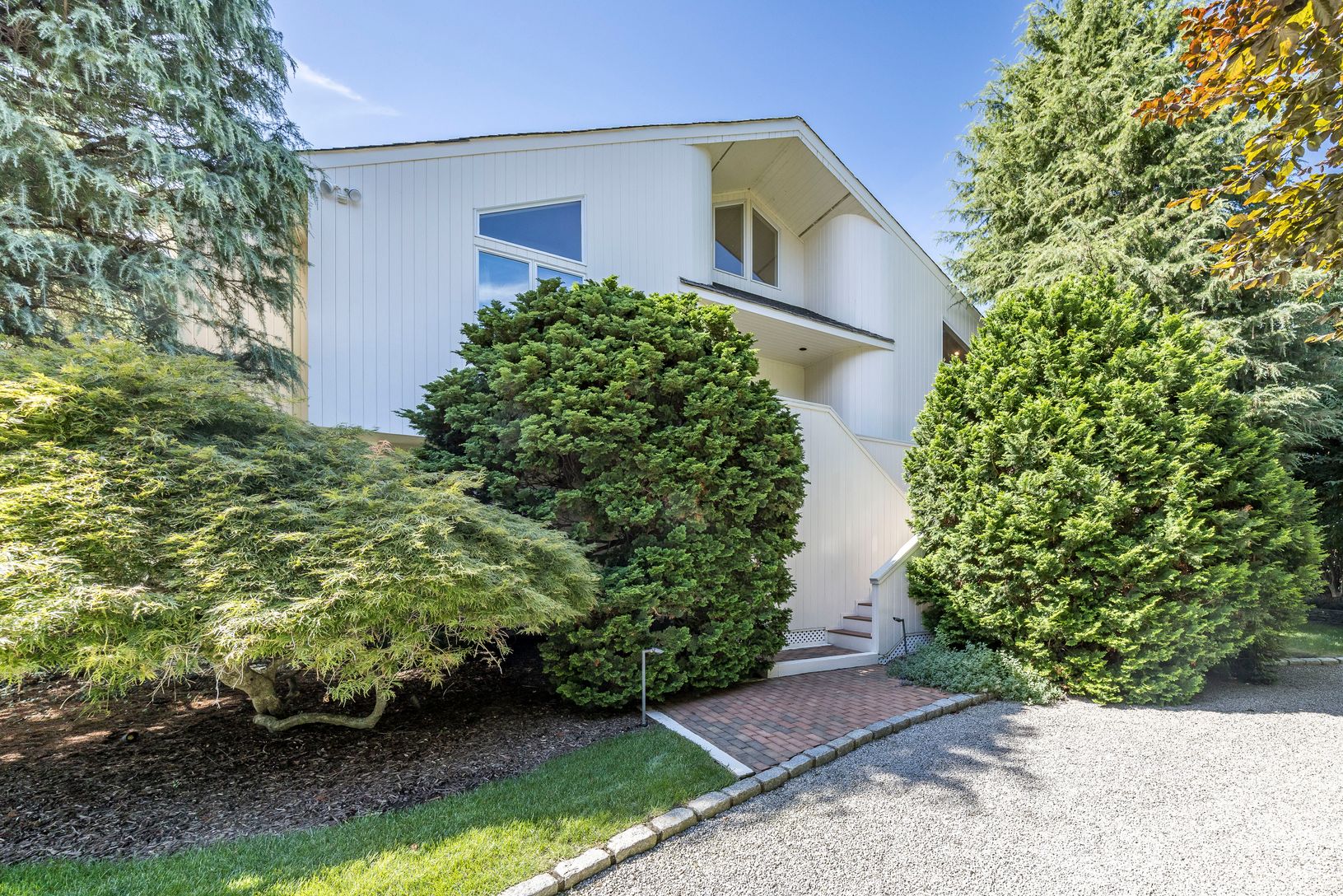 Escape into this secluded Water Mill West Mecox waterfront community, to a contemporary style residence surrounded by a pristine landscaped acre, with mature specimen trees, privacy hedges, beautiful estate like gardens, glimpses of Mecox Bay and scenic western sunsets. The 3,800+/- sq. ft. home has a double height, light filled entry foyer and an open-floor plan that includes a grand living room with vaulted ceiling and fireplace, that flows