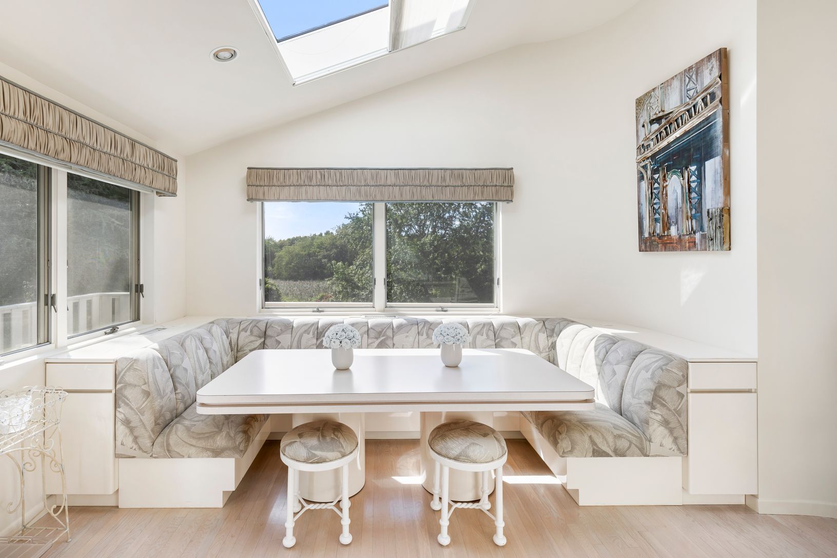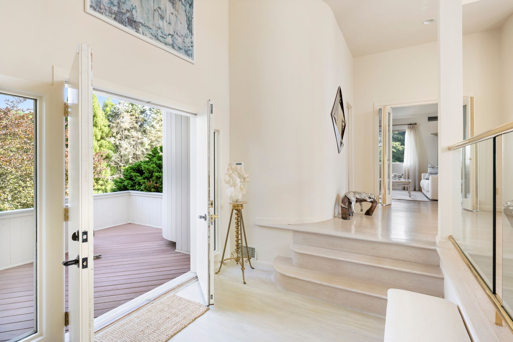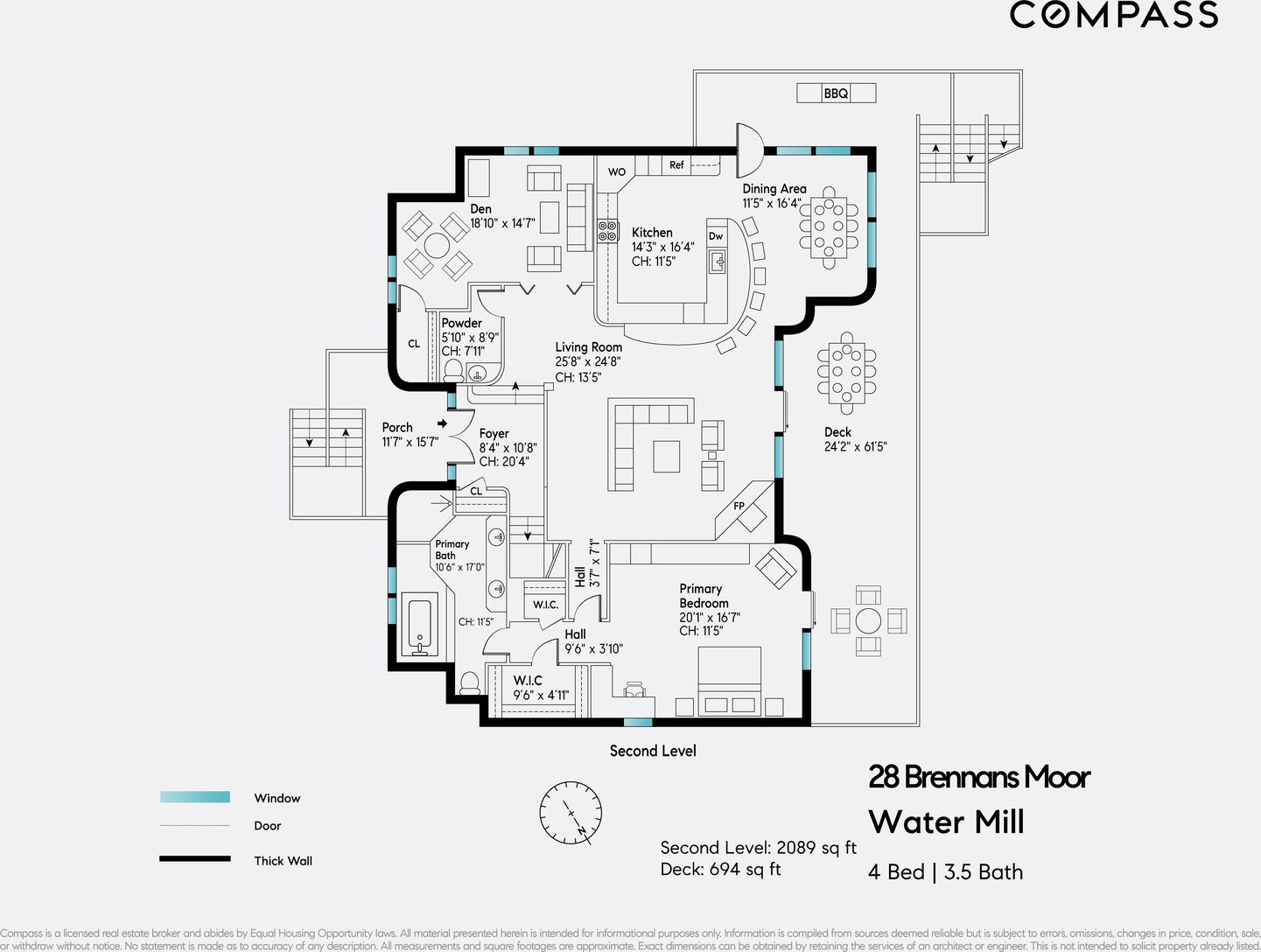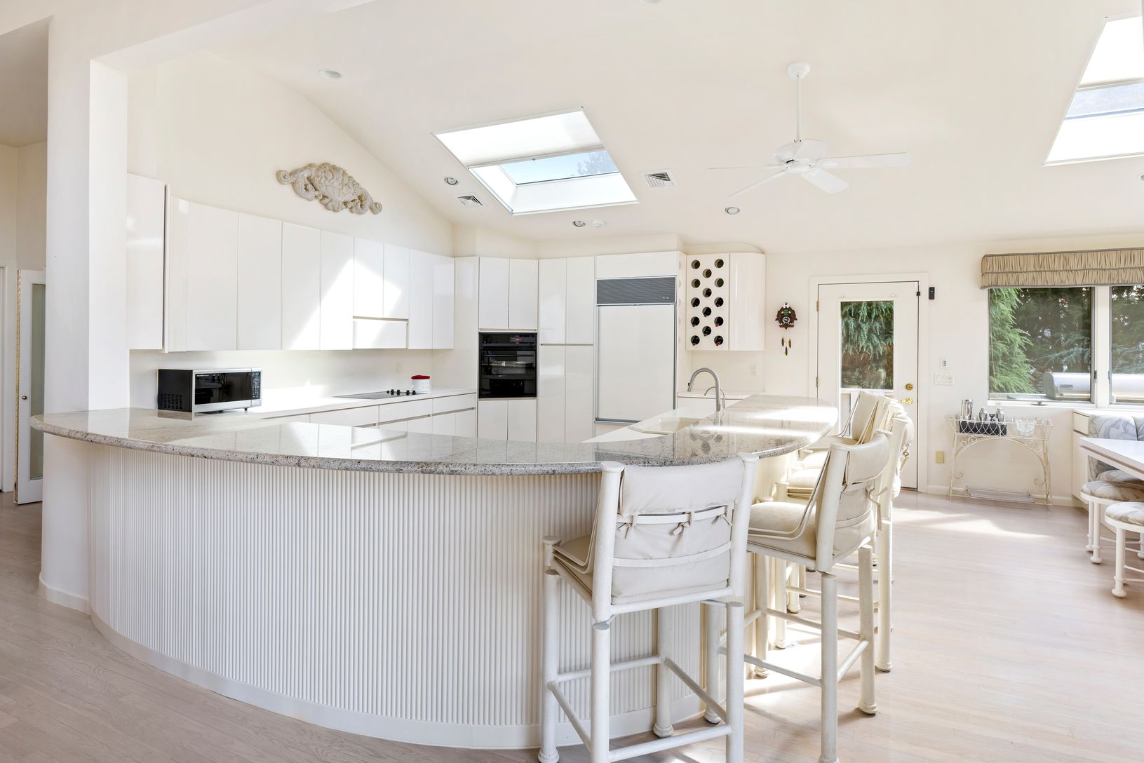 Escape into this secluded Water Mill West Mecox waterfront community, to a contemporary style residence surrounded by a pristine landscaped acre, with mature specimen trees, privacy hedges, beautiful estate like gardens, glimpses of Mecox Bay and scenic western sunsets. The 3,800+/- sq. ft. home has a double height, light filled entry foyer and an open-floor plan that includes a grand living room with vaulted ceiling and fireplace, that flows