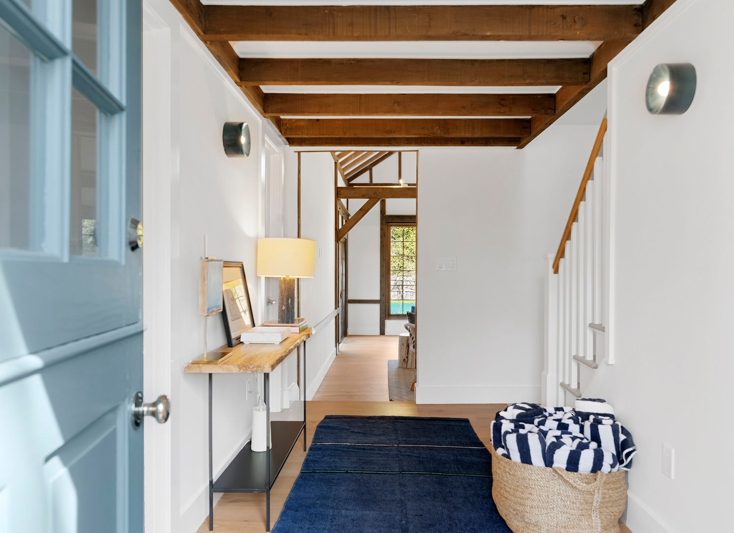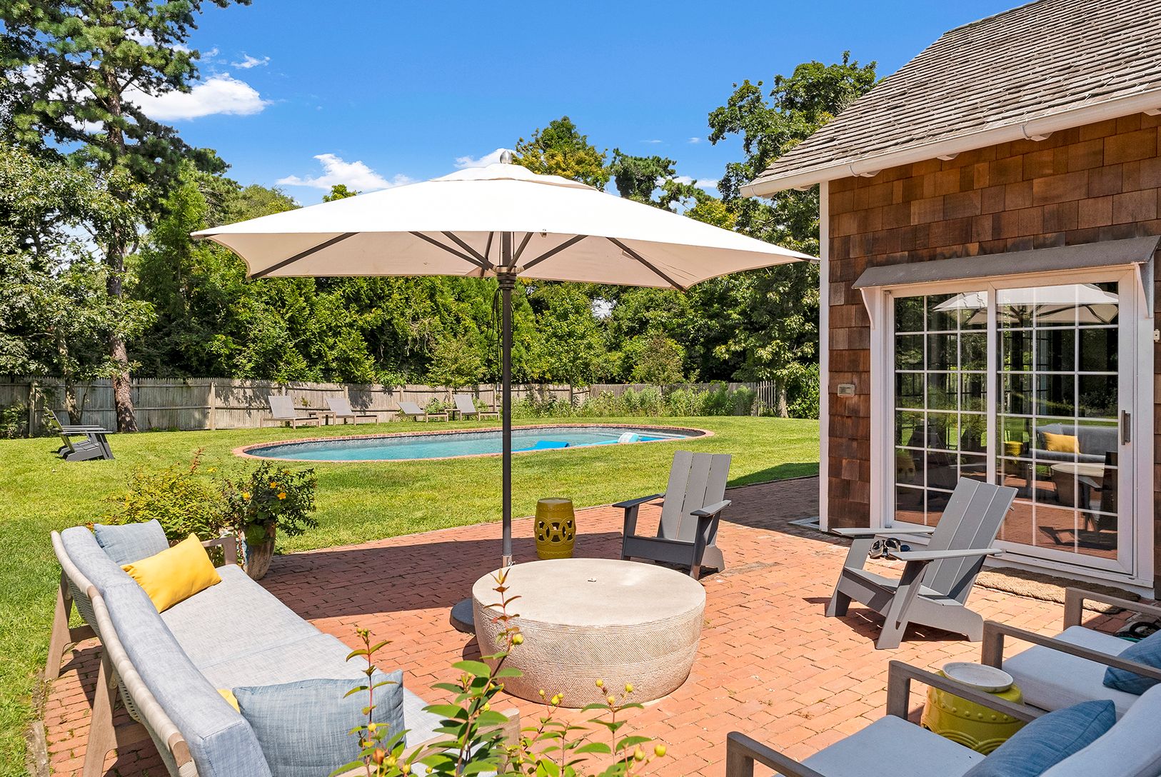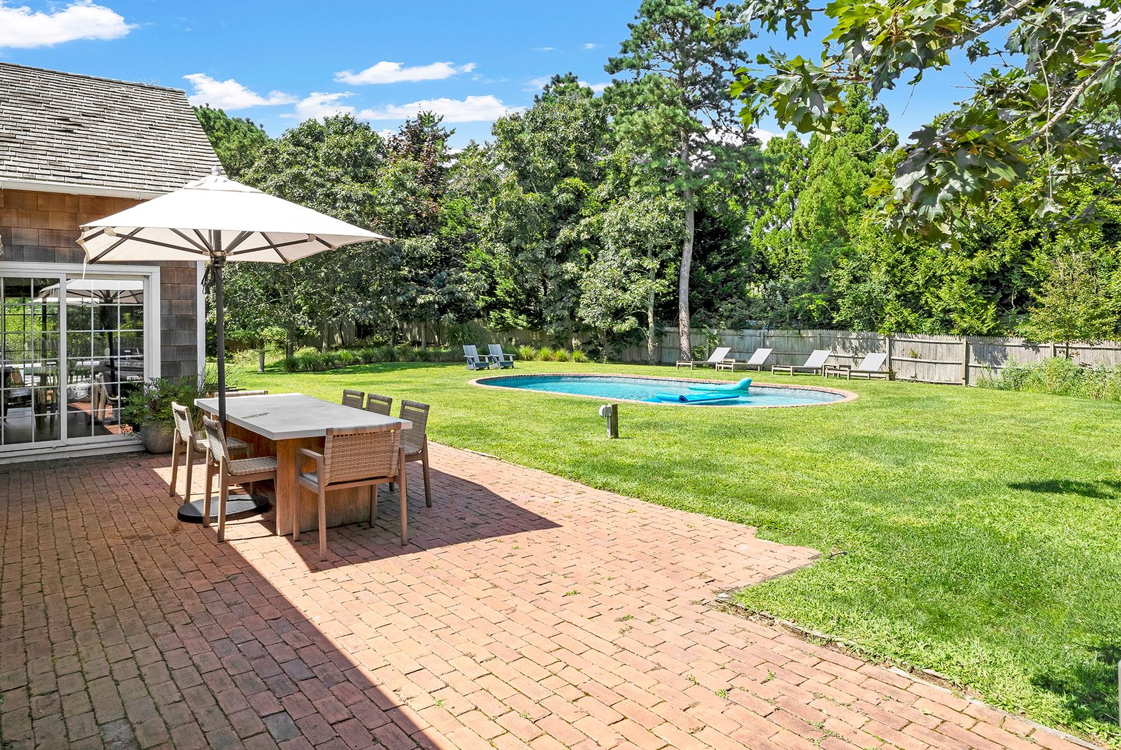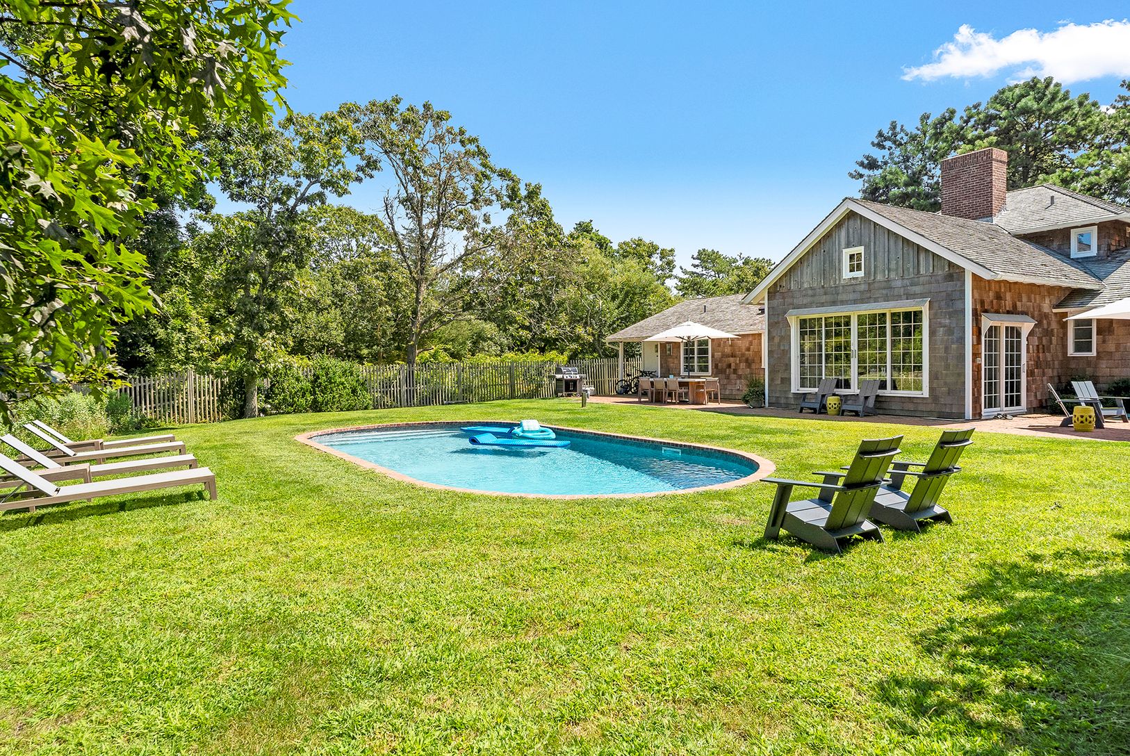 Located in Beach Hampton, Amagansett Dunes on a spacious 0.74+\- acre parcel, this very special traditional cedar residence features 4 bedrooms and 3.5 bathrooms across 2,500+\- sf of living space. Thoroughly renovated in 2022 with a professional kitchen, stunning marble bathrooms, and new hardwood flooring, the heart of the home is an expansive central living/dining room with a soaring vaulted, exposed-beam ceiling and brick fireplace. Fully