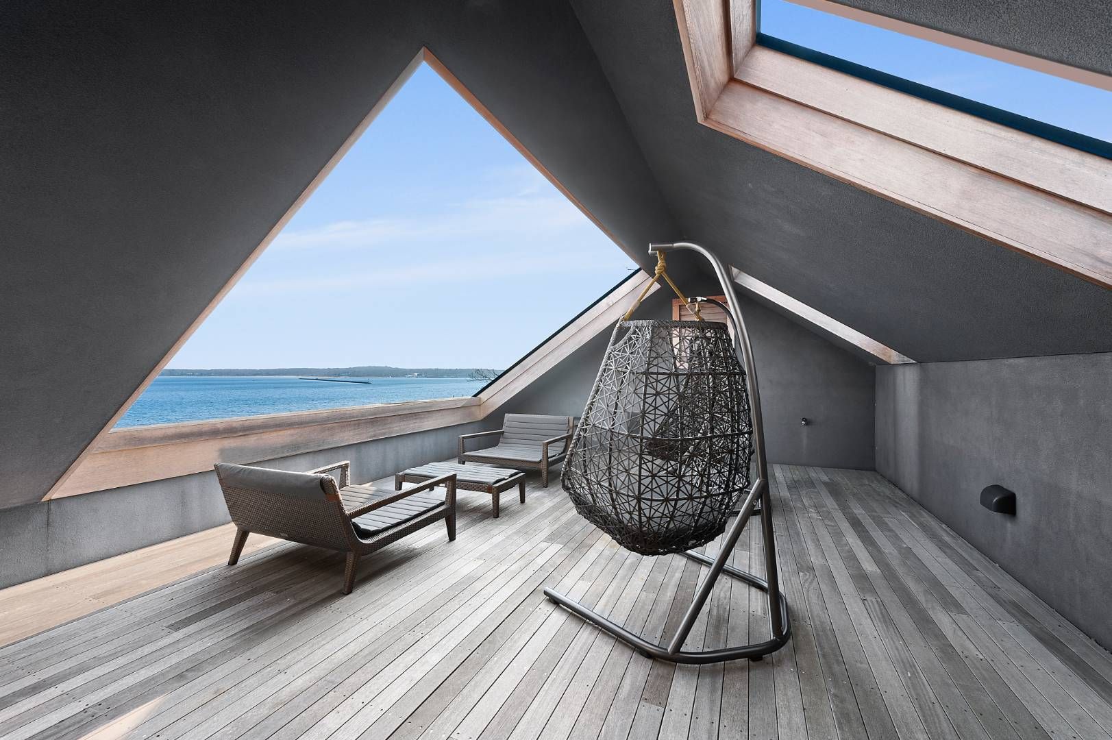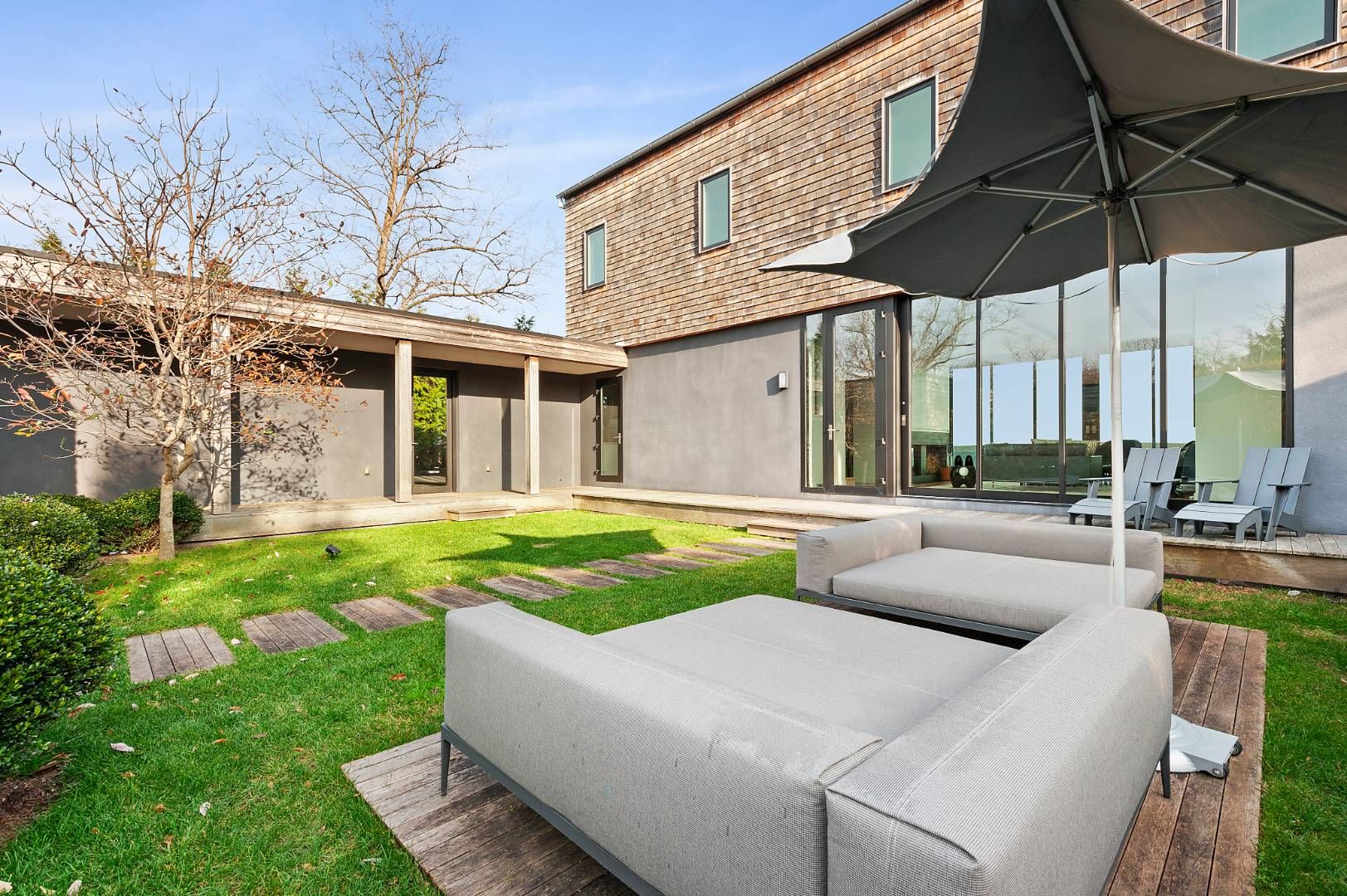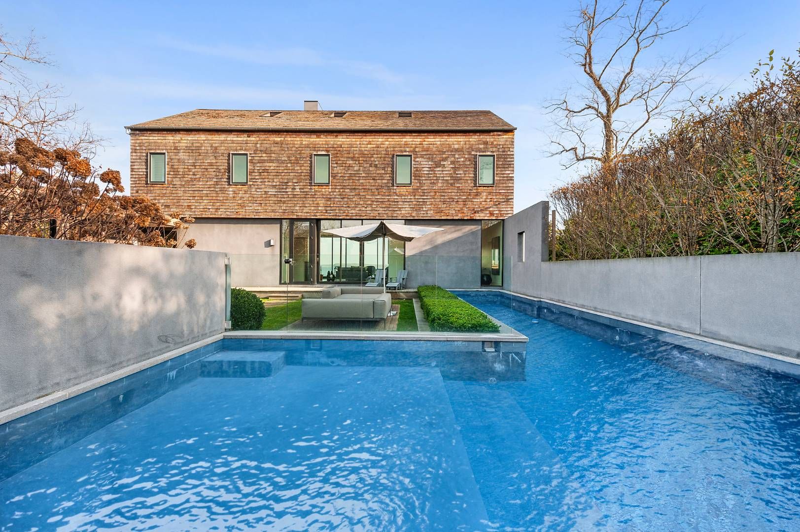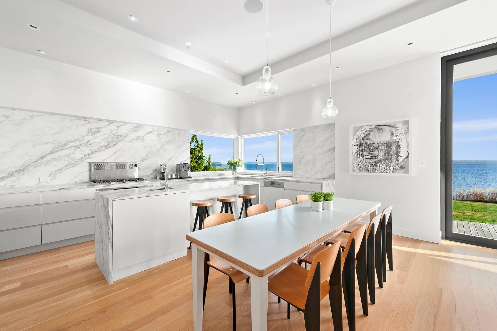 Magnificent panoramic water views are yours in this sleek, sophisticated 6 bedroom, 5.5 bath North Haven contemporary, set amid lush landscaping by American landscape architect Ed Hollander and designed by Leroy Street Studio, repeatedly named by Architectural Digest to its "AD100" Top 100 Architects and Designers list. Walls of glass showcase water views to Sag Harbor Village and marina, with breathtaking sunsets and sunrises. Open living are