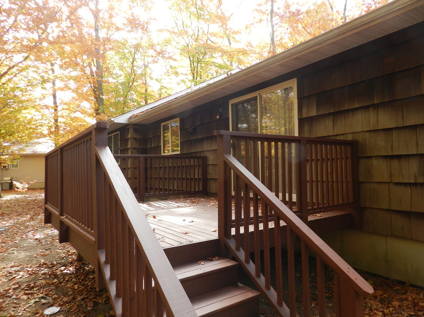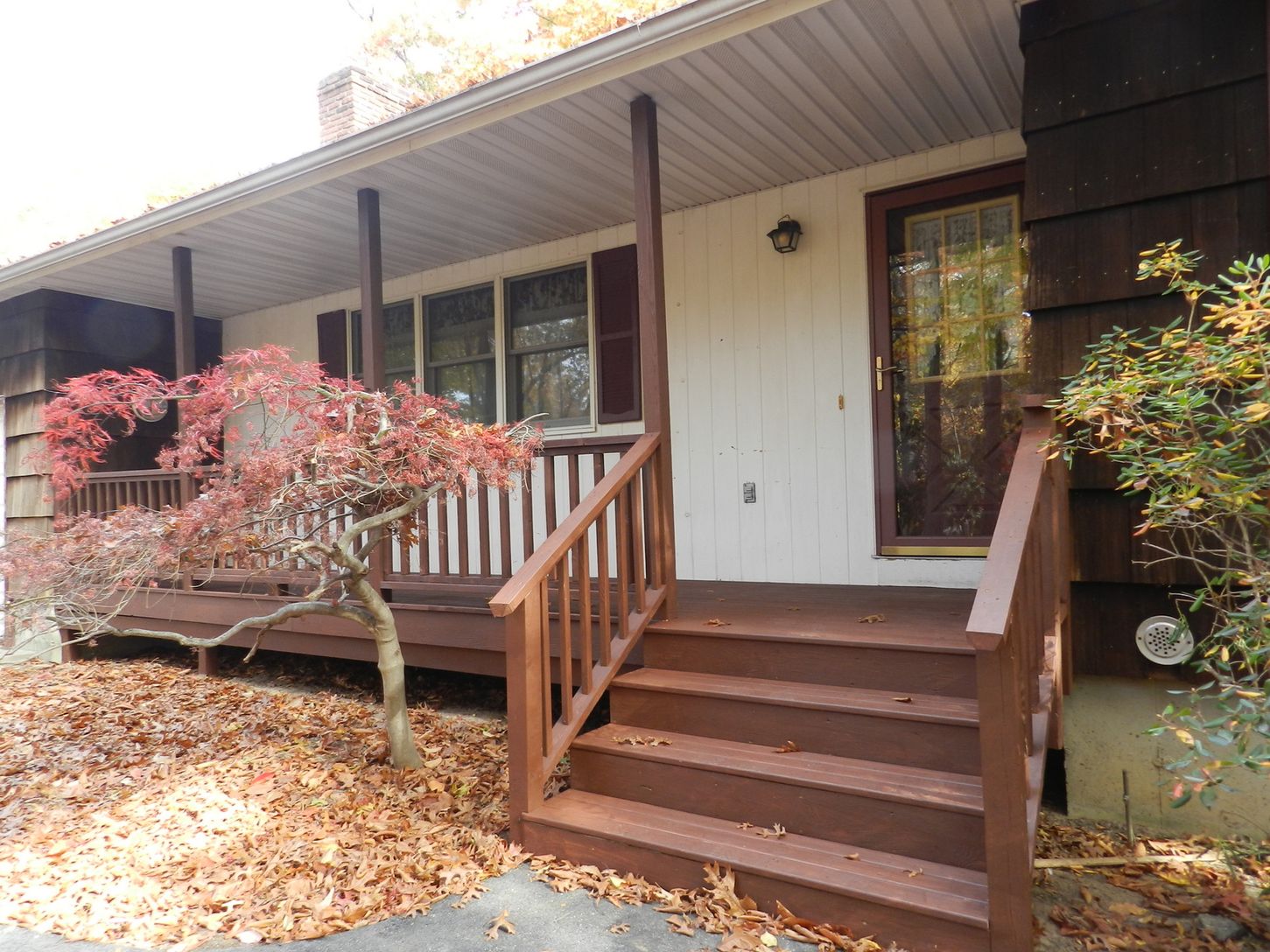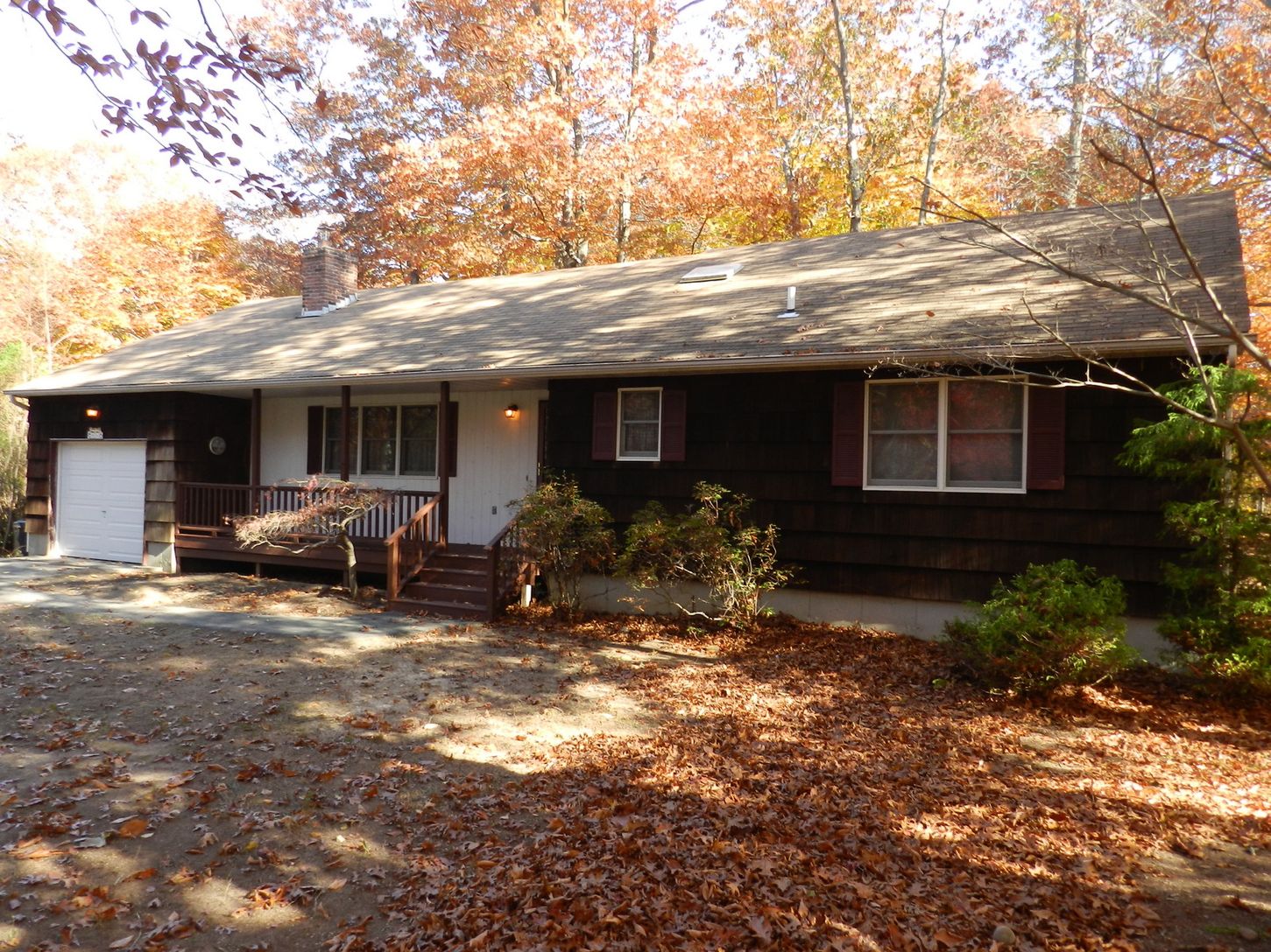 Spacious 1730 square feet, 3 Bedroom, 2 bath Ranch in desirable North Fork Woods, Aquebogue. Cul de sac quiet! Hardwood throughout, handsome brick fireplace with new liner, family style kitchen w/large pantry, high ceiling in full basement with brand new furnace. Large master suite with his & her closets. 2 additional comfortably sized bedrooms and hall bath. Private half acre, new rear deck & 1 car garage.