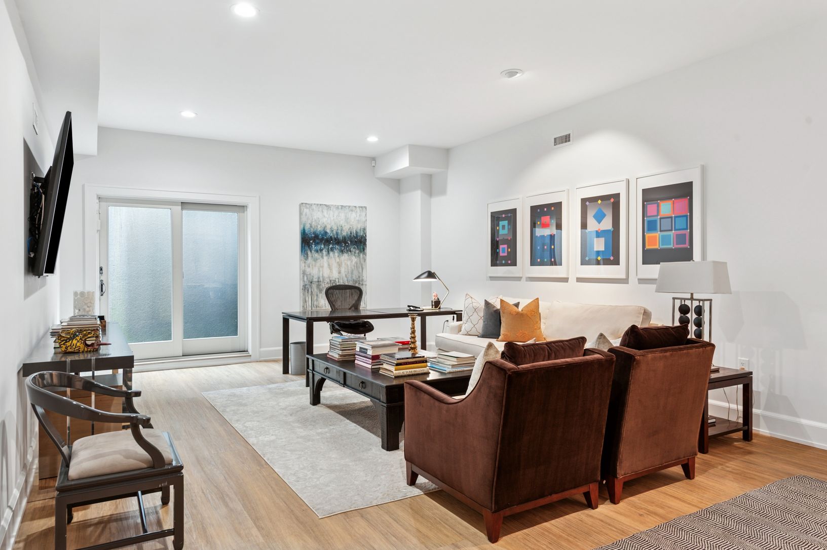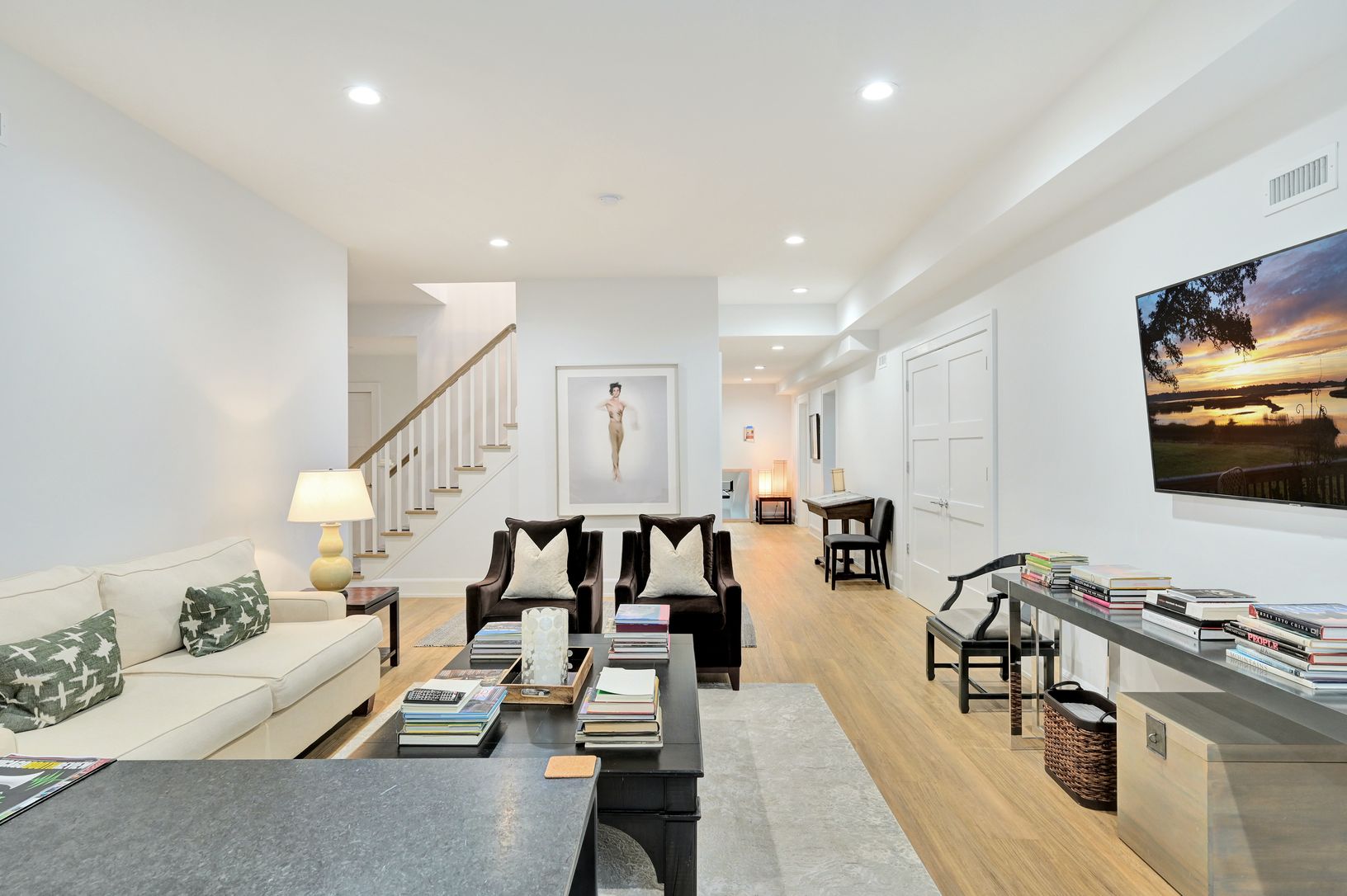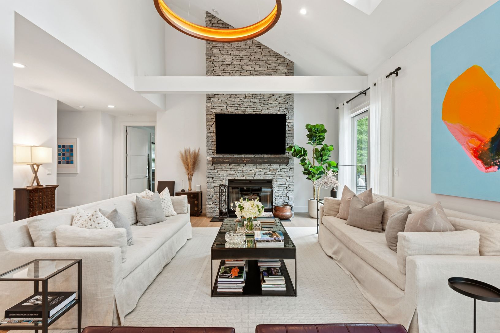 Step through a welcoming foyer into a sun-filled great room where walls of windows frame the lush patio and landscaped lawn. The open-co