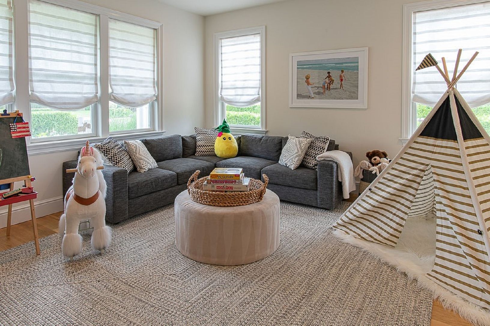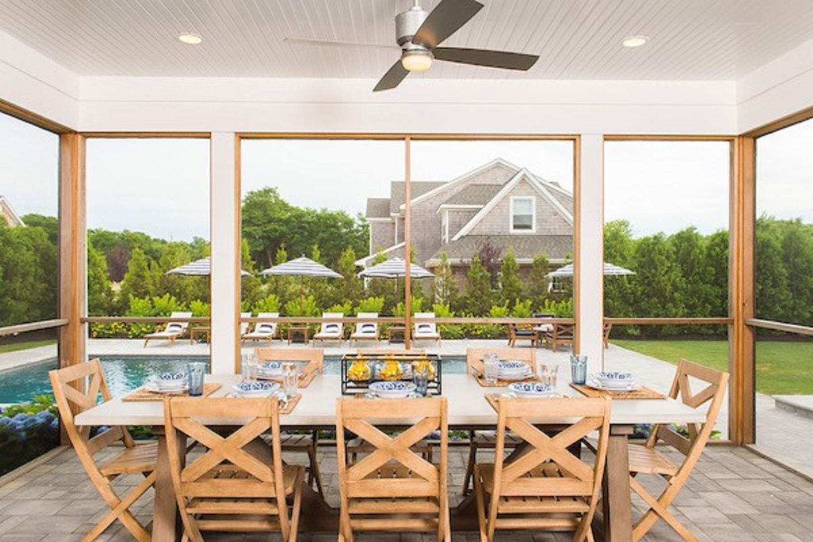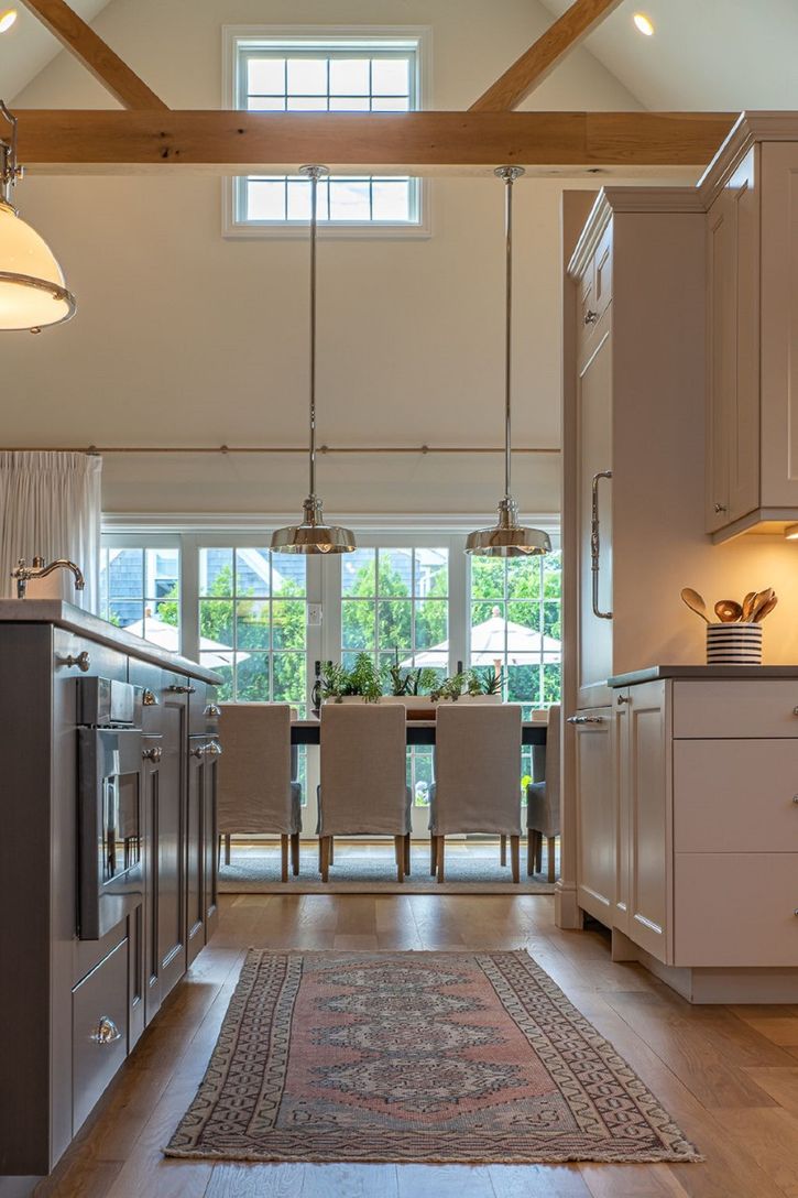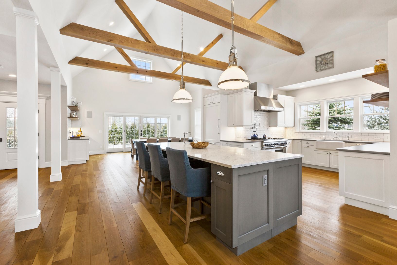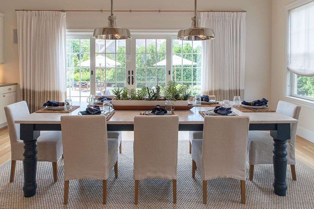 This designer-decorated home with an open floor plan offers light-filled, wide open spaces with lofty ceilings and exposed beams, a dining room, a living room with 75" flat screen TV and fireplace, and an open kitchen with island and counter stools. There is an additional 75" TV in the den/playroom as well as 4 Bedrooms and 3.5 Bathrooms - two of which are en-suite. The house is built for comfortable "outdoor living" with a great summer ambian