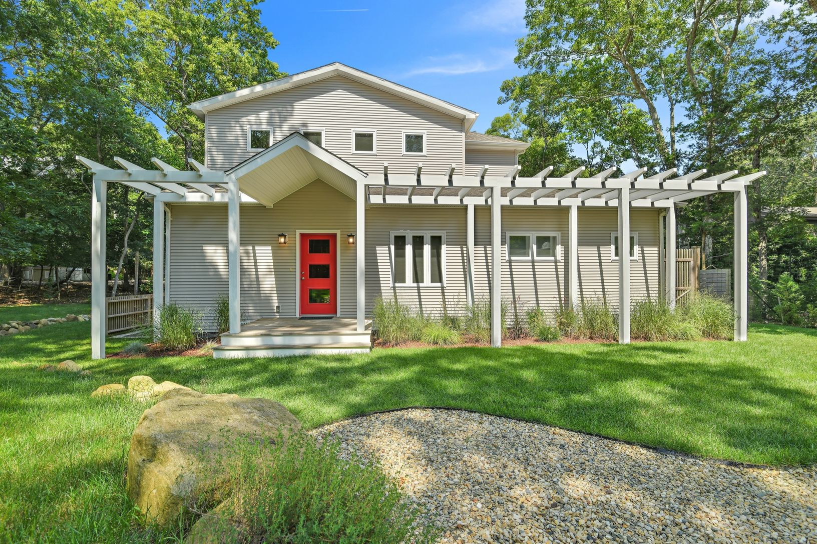 COUNTRY LIVING IN A SEASIDE TOWN has never been so inviting as 28 SYCAMORE DRIVE, EAST HAMPTON, one mile from Gardiners Bay and only minutes to ocean beaches. This recently-built, Open-Plan residence features 1st floor Master AND Jr. Master Suites, each with sliding glass doors privately accessing the verdant, manicured 1/2 acre backyard. 2 additional bedrooms on the 2nd level for a total of 2,400 sq ft, PLUS a full-height Lower Level with f