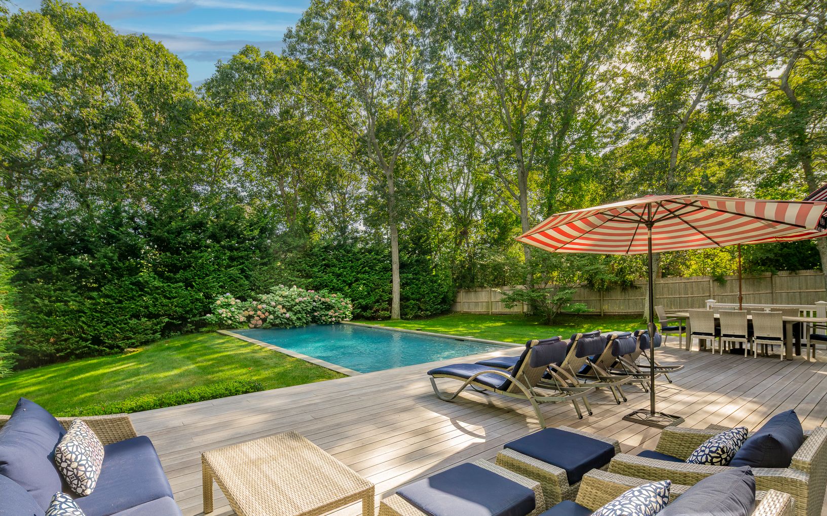 This recently renovated colonial, located between the villages of East Hampton and Amagansett, is now available for rent for the 2024-2025 winter season. Tasteful amenities of the open concept first floor include a spacious kitchen, large dining room, stylish living room and a separate sitting room. There are two generous primary suites upstairs, each with marble baths and one with a Juliet balcony overlooking the garden and pool. There are