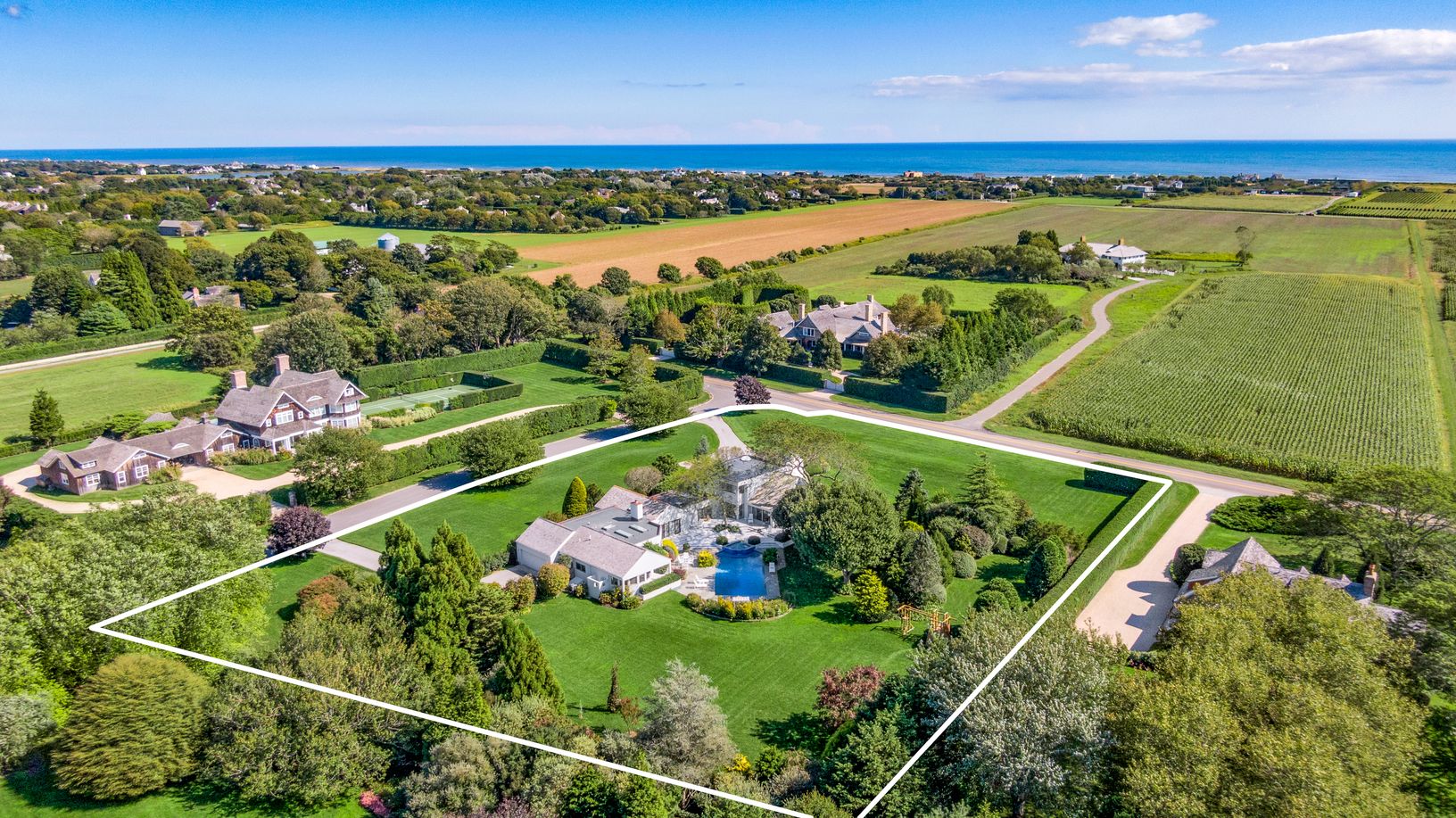 Perfectly sited on 2.3+/- acres with immediate proximity to ocean beaches, this approximately 5,290sf, eight-bedroom, six-bathroom contemporary home offers seamless flow and ocean breezes. The gracious entry leads to the large foyer that gives way to a spacious and sun-filled double-height great room with fireplace and large dining room. The magnificent master suite includes second story ocean views and overlooks agricultural vistas. Enjoy the