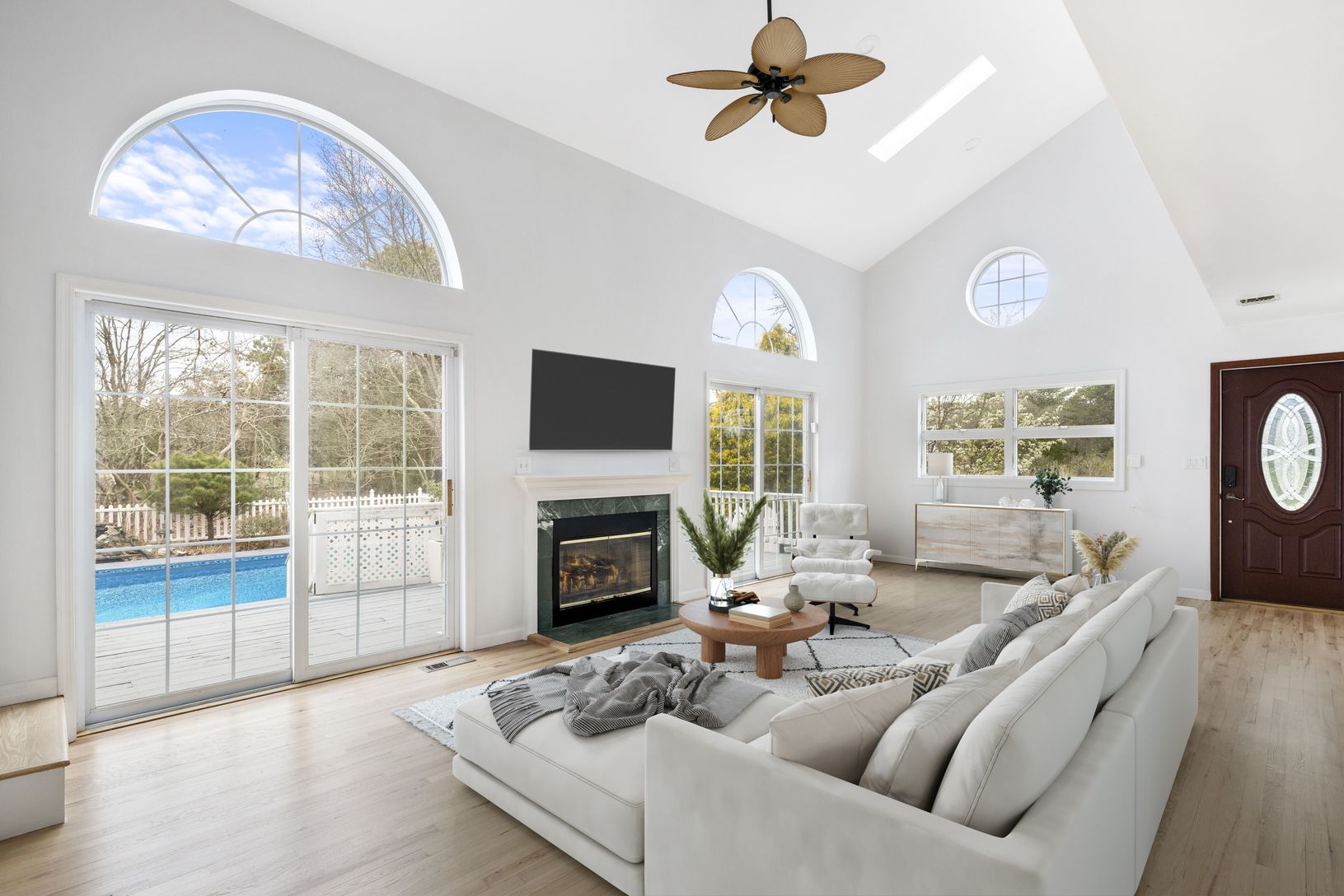 The main level features an open-concept living room with soaring ceilings, a wood-burning fireplace, and sliders that lead to a large deck with steps down to the pool—perfect for outdoor dining, lounging, and poolside ent