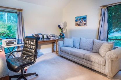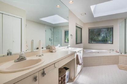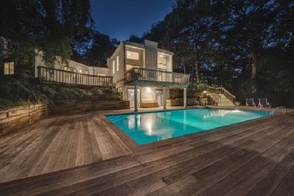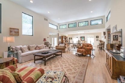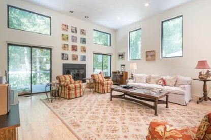 This brand new to the market, one-level contemporary features 2.2+/- well-cared-for acres situated down a quiet, private flag lot driveway. The grounds also feature a heated pool with extensive decking and plenty of room for tennis. The home itself boasts a massive, light-filled living room area with double height ceilings; a finished walk-out lower level artist studio/workshop; four bedrooms, two en-suite plus two additional bedrooms and bat