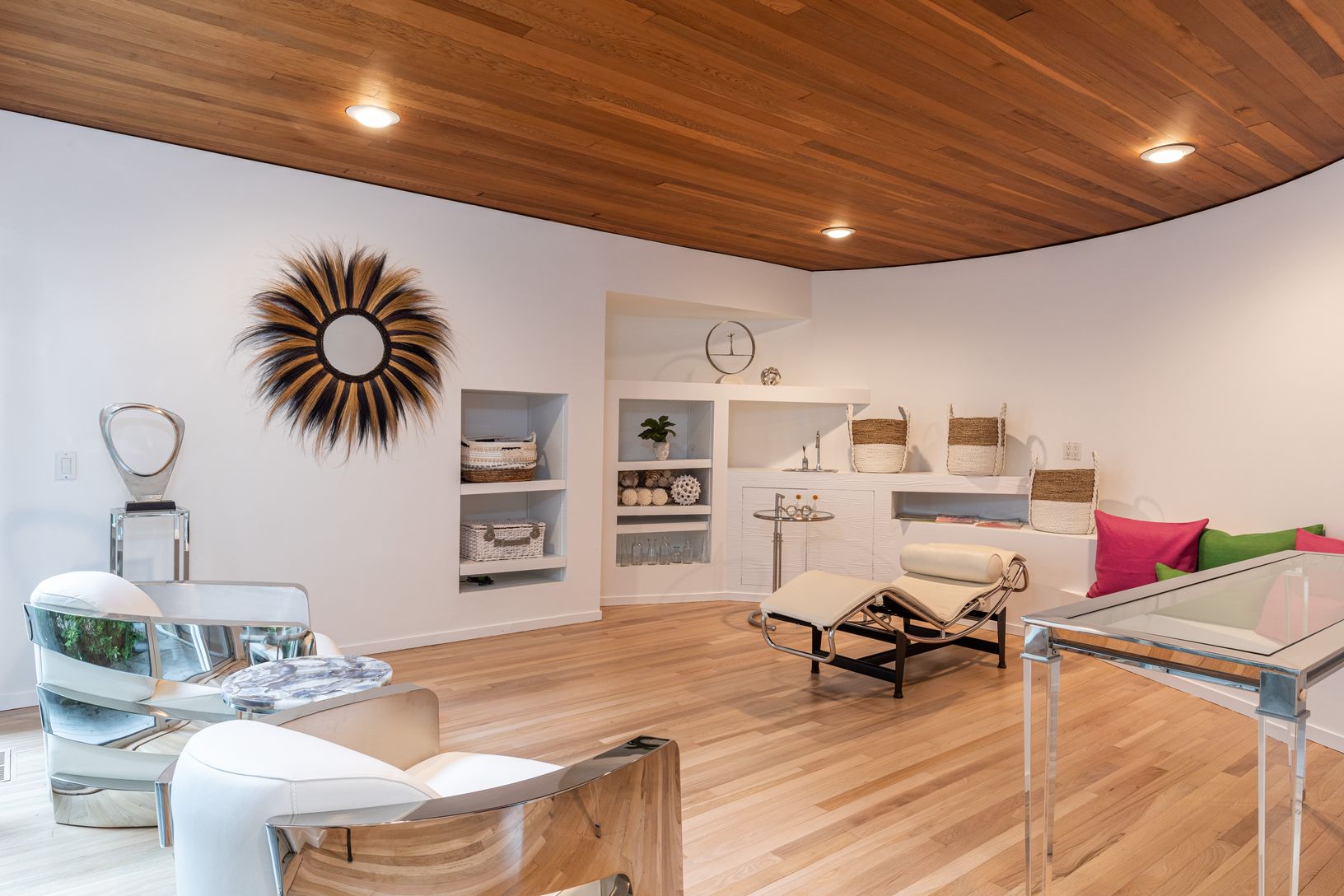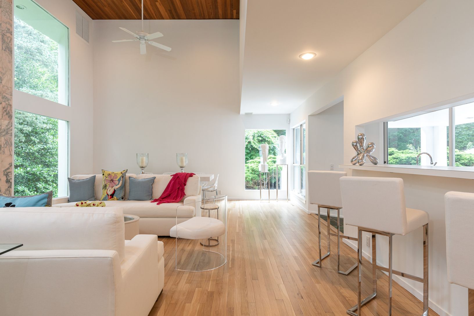 A Contemporary 1986 Masterpiece by famed architect, David Markolf, renown for creating beautiful interior (2,593 sq ft) and exterior (650 plus sf decking) spaces amidst stunning shapes and angles. Soaring cedar plank ce