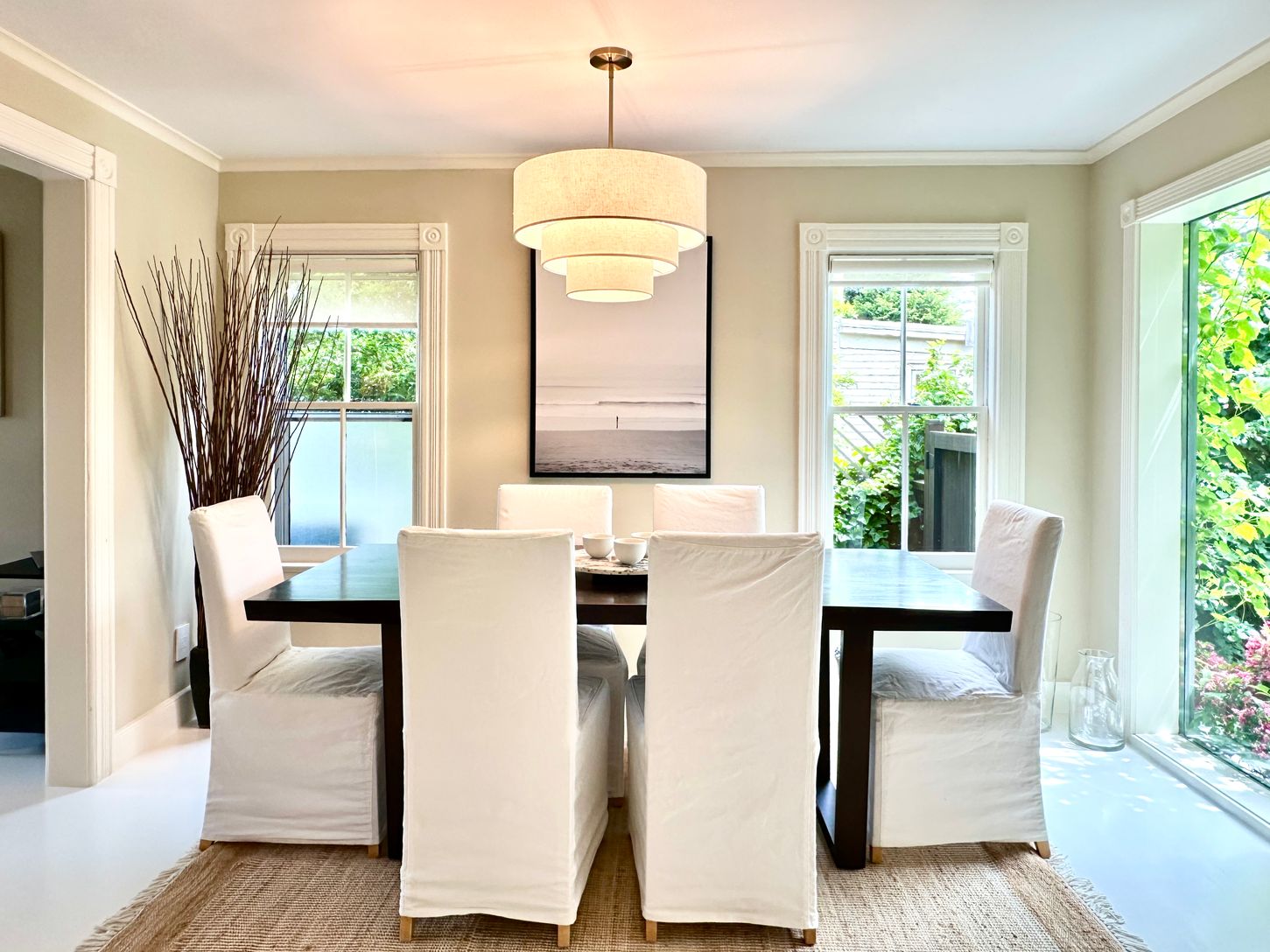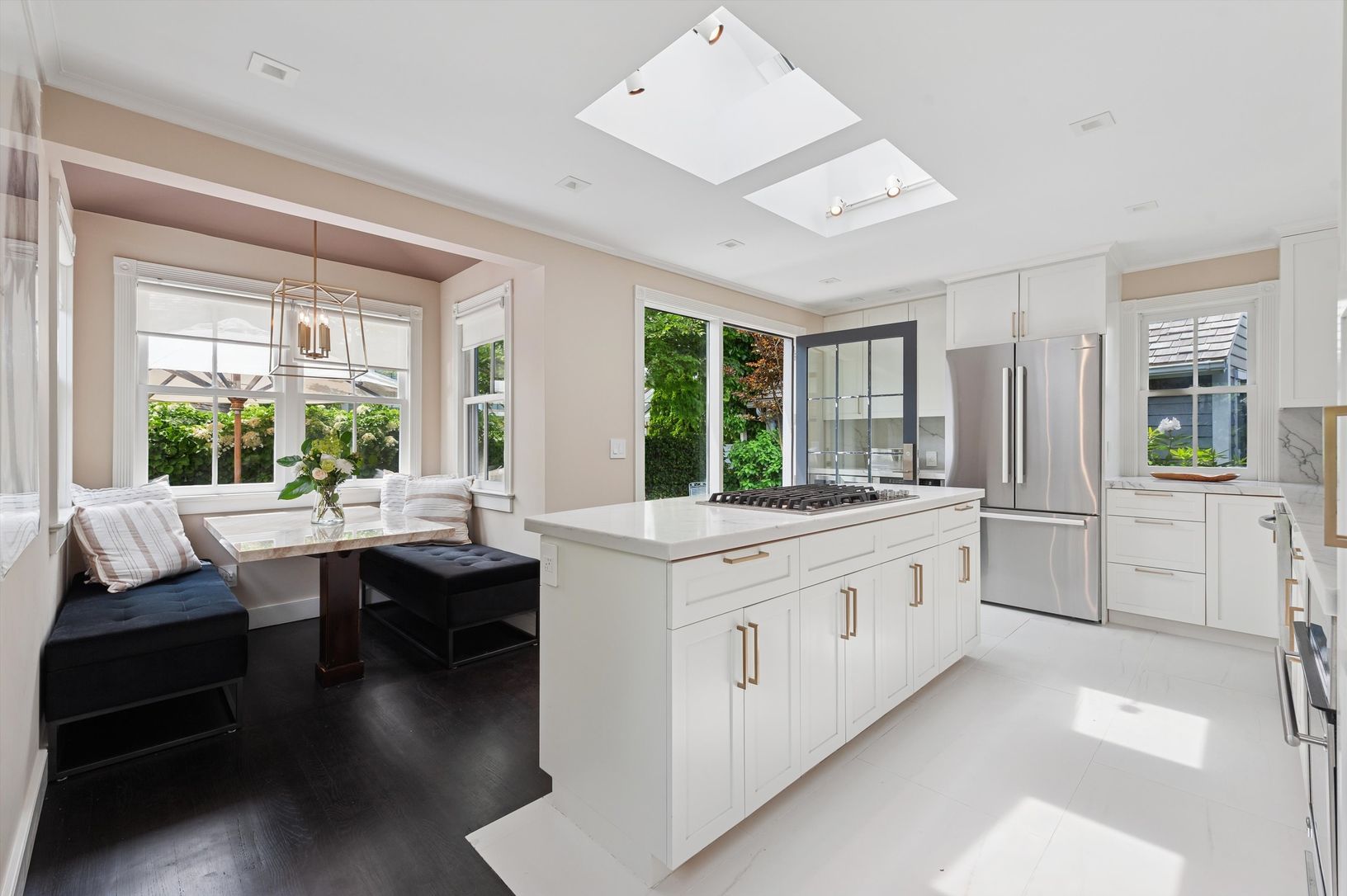 Just minutes from Sag Harbor Village Shops and around the corner from Harbor Market, this 3-bed, 4.5-bath 19th-century cottage pairs classic character with thoughtful modern upgrades. The cozy living room with wood-burning fireplace, has a flow-through dining room to the sunny eat-in kitchen now enhanced with new appliances, countertops, lighting, freshly painted cabinets, and new fenestrations. Also on this floor, features include a tranquil