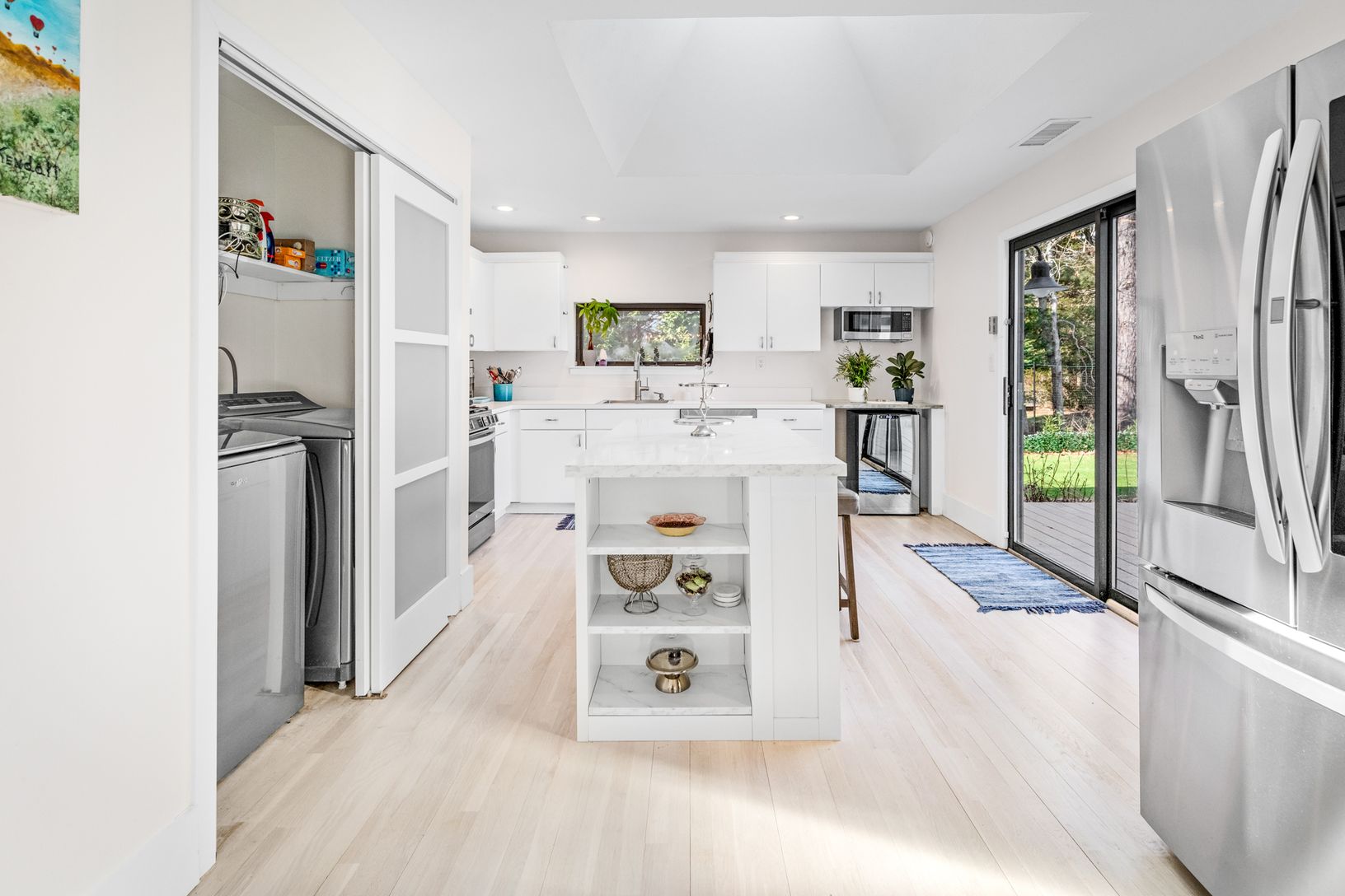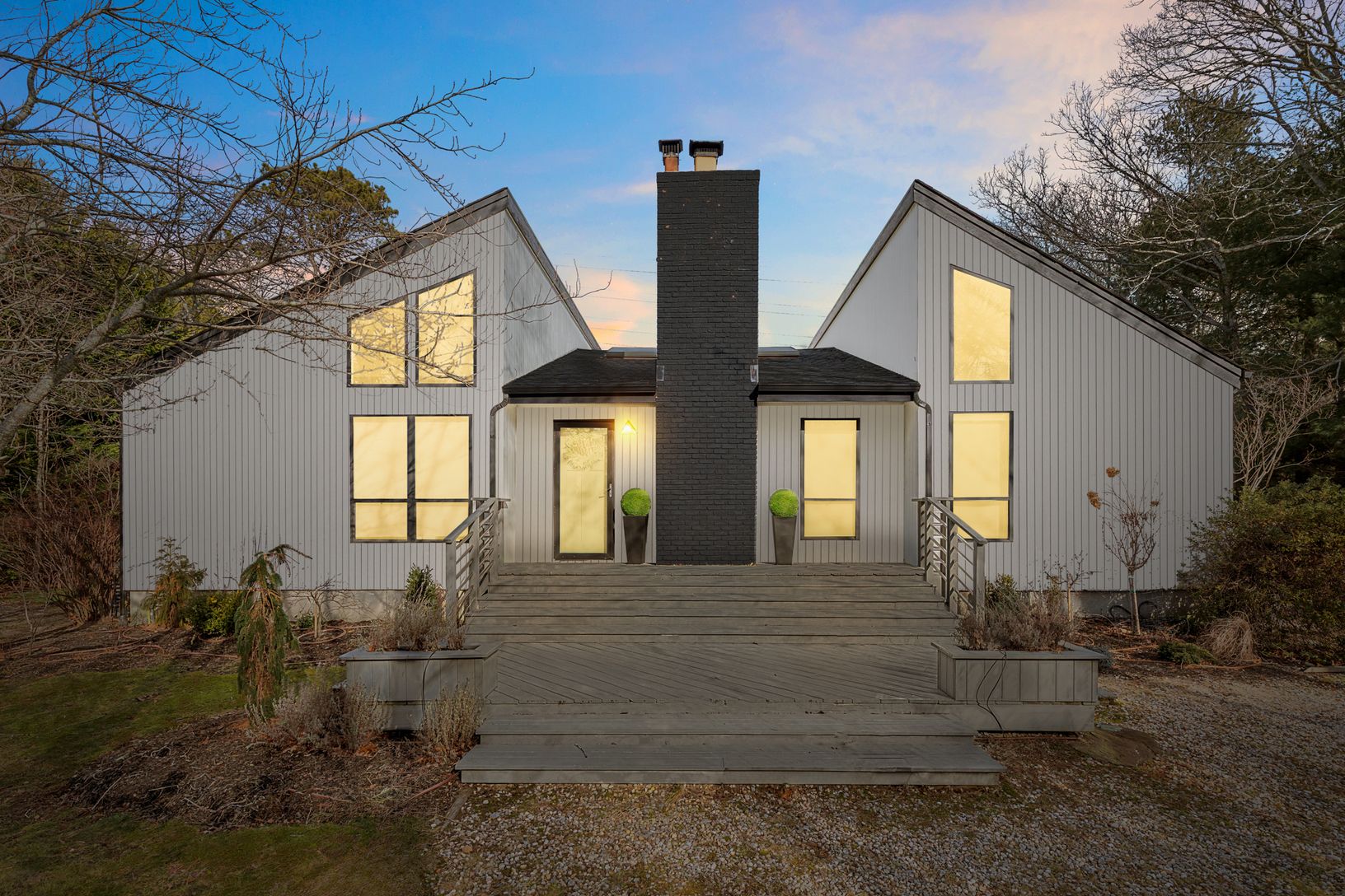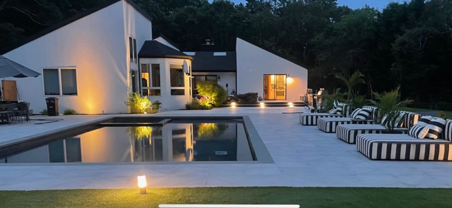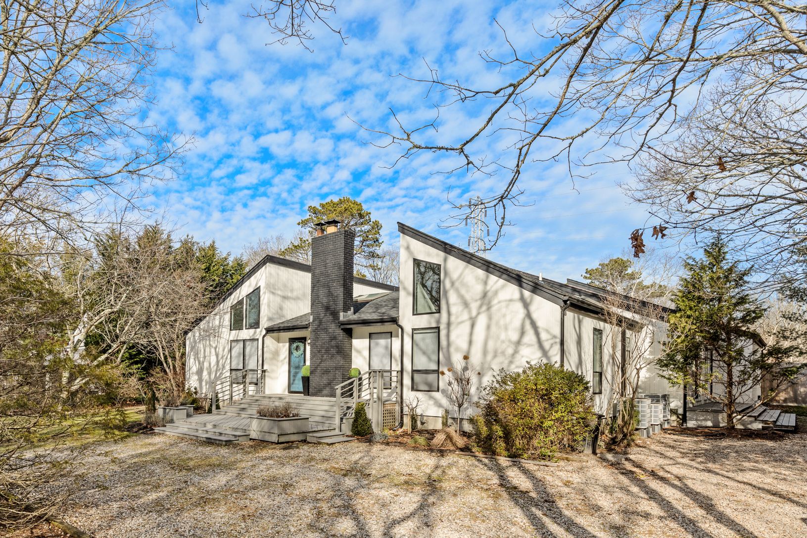 Tucked away on a quiet cul-de-sac in East Hampton's Village Fringe, this contemporary retreat offers exceptional privacy in the heart of the Hamptons. Recently refreshed, the home feels calm and modern, designed as a true sanctuary. Inside, you'll find five bedrooms, three bathrooms, a den, and a great room, all on one floor. The chef's kitchen is both stylish and highly functional, anchoring an open layout with soaring ceilings and skylights