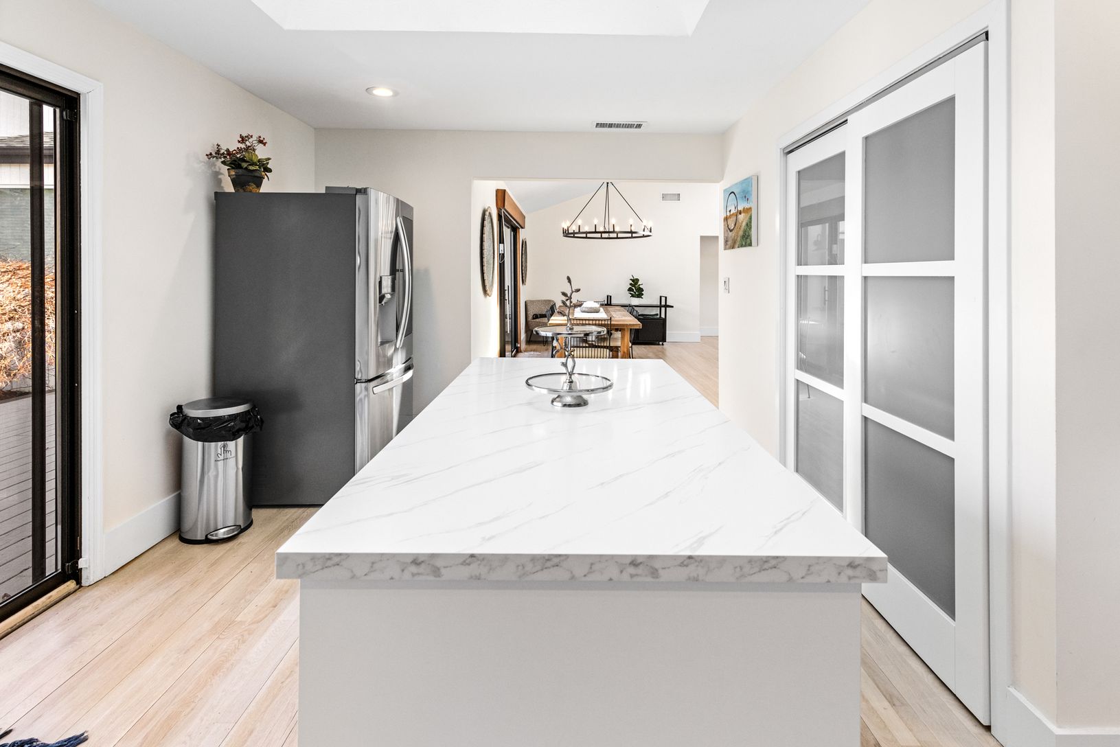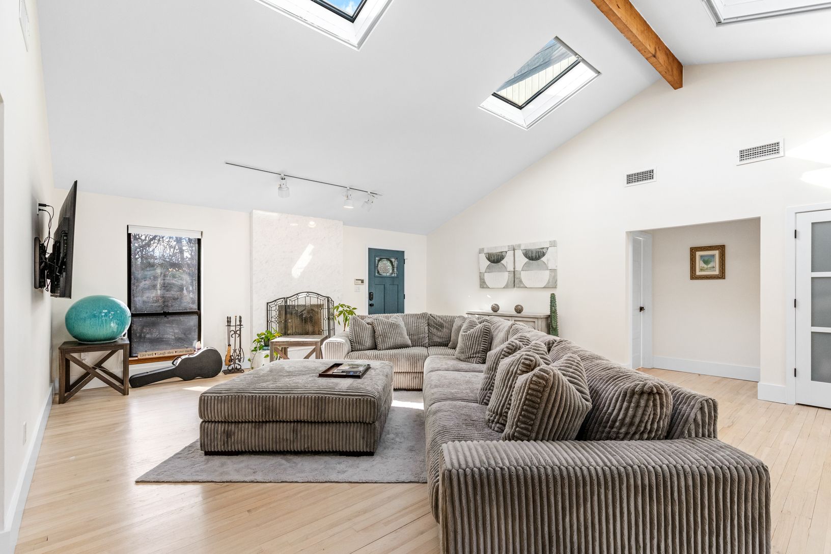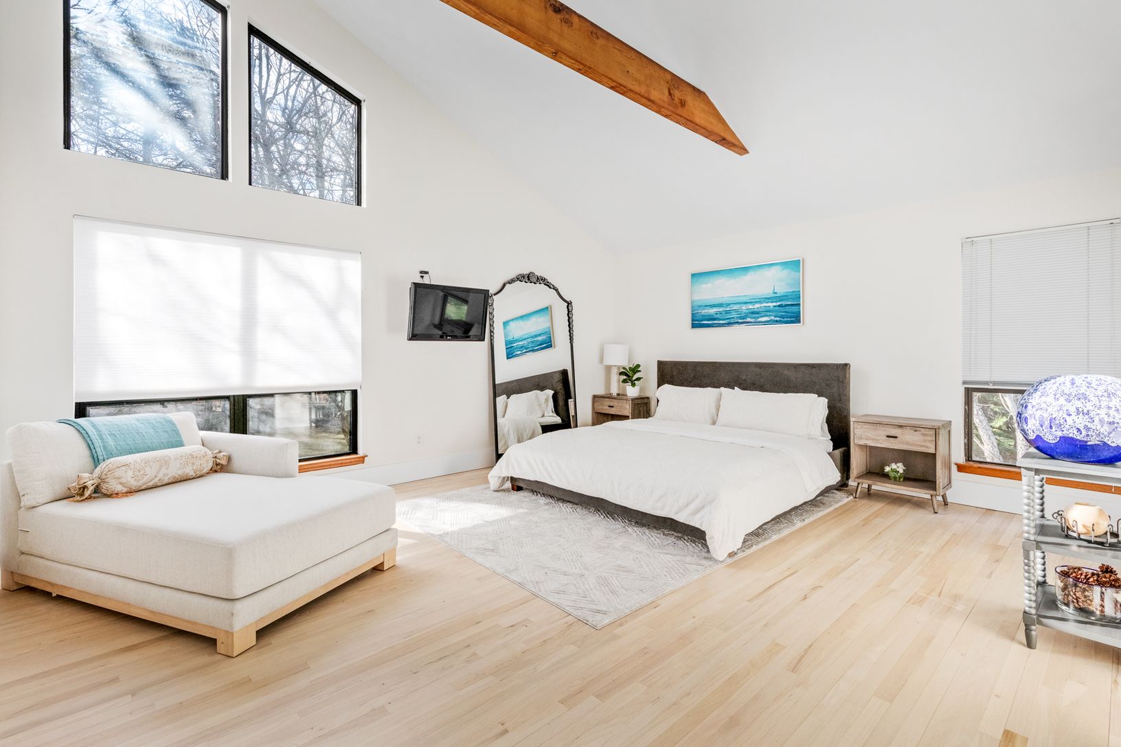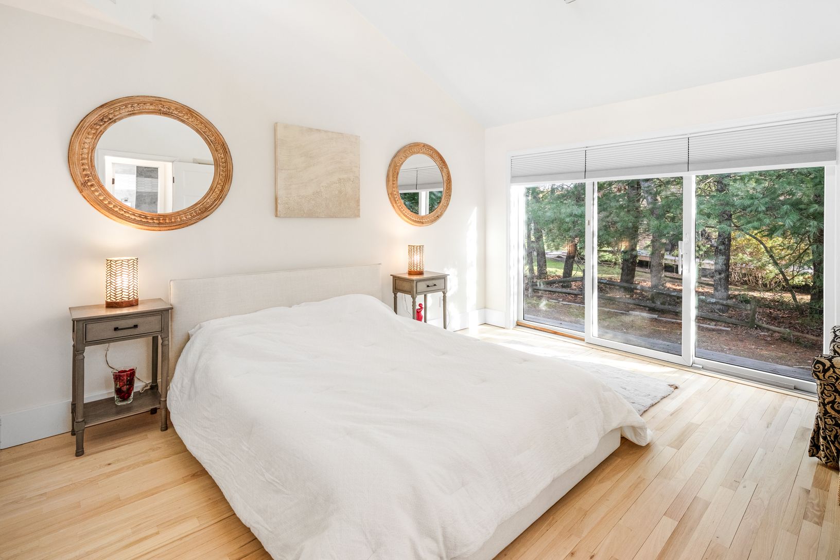 Tucked away on a quiet cul-de-sac in East Hampton's Village Fringe, this contemporary retreat offers exceptional privacy in the heart of the Hamptons. Recently refreshed, the home feels calm and modern, designed as a true sanctuary. Inside, you'll find five bedrooms, three bathrooms, a den, and a great room, all on one floor. The chef's kitchen is both stylish and highly functional, anchoring an open layout with soaring ceilings and skylights