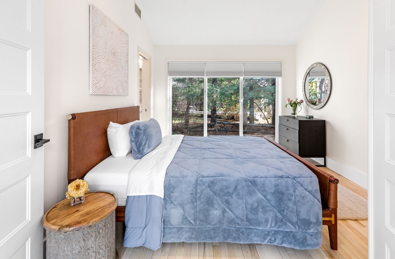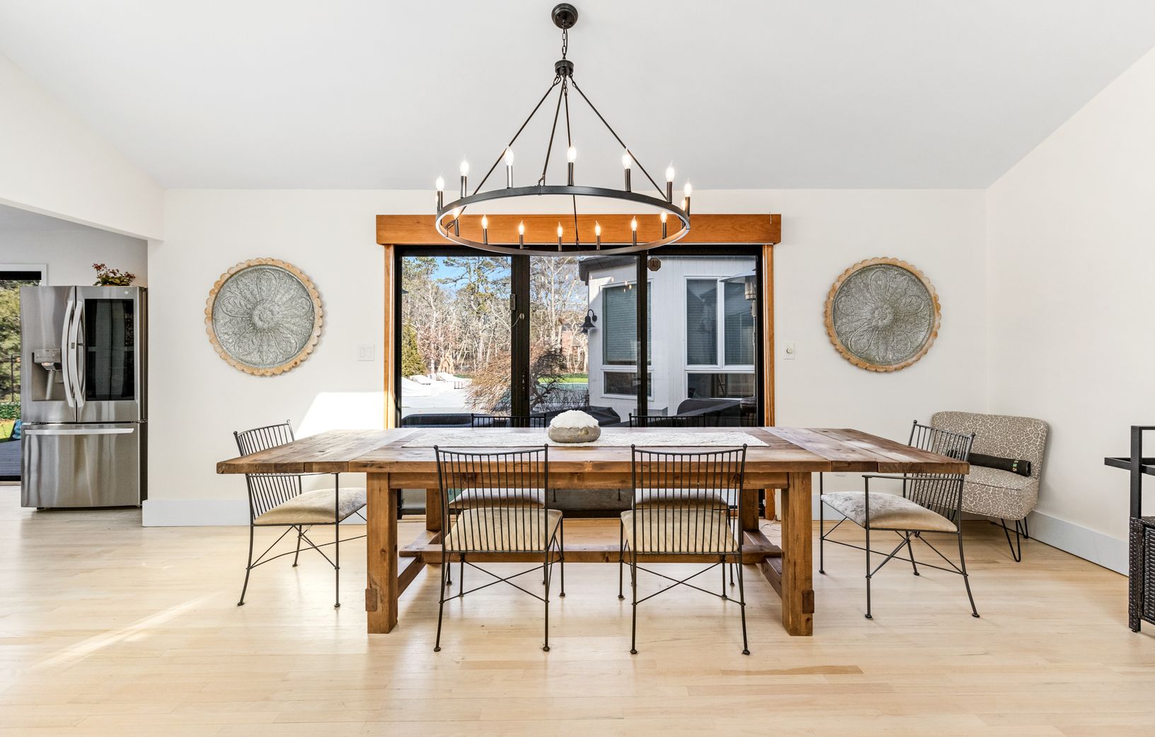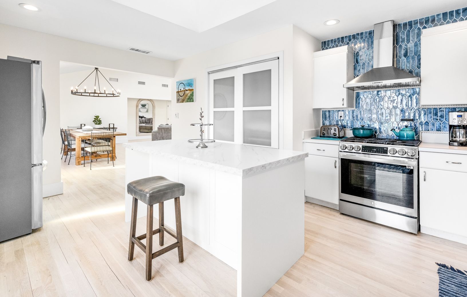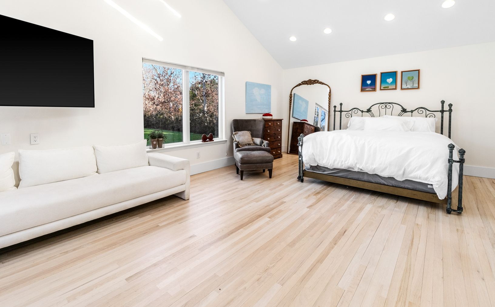 Tucked away on a quiet cul-de-sac in East Hampton's Village Fringe, this contemporary retreat offers exceptional privacy in the heart of the Hamptons. Recently refreshed, the home feels calm and modern, designed as a true sanctuary. Inside, you'll find five bedrooms, three bathrooms, a den, and a great room, all on one floor. The chef's kitchen is both stylish and highly functional, anchoring an open layout with soaring ceilings and skylights