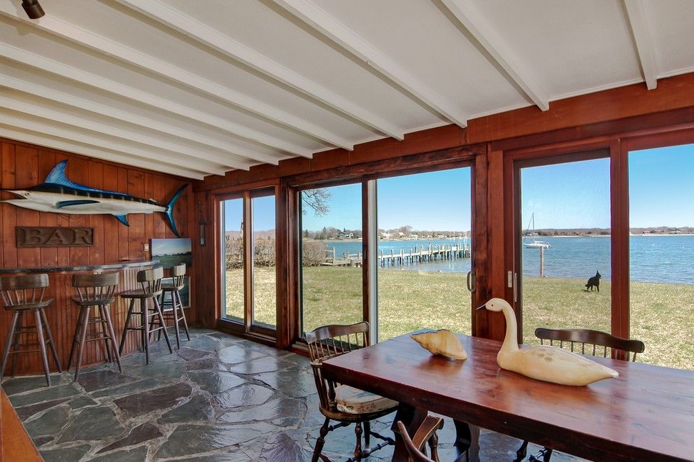 This adorable 4 bedroom cottage is located right on West Neck Harbor. Multiple sliding glass doors lead out to the rear yard with 100 feet of bulkheaded property. There is also a Gunite pool located on the waters edge with a blue stone surround. Along side the pool is a spiral staircase that leads to a 2nd floor deck overlooking the water to enjoy evening cocktails or coffee in the morning to watch the sunrise. The large living room with b