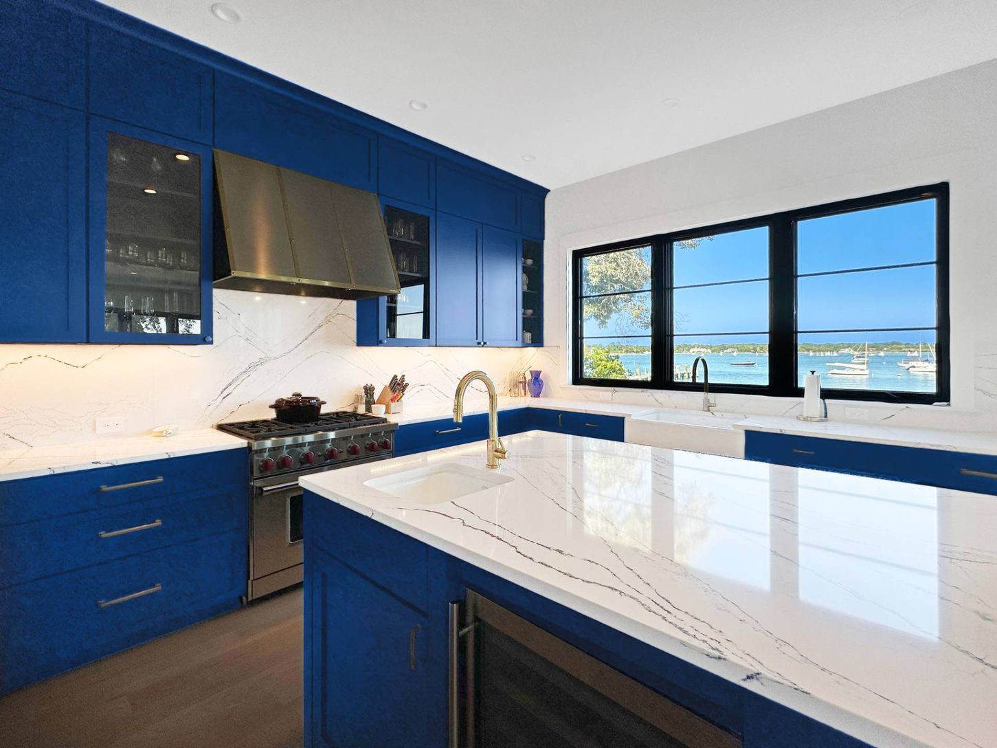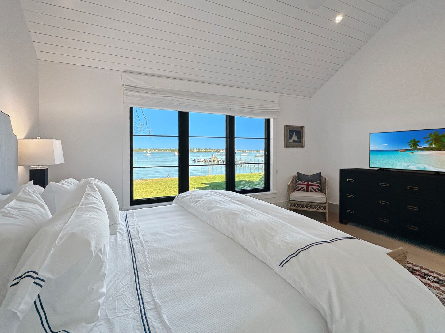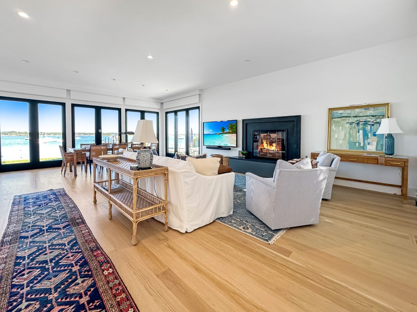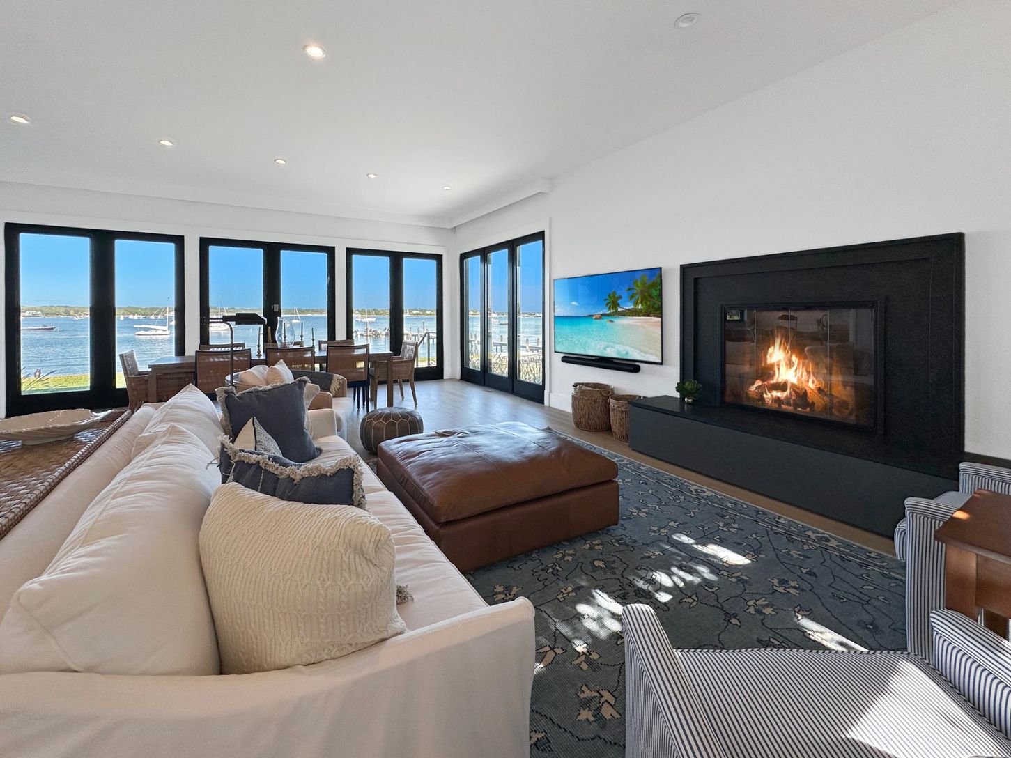 Built in 2022, this contemporary residence on West Neck Harbor reflects a Scandinavian sensibility, with light-toned wood floors, a standing seam metal roof, expansive windows framing panoramic water views, and understated yet refined detailing throughout. The entry foyer, fitted with window panes that draw in natural light, offers space for seating and consoles, setting a welcoming tone. From here, the open-plan design reveals harbor views fr