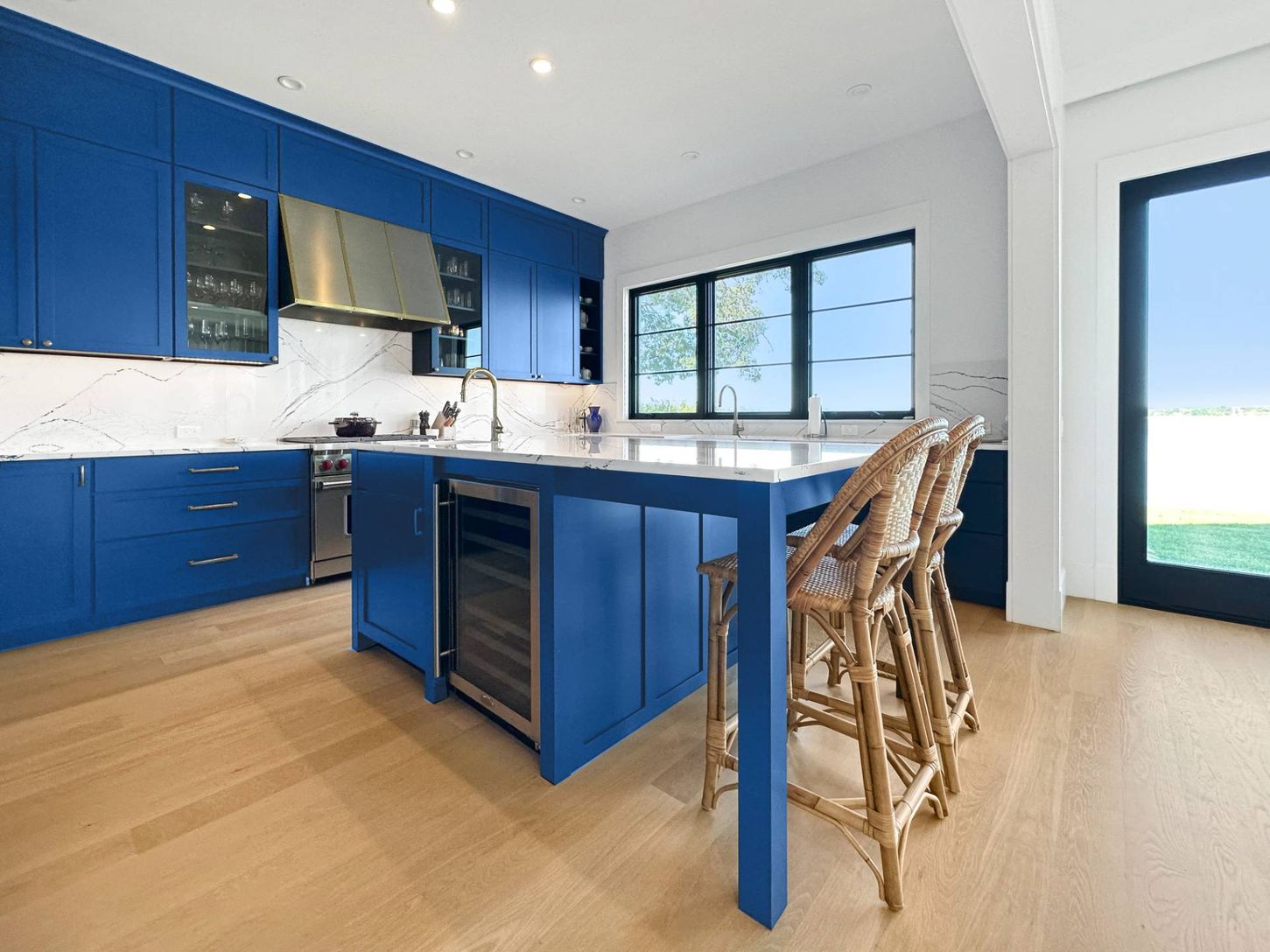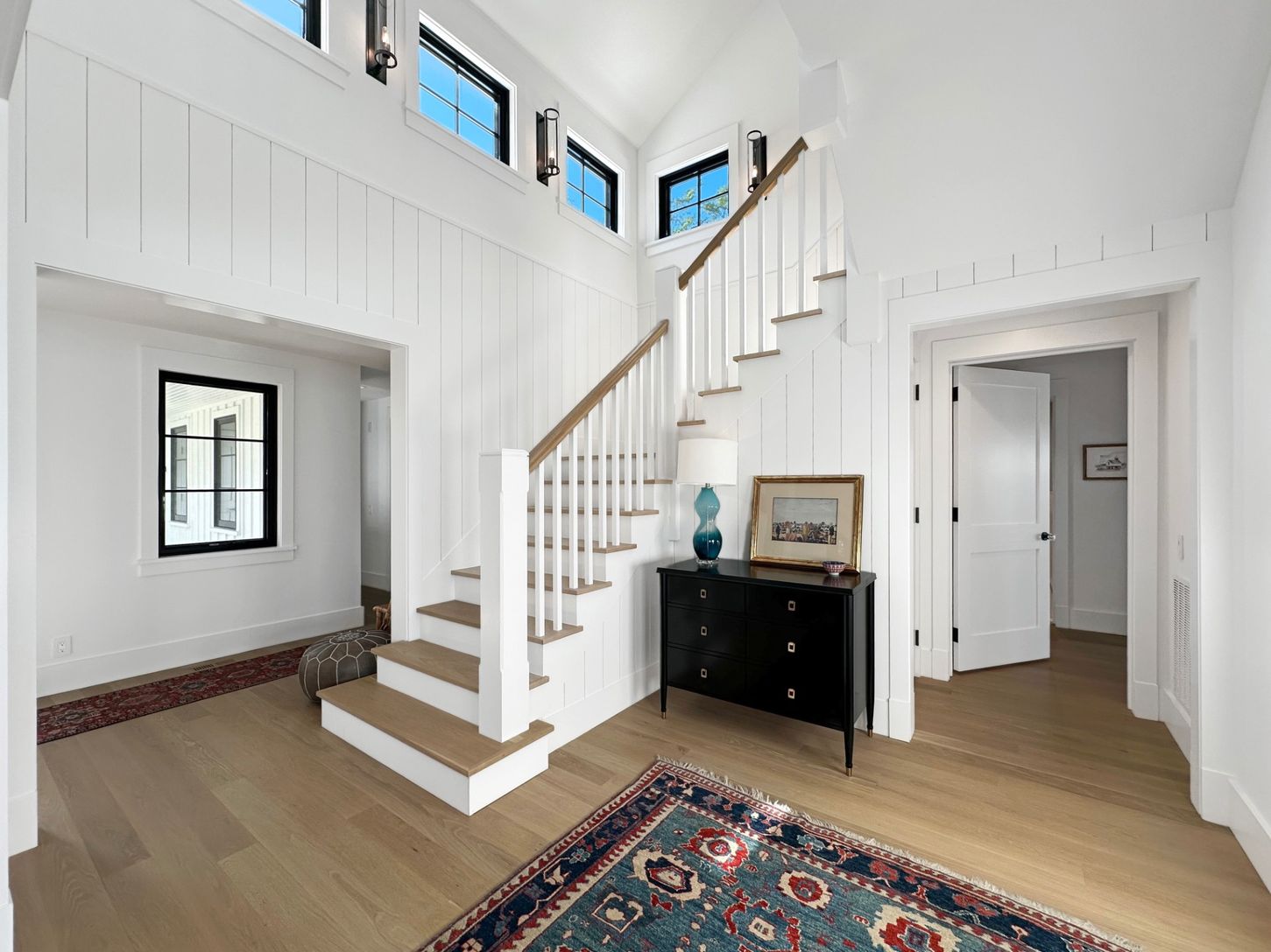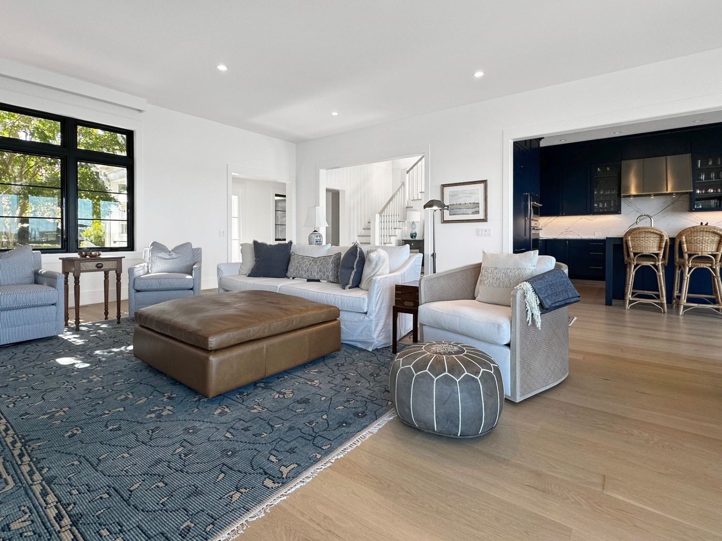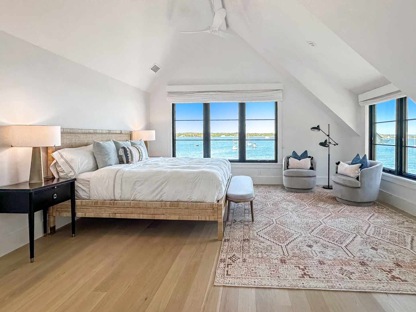 Built in 2022, this contemporary residence on West Neck Harbor reflects a Scandinavian sensibility, with light-toned wood floors, a standing seam metal roof, expansive windows framing panoramic water views, and understated yet refined detailing throughout. The entry foyer, fitted with window panes that draw in natural light, offers space for seating and consoles, setting a welcoming tone. From here, the open-plan design reveals harbor views fr