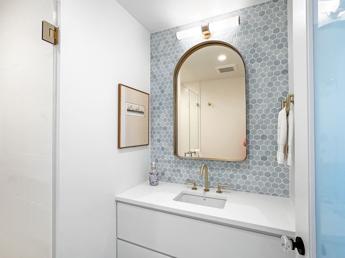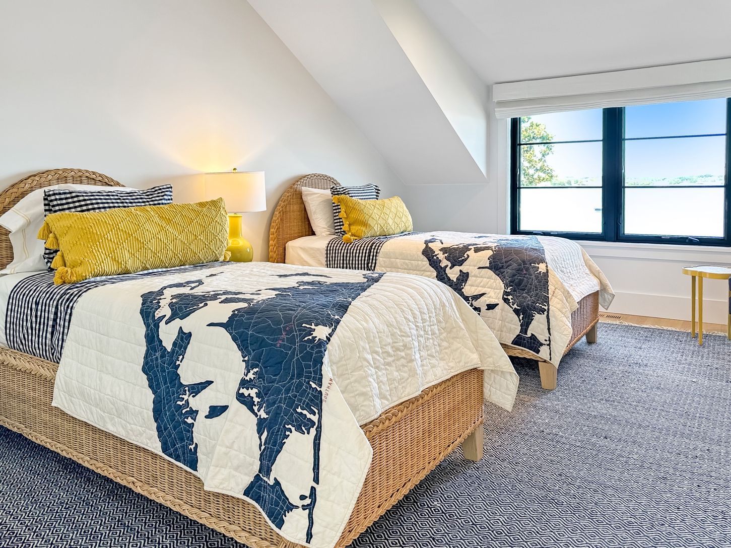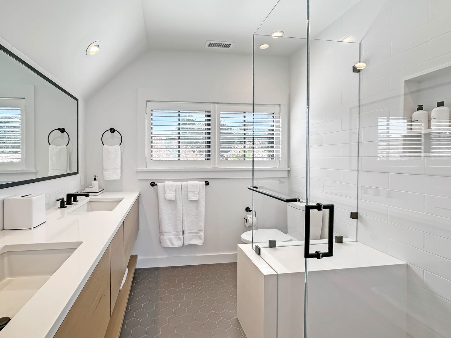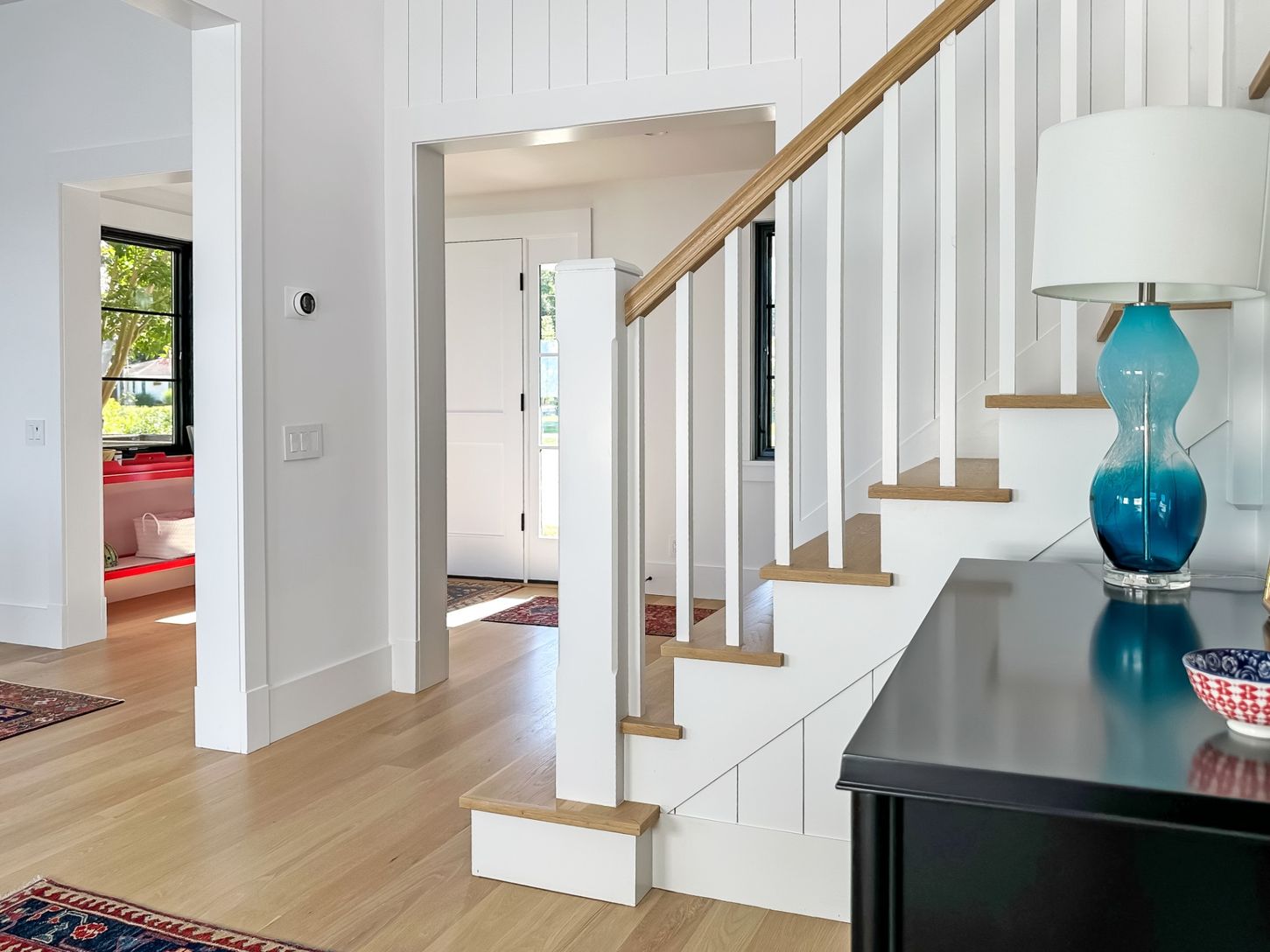 Built in 2022, this contemporary residence on West Neck Harbor reflects a Scandinavian sensibility, with light-toned wood floors, a standing seam metal roof, expansive windows framing panoramic water views, and understated yet refined detailing throughout. The entry foyer, fitted with window panes that draw in natural light, offers space for seating and consoles, setting a welcoming tone. From here, the open-plan design reveals harbor views fr