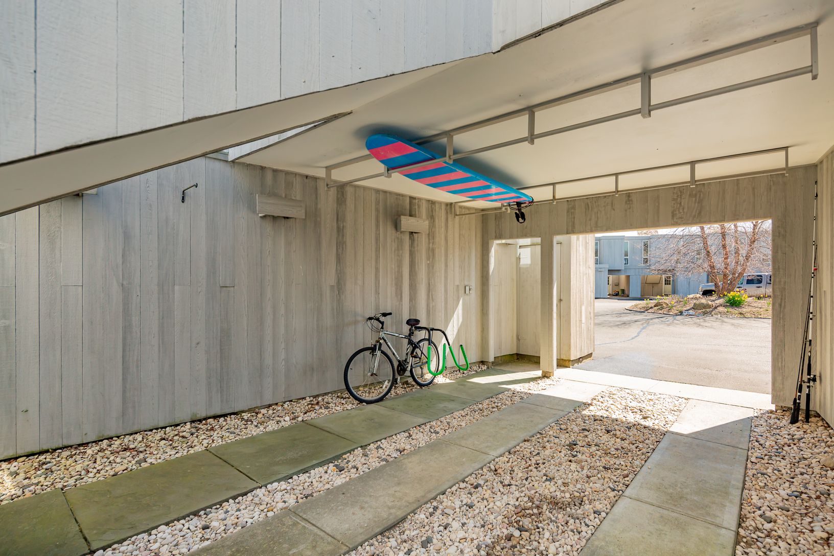 Beautiful and spacious condo is located on Montauk Downs Golf Course, and is a 5-minute bike ride to Ditch Plains and to town. Private carport area includes surf board racks and space for bike storage. The condo is multi level. It has two primary suites with queen-sized beds, and a third bunk room with a trundle and convertible sofa. The main level has living dining and kitchen, with a charming patio with grill.