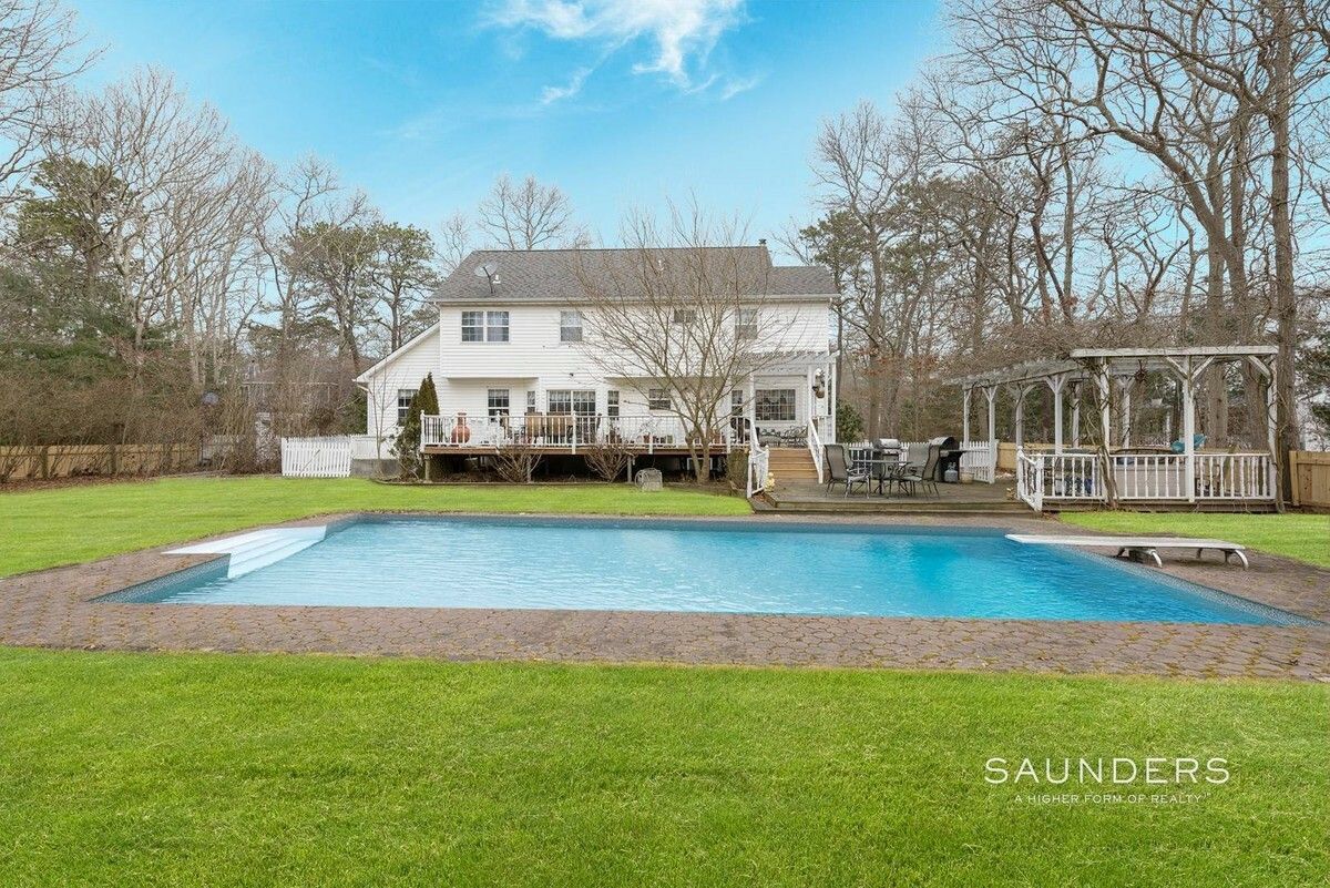 Located in the Greater Westhampton Beach area, at the end of a quiet cul-de-sac on a well manicured full acre, sits a five bedroom, three and one half-bath colonial styled home. Recently renovated, this welcoming home offers an updated kitchen with granite countertops and stainless-steel appliances, hardwood flooring throughout, and updated bathrooms. Other features include a large in-ground pool, multi-level decking, two car garage, finished