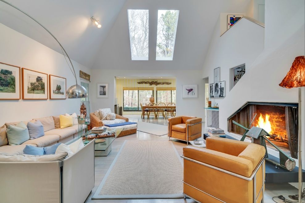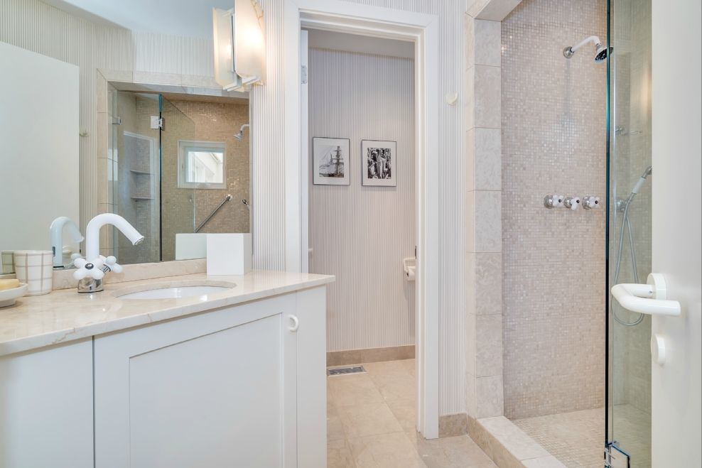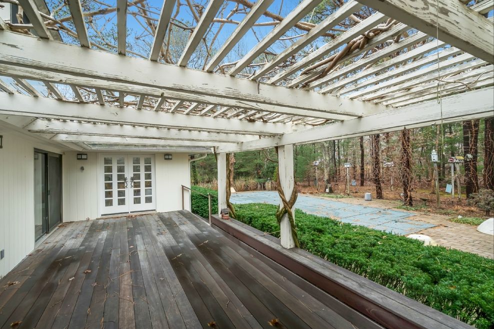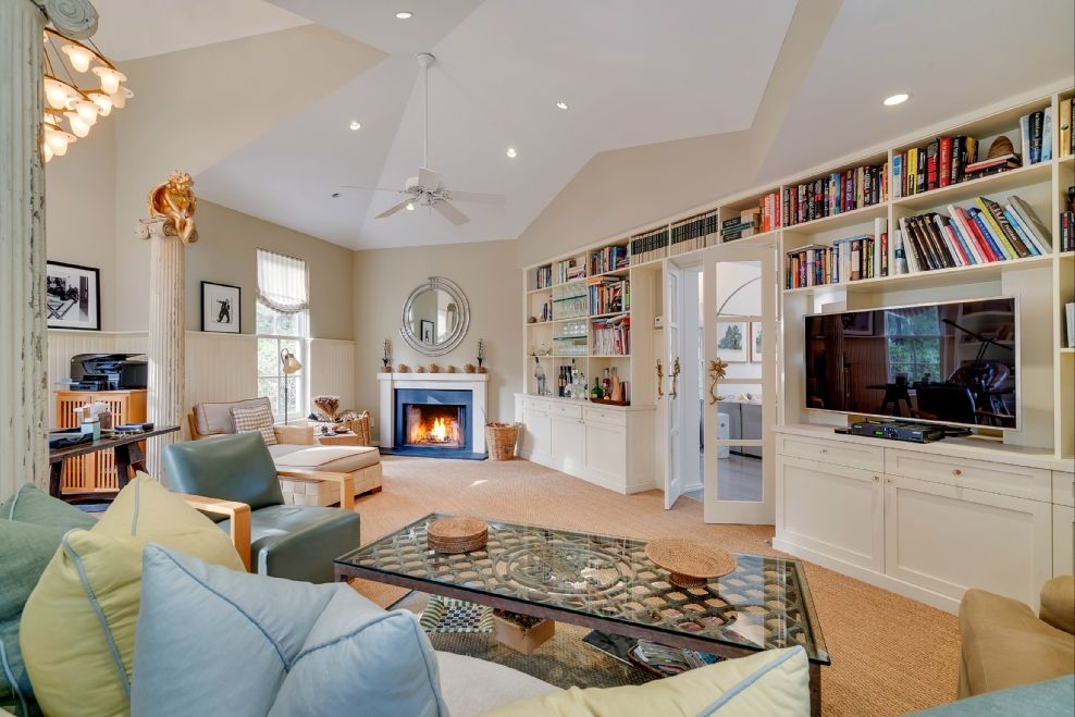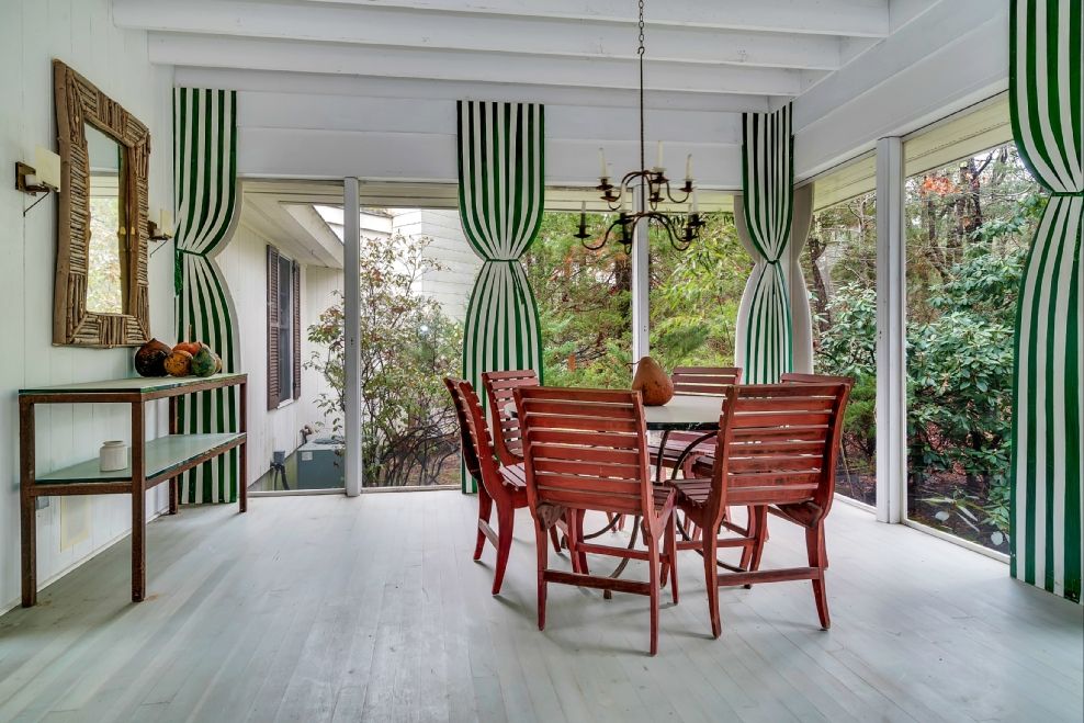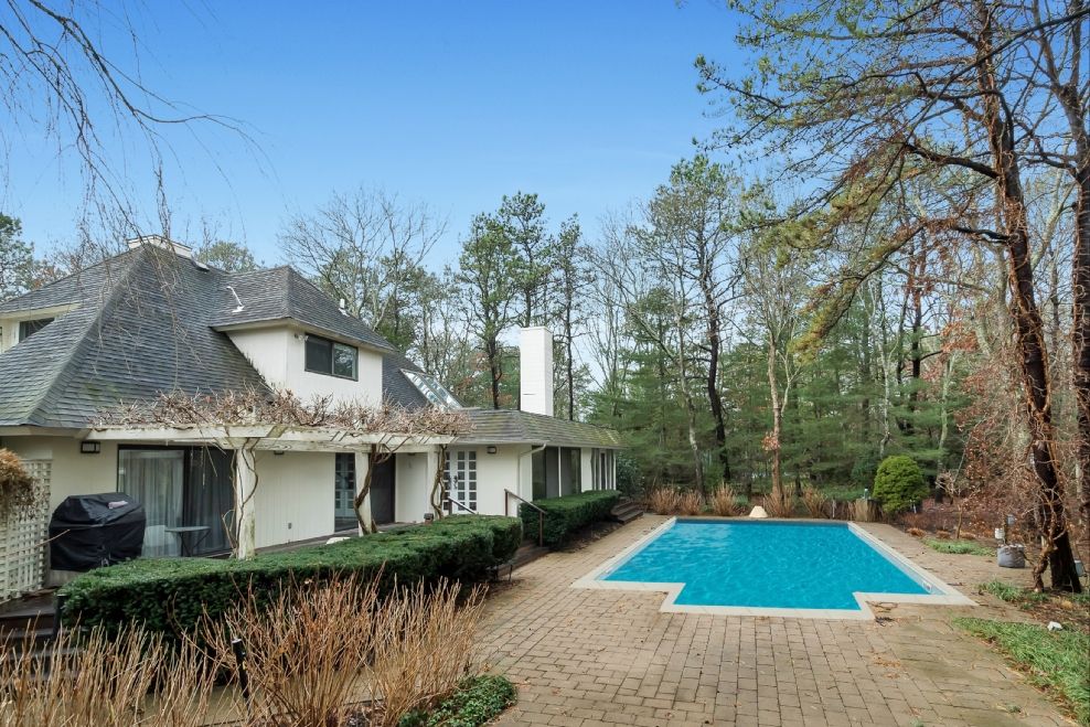A beautiful driveway and manicured private courtyard set the tone when entering this stunning south of the highway Wainscott residence. This NYC interior designer's own home reflects sophistication and a high level of quality and taste. The house features four bedrooms, 3.5 baths, a living room, formal dining room, a library, three fireplaces, a kitchen with pantry, a three-season screened porch, limestone entry, heated pool and outdoor pergol