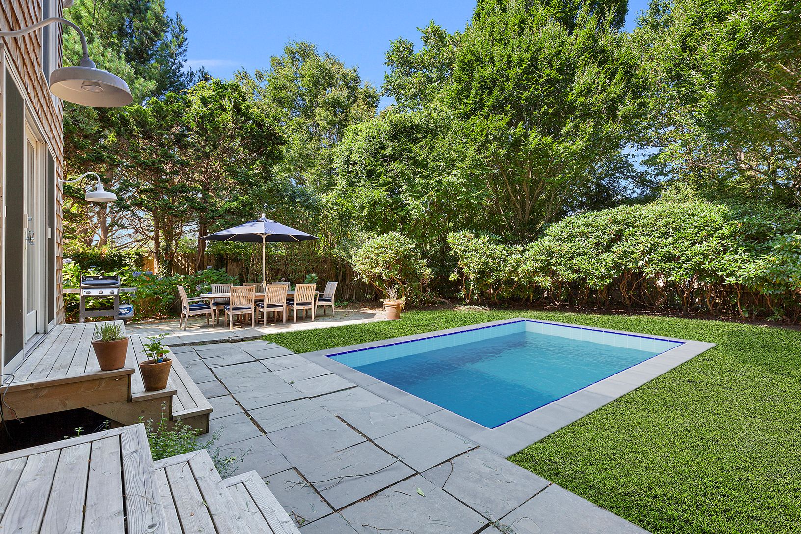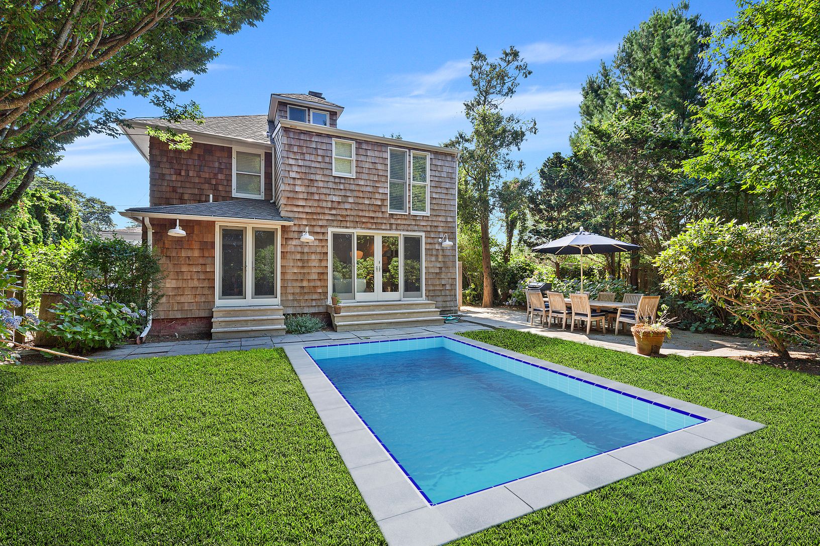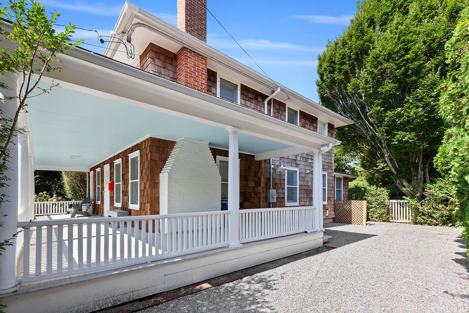 Charming East Hampton Village traditional in a convenient central location. Covered porch behind privet hedges opening up to lovely landscaping with bluestone patios in the rear yard with pool permit in place. First floor with large living room with fireplace. Granite kitchen counters with stainless steel appliances, ice maker, and warming tray plus kitchen sitting area with dining space. First floor has a ½ bath near central living area