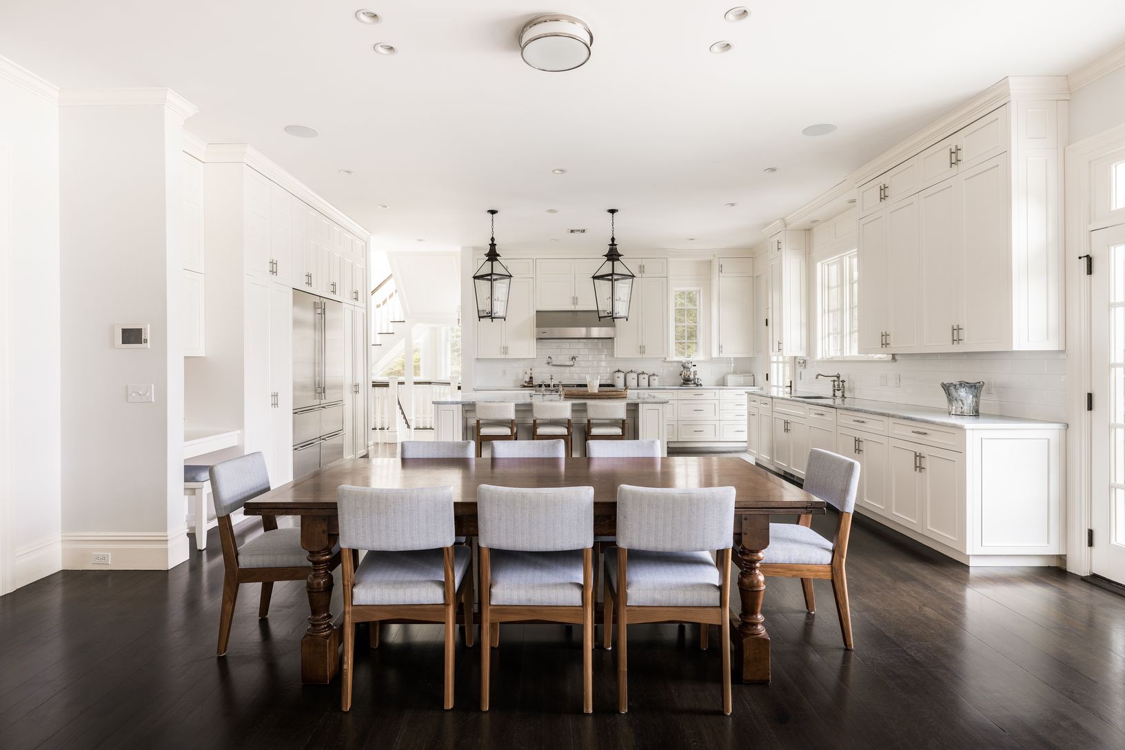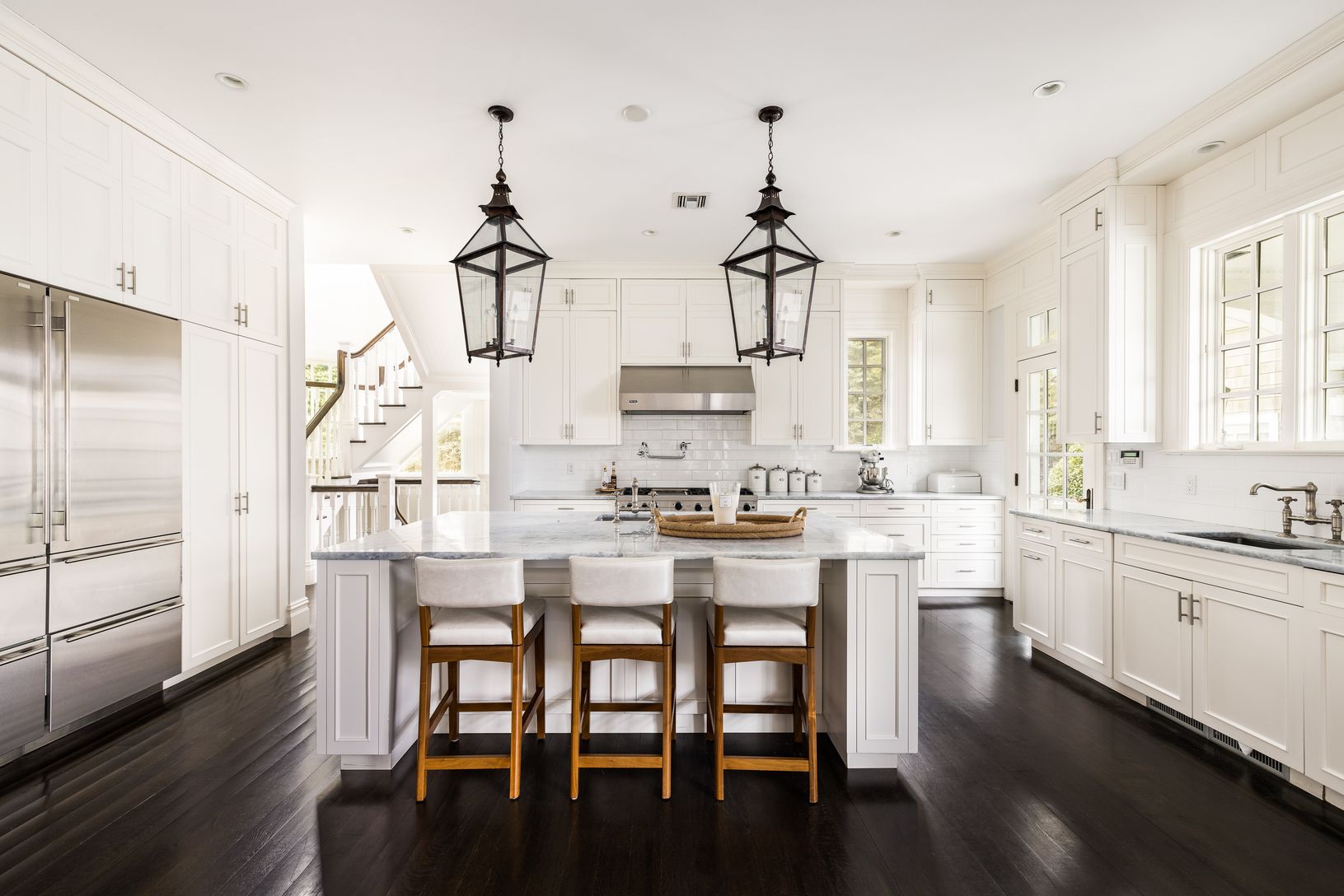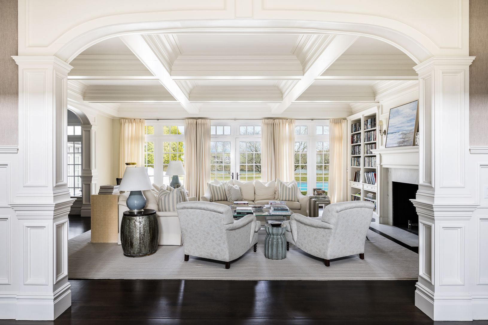 Privately situated behind a gated entry sits this beautiful shingled Traditional home with 151 feet of water frontage, a dock, waterside Gunite swimming pool and spa. Inside, a grand entrance foyer with double height ceiling leads you to a formal living room with fireplace, opening up to a professional kitchen, all of which open through French doors to a large patio overlooking the water and pool area. Stairs to your own private dock allow