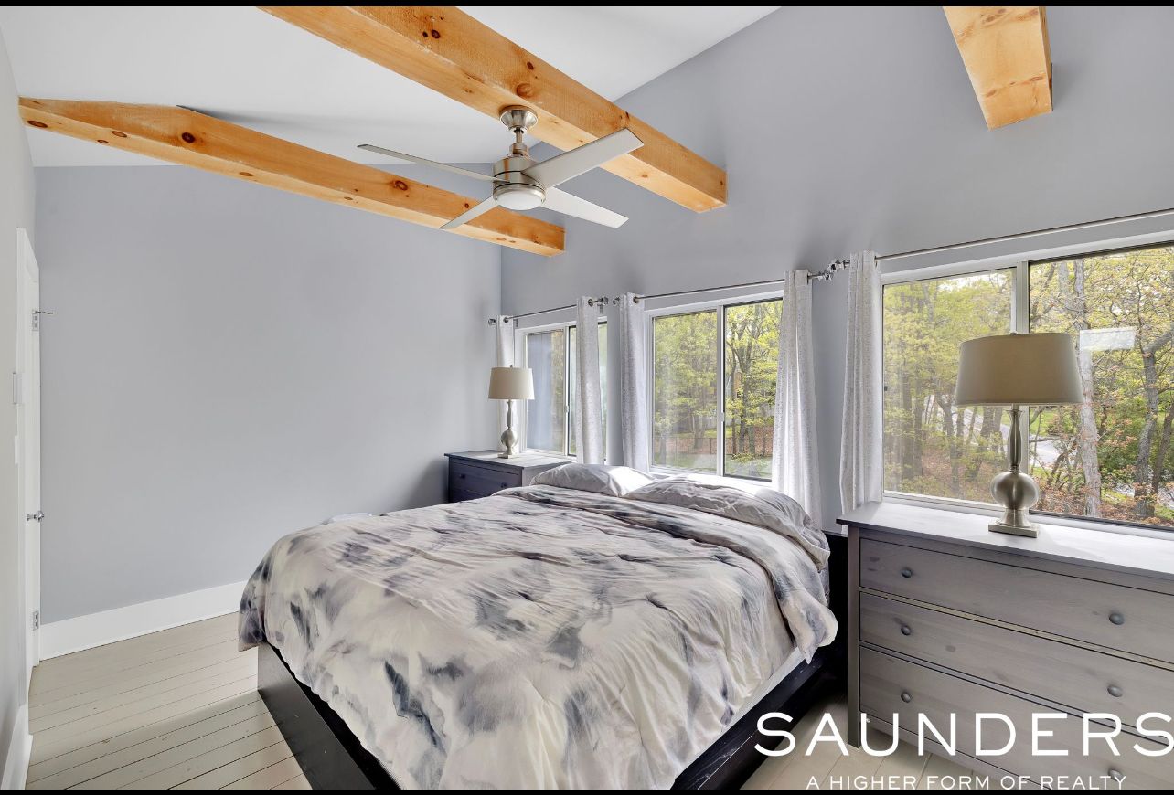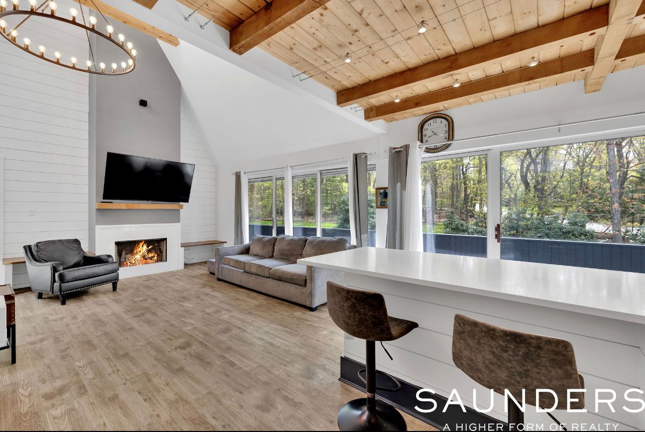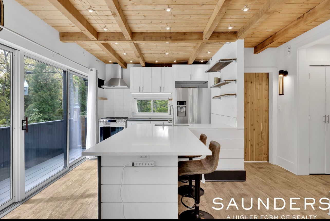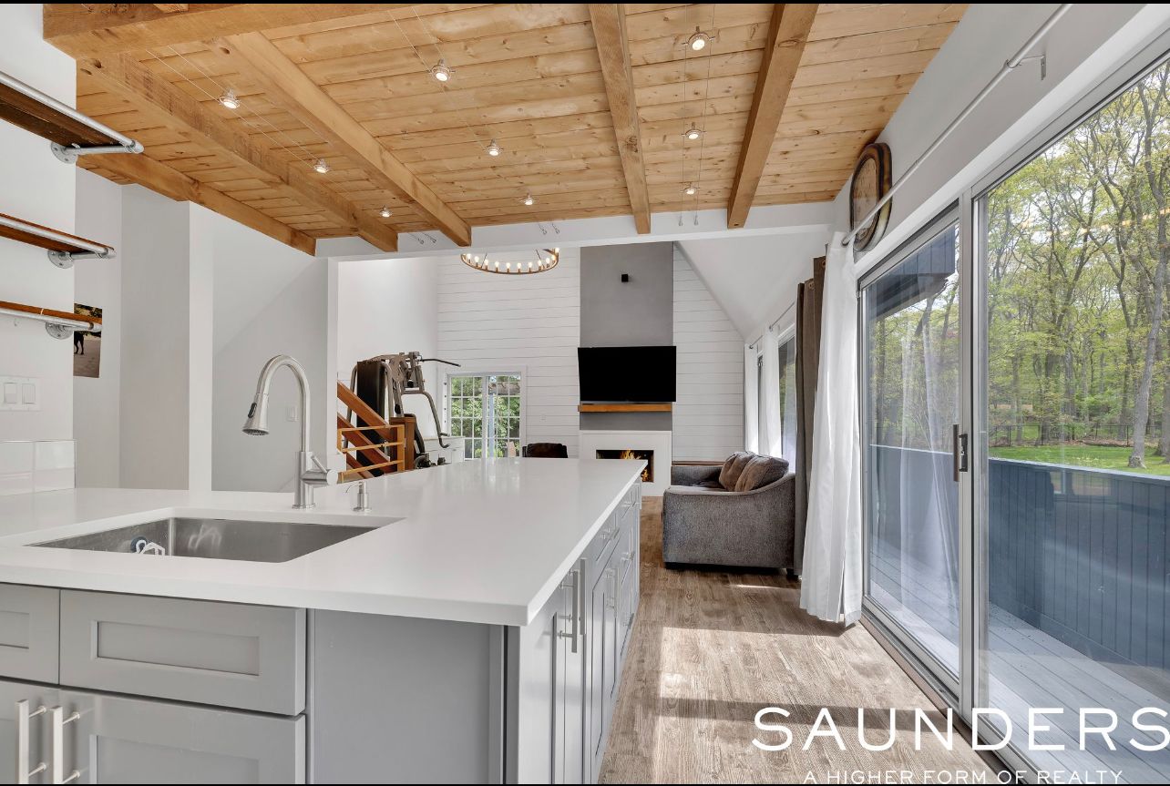 Perfect for a summer escape or year-round retreat in the Hamptons, this luxurious and chic contemporary home in a quiet neighborhood is just moments from the water and boasts stunning renovations and upgrades. Sited on .50 acre, the 2-level home has 4 bedrooms, 2 full and 1 half baths 1,800 +/- sq. ft. of living space, plus 600 +/- sq. ft. finished lower level, and an attached 2-car garage. The home's open-concept design is warm, inviting, and