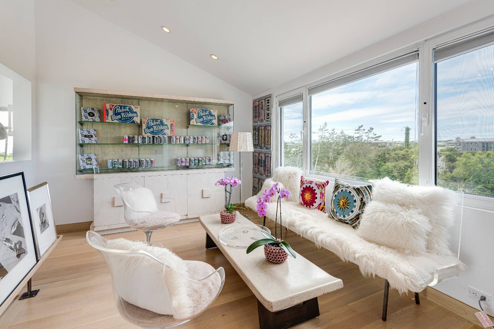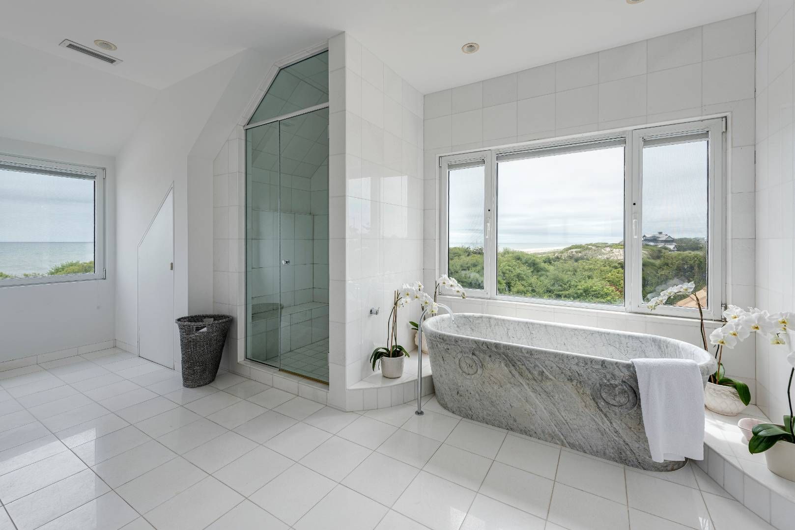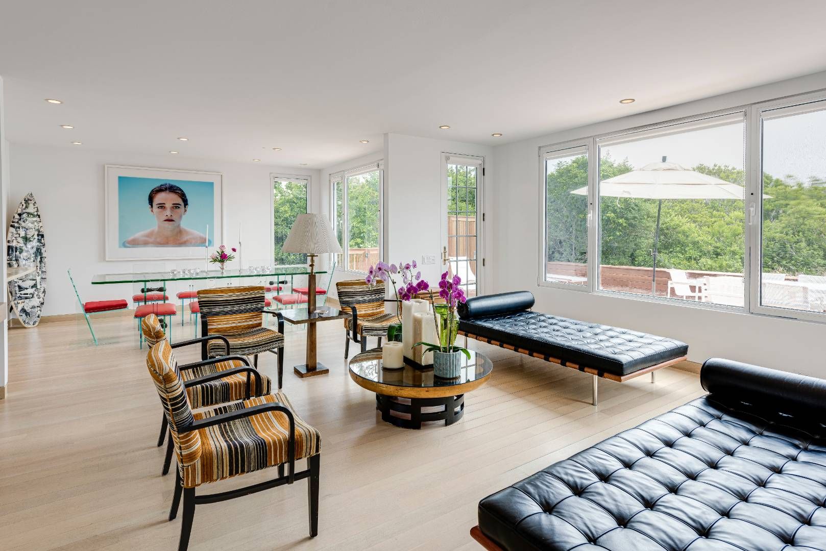 Rare opportunity, first time offered. Spend the summer in Southampton on the ocean. Live among an abundance of orchids, art and ocean views. Chic and bright six bedrooms with six and one-half baths. The stunning sunroom faces the 18' x 40' heated pool surrounded by patios. Multiple outdoor areas for dining overlook a rose garden and a picturesque modern sculpture and hydrangea garden. The gracious open living/dining room filled with iconic mid