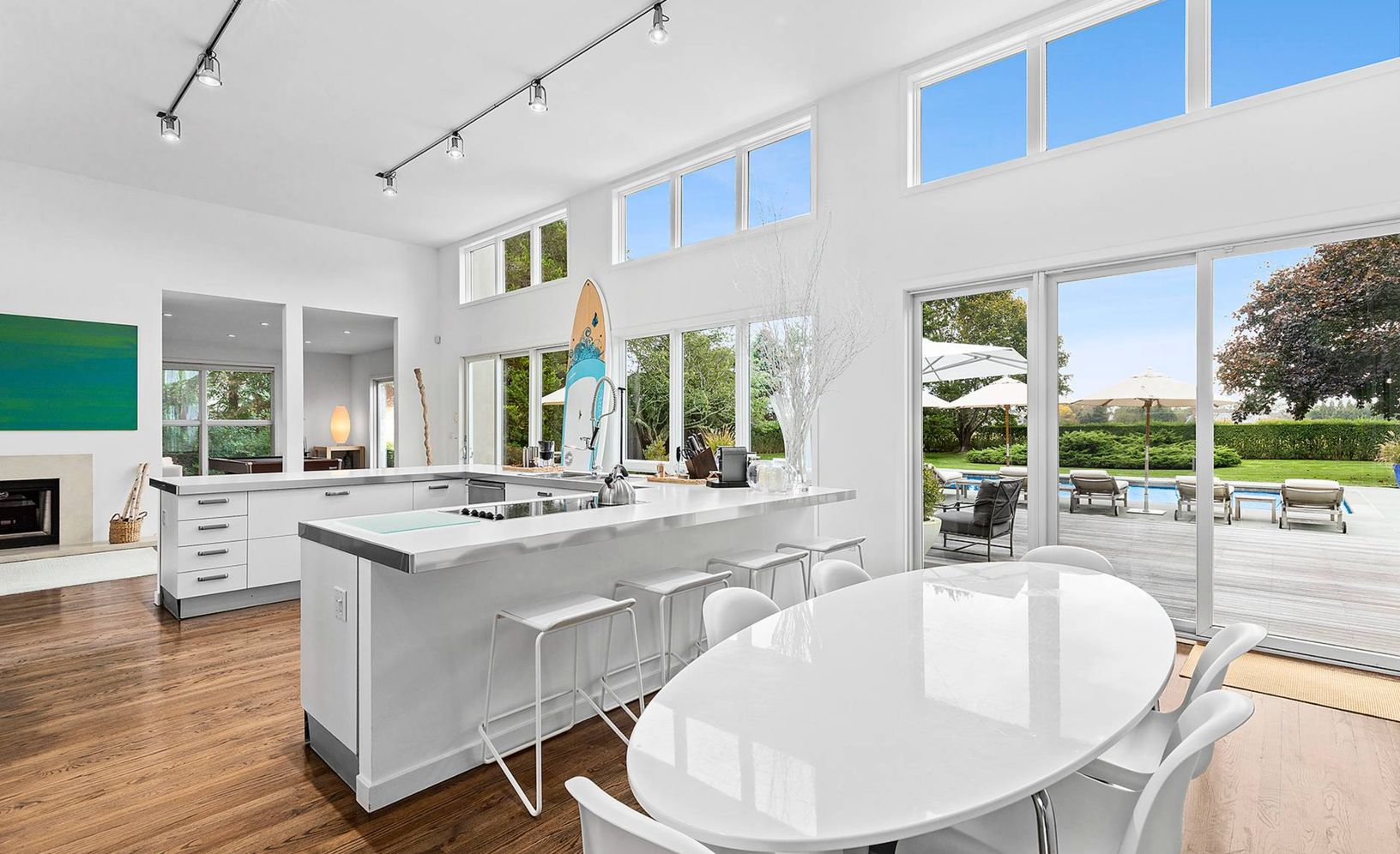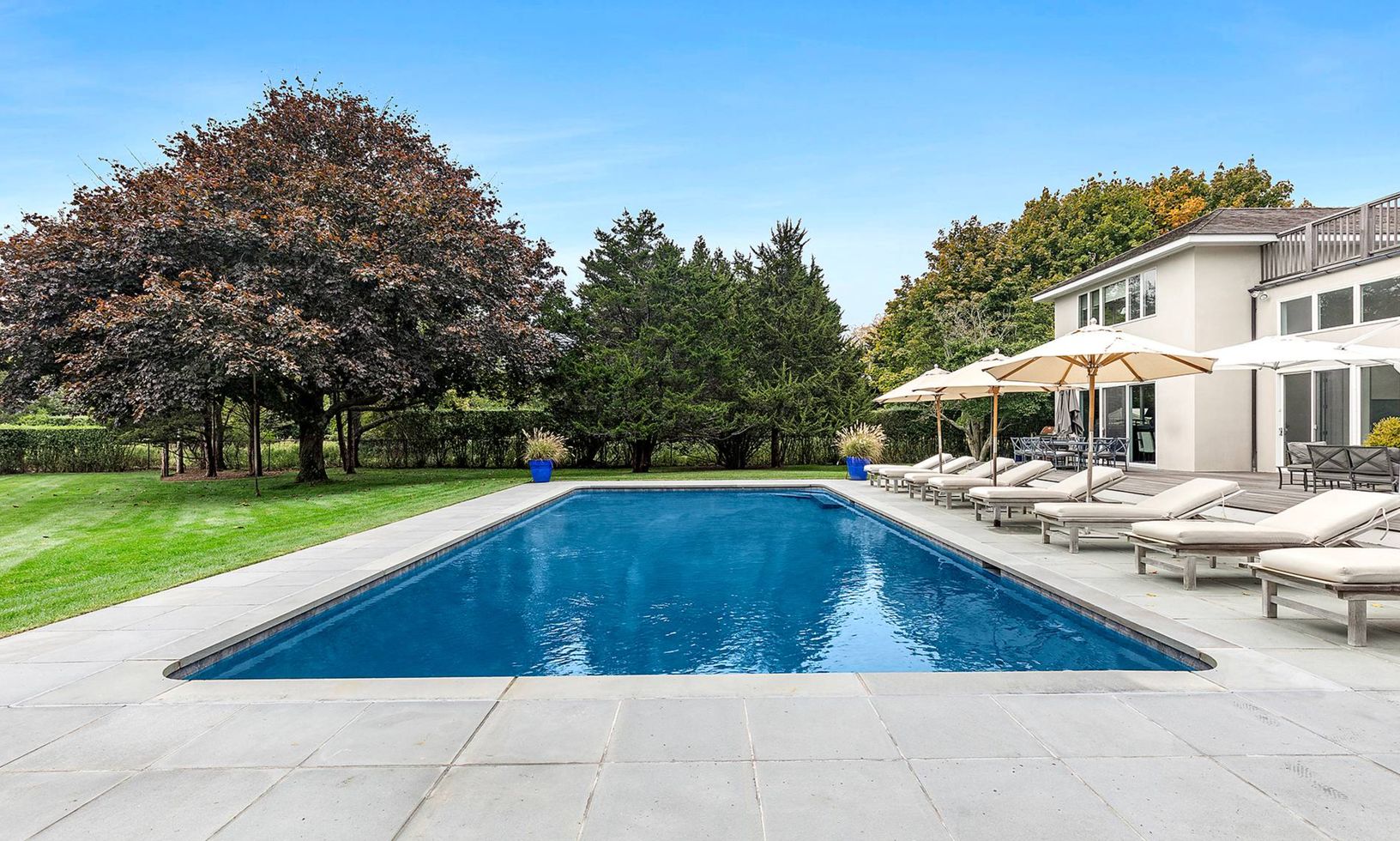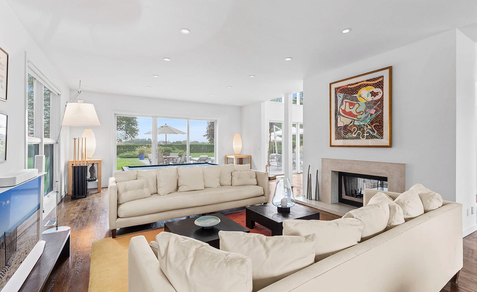 Elegant and clean with crisp lines describes this stucco two story contemporary built in 2001 with 5 bedrooms, 4.5 baths, designer kitchen, 2 fireplaces, and 20x40 heated Gunite pool all on 1 acre with open farm views. Filled with sunlight and open loft-like spaces, summer is glamorous and seductive in this residence. Come spoil yourself in Water Mill south on one of the most prestigious lanes to Mecox Bay.