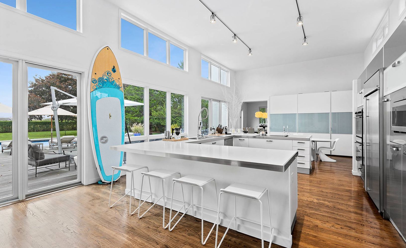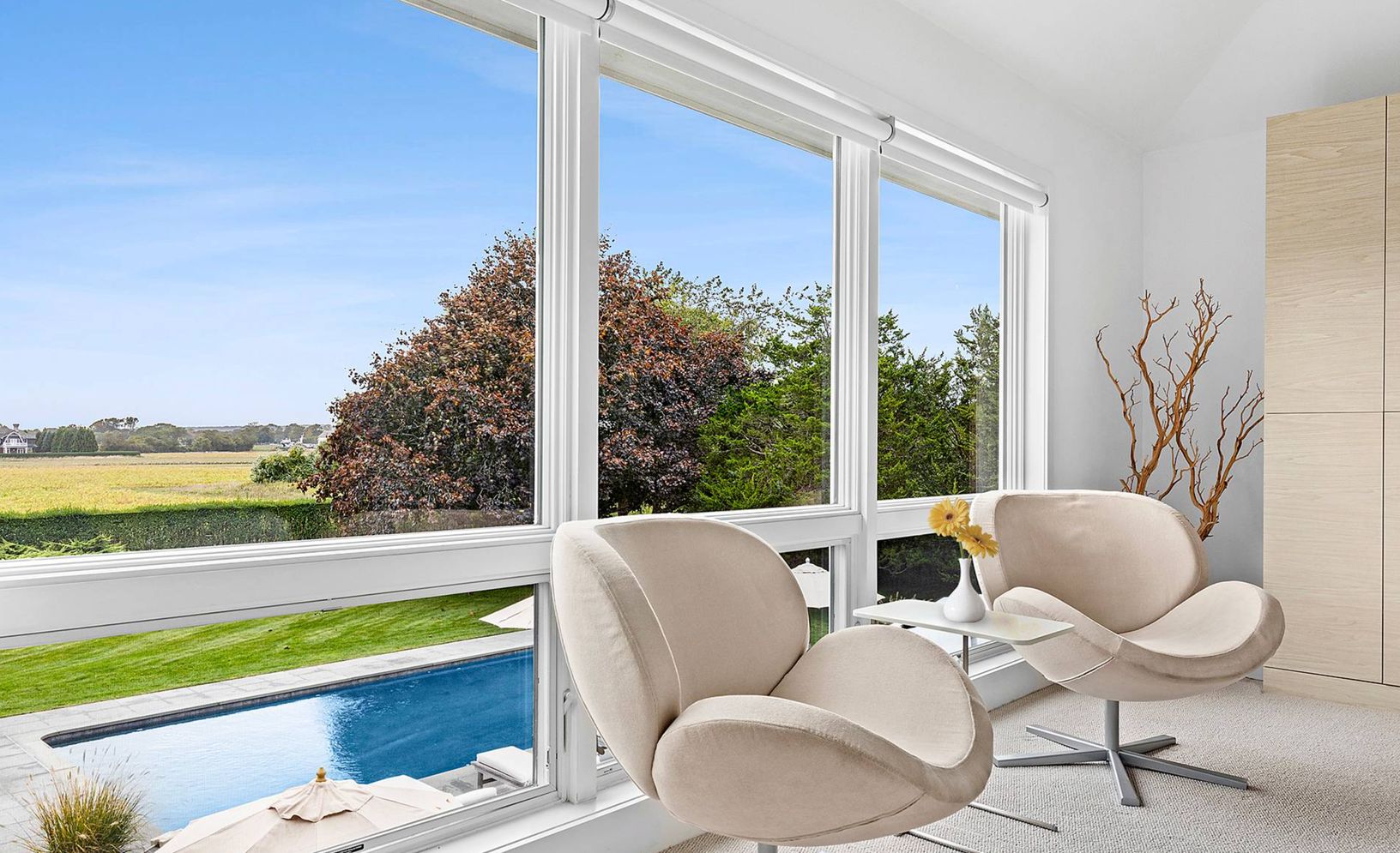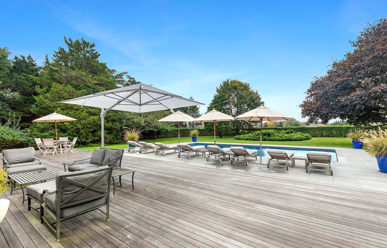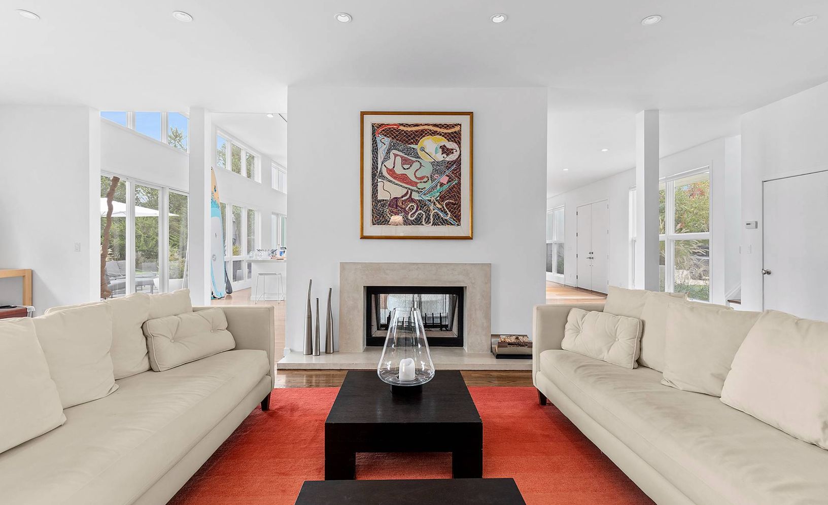 Elegant and clean with crisp lines describes this stucco two story contemporary built in 2001 with 5 bedrooms, 4.5 baths, designer kitchen, 2 fireplaces, and 20x40 heated Gunite pool all on 1 acre with open farm views. Filled with sunlight and open loft-like spaces, summer is glamorous and seductive in this residence. Come spoil yourself in Water Mill south on one of the most prestigious lanes to Mecox Bay.