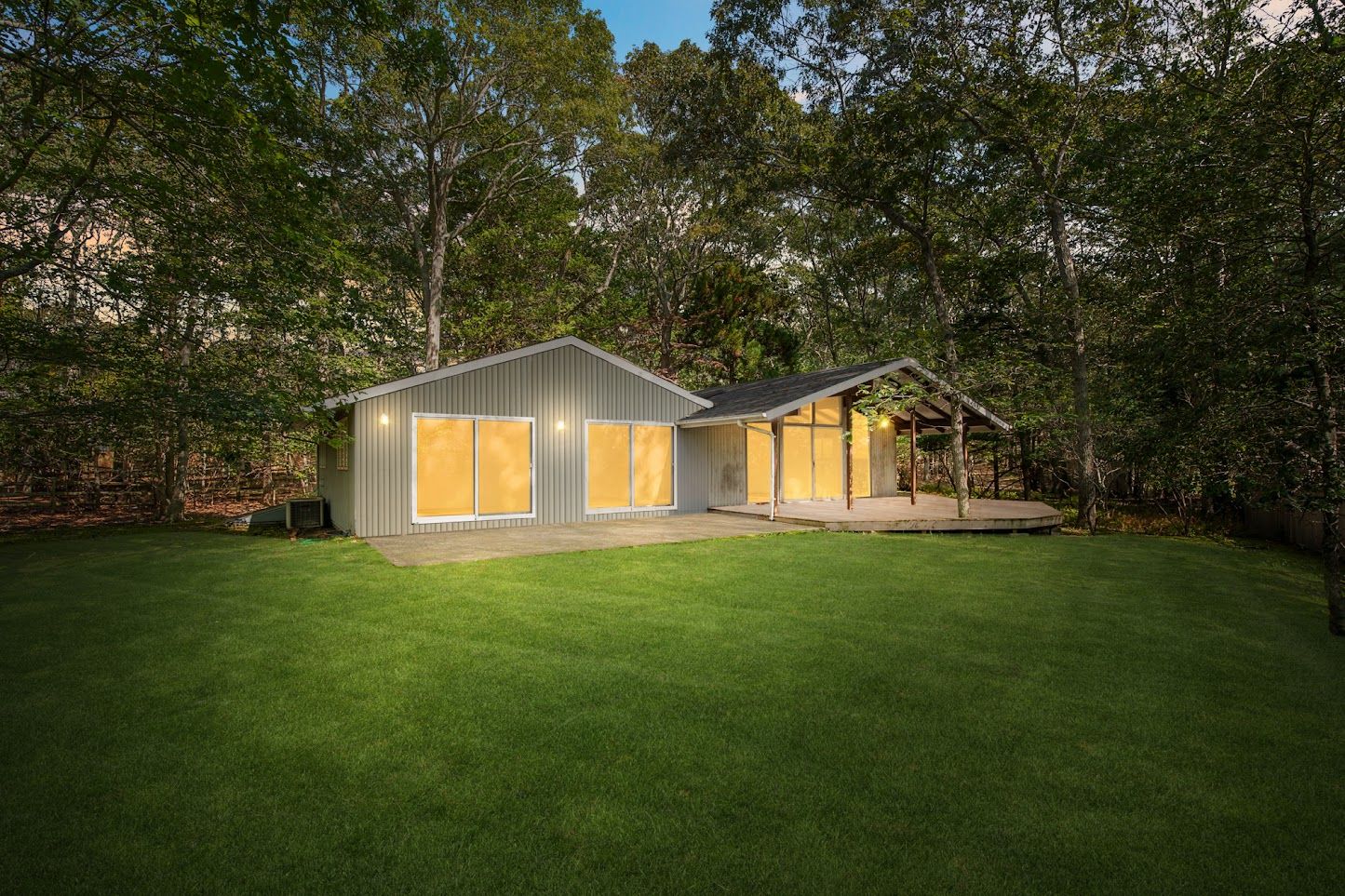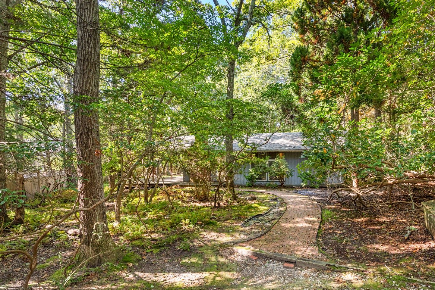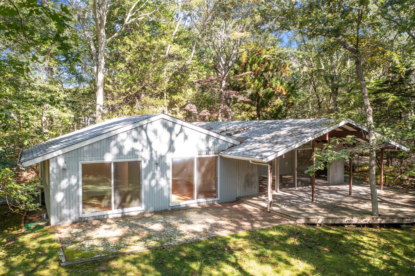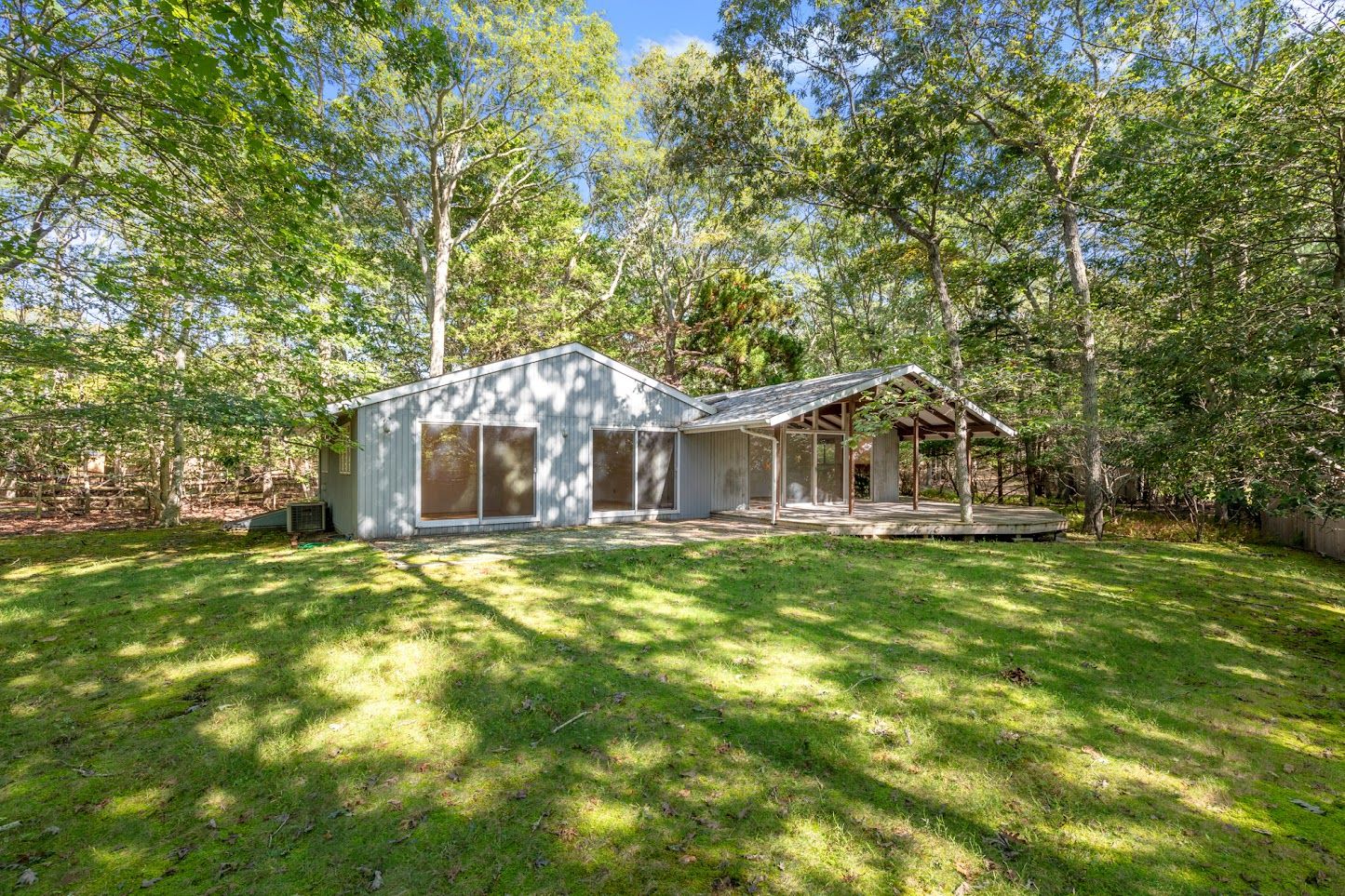 Situated on just shy of an acre and down a long, private, tree-lined driveway, you will find this Tech-built home hidden away from the crowds, yet only 2.1 miles to Indian Wells ocean beach and the hamlet of Amagansett. Enter through the sliding glass doors into the open concept living room with brick fireplace and kitchen with plenty of pantry space. The primary bedroom, one guest bedroom and a full bath are on this side of the house. Through