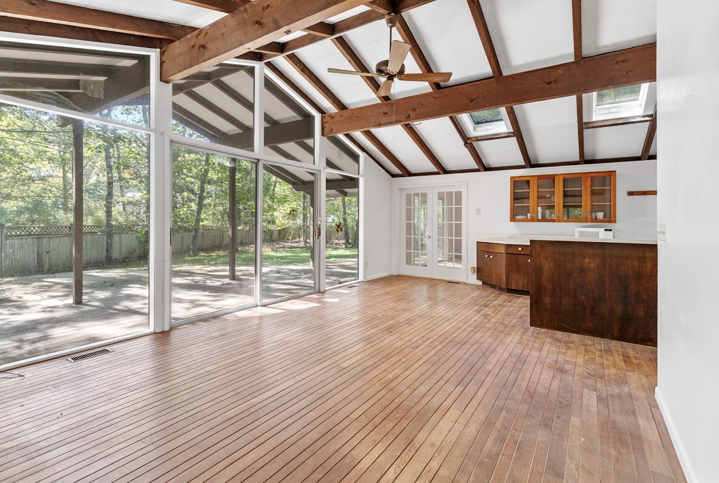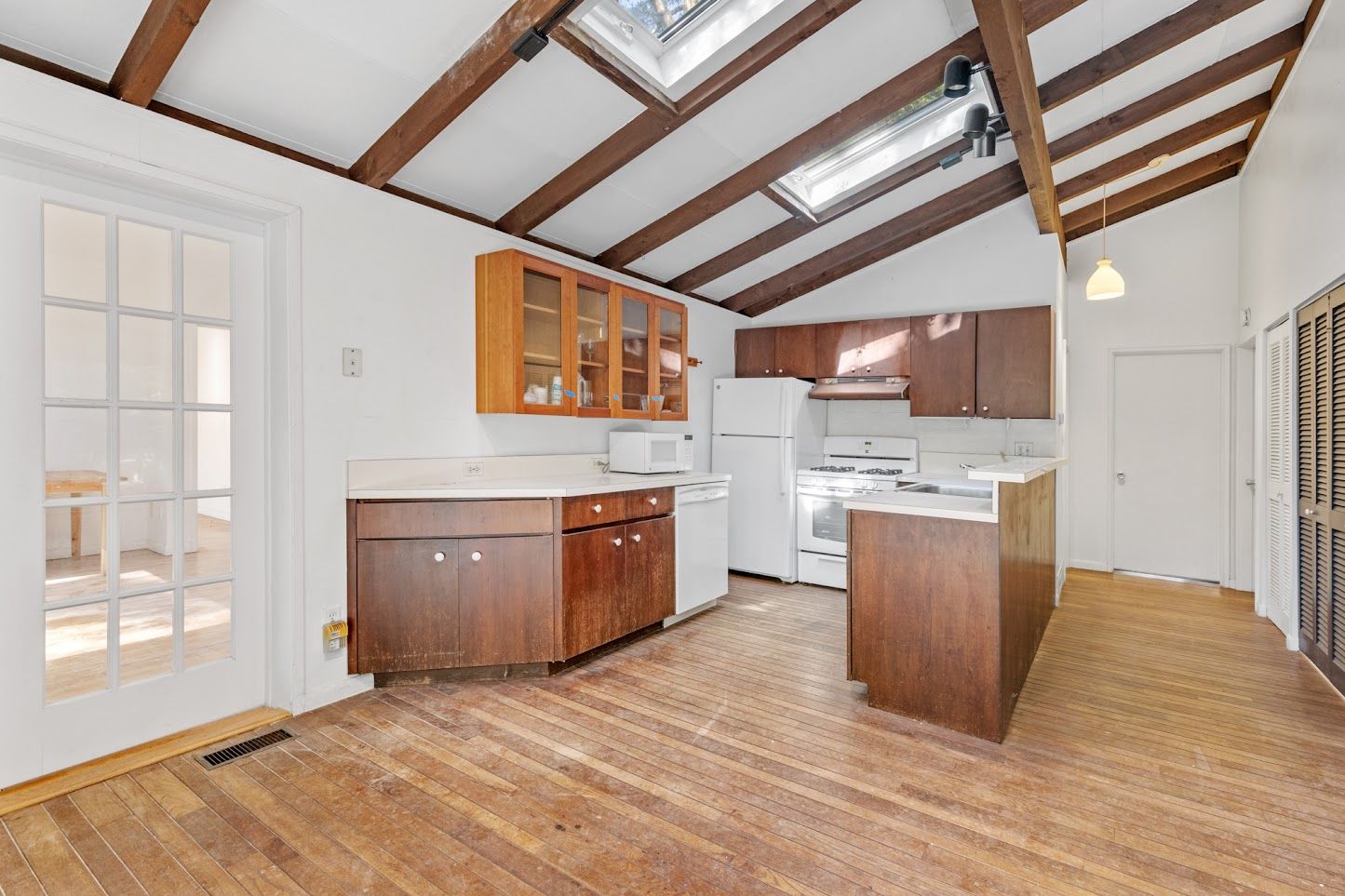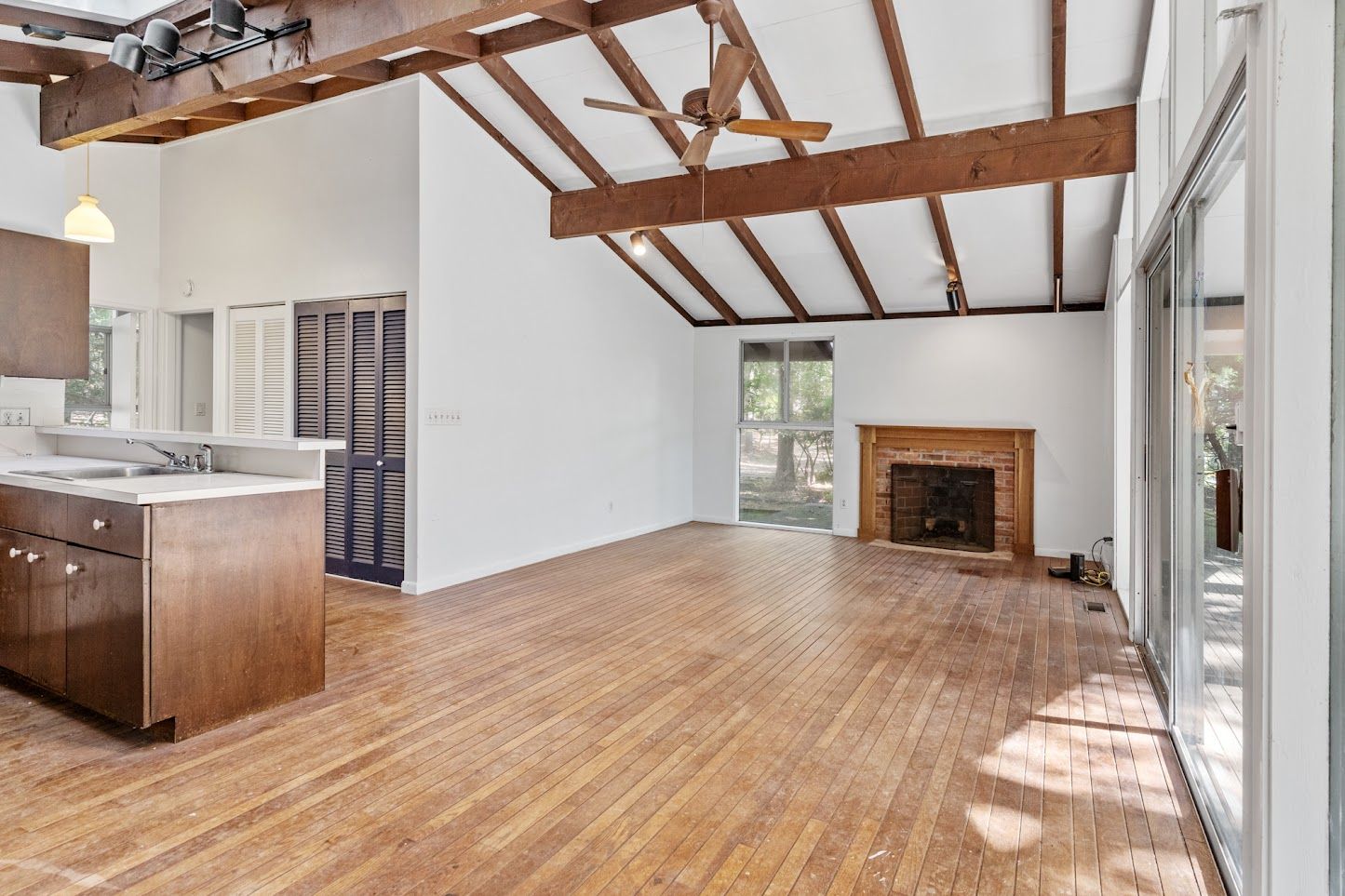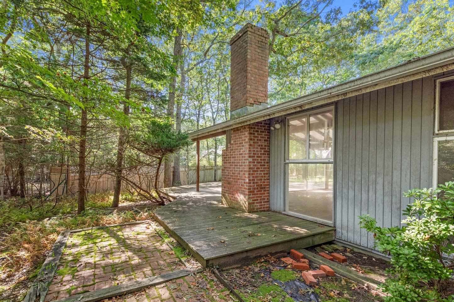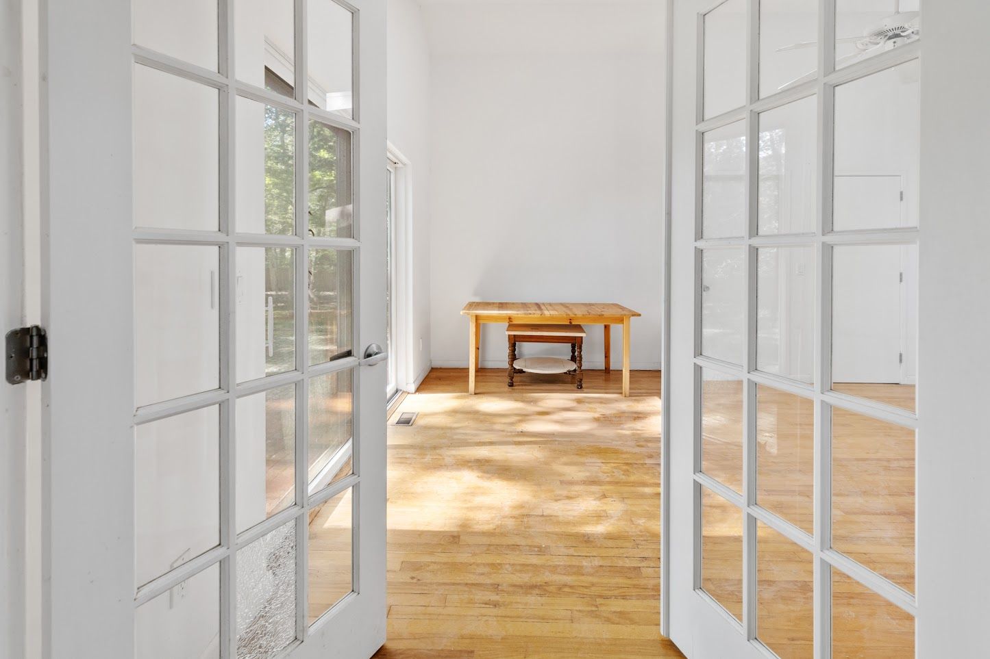 Situated on just shy of an acre and down a long, private, tree-lined driveway, you will find this Tech-built home hidden away from the crowds, yet only 2.1 miles to Indian Wells ocean beach and the hamlet of Amagansett. Enter through the sliding glass doors into the open concept living room with brick fireplace and kitchen with plenty of pantry space. The primary bedroom, one guest bedroom and a full bath are on this side of the house. Through