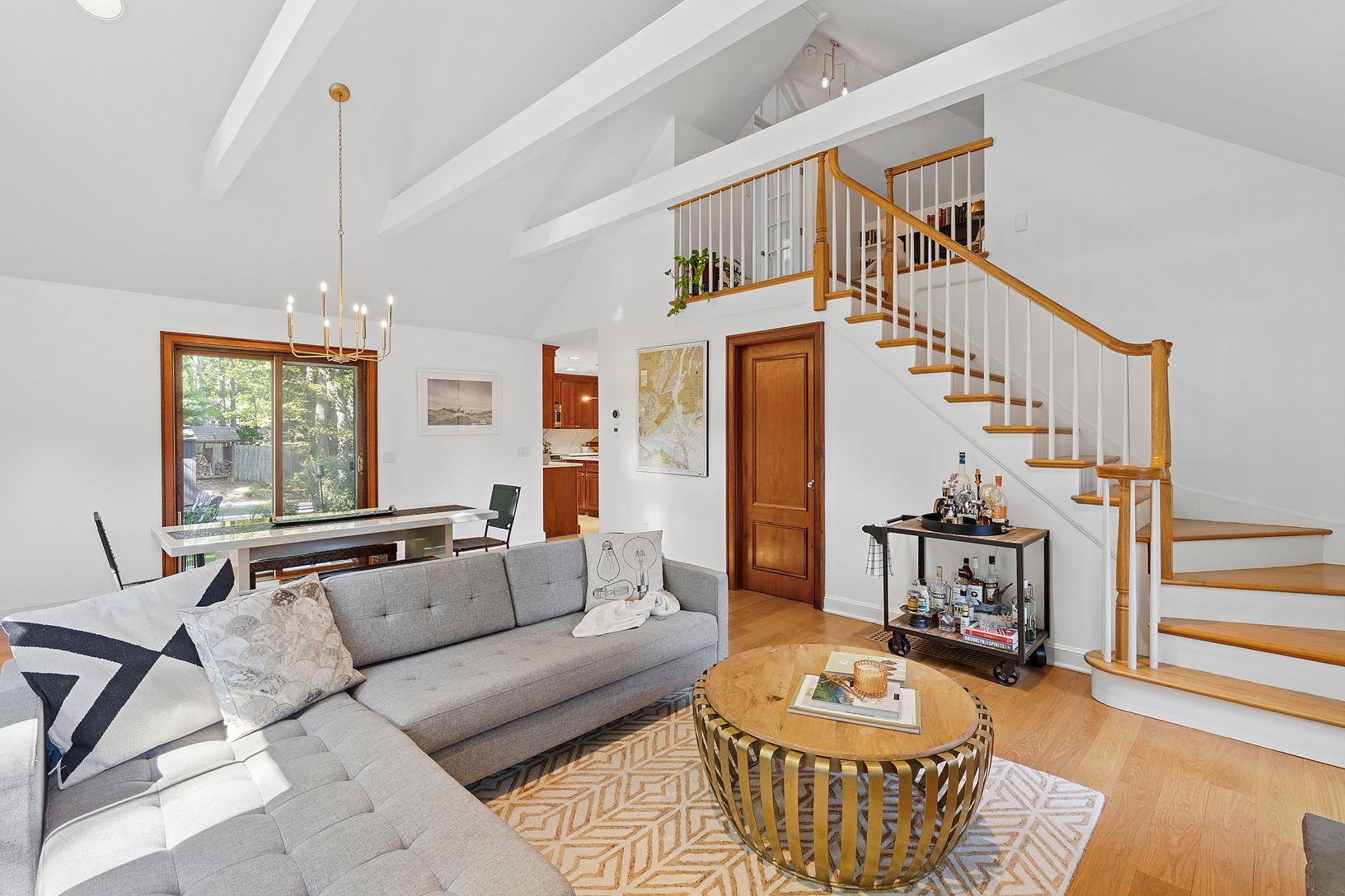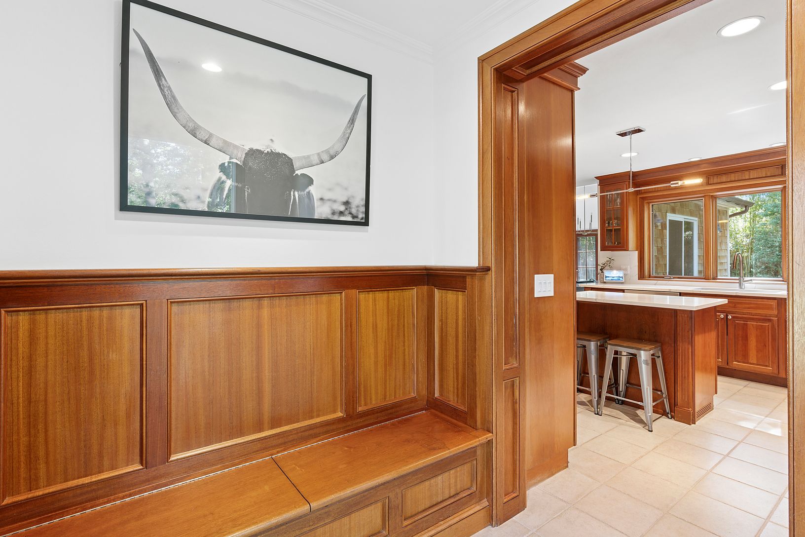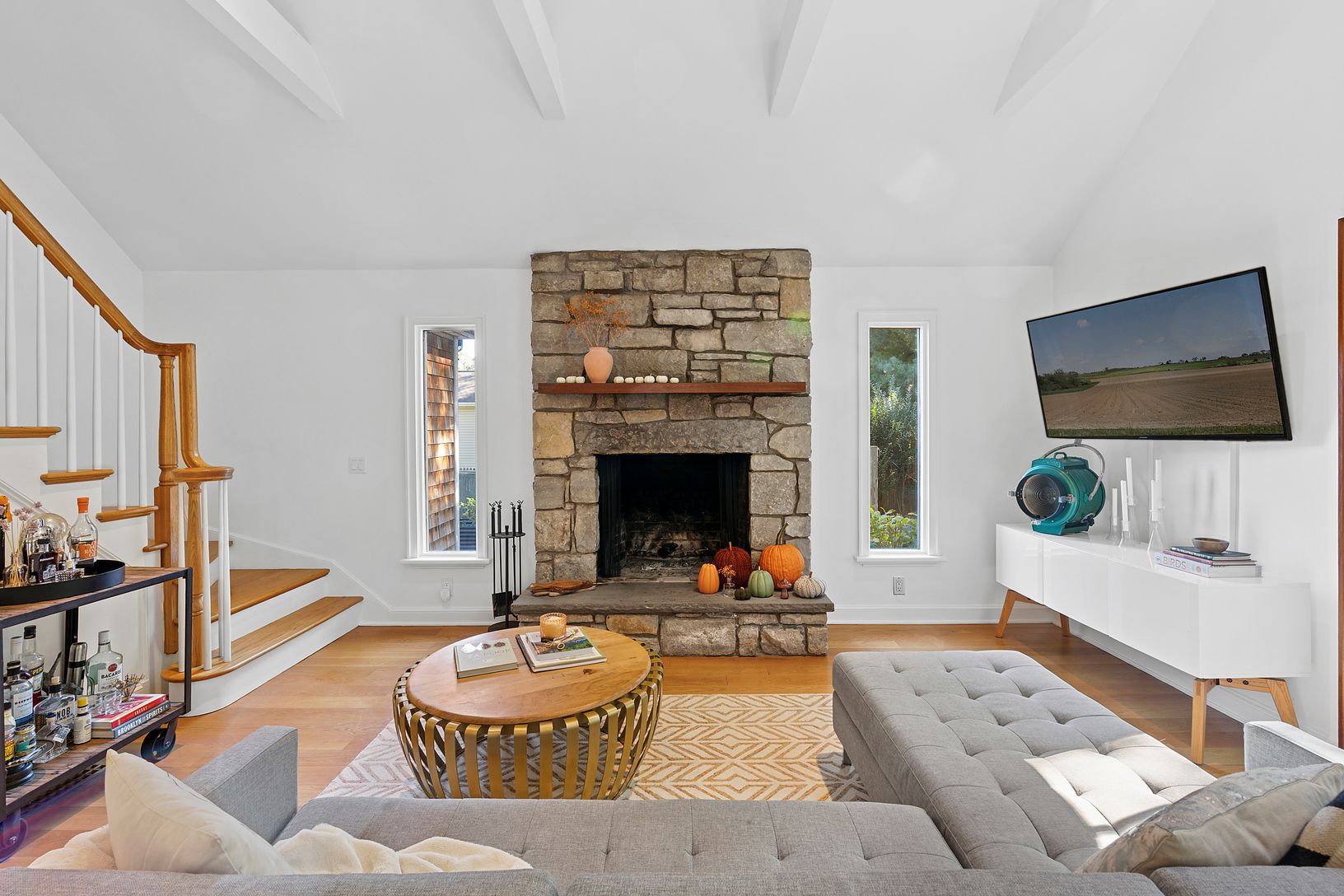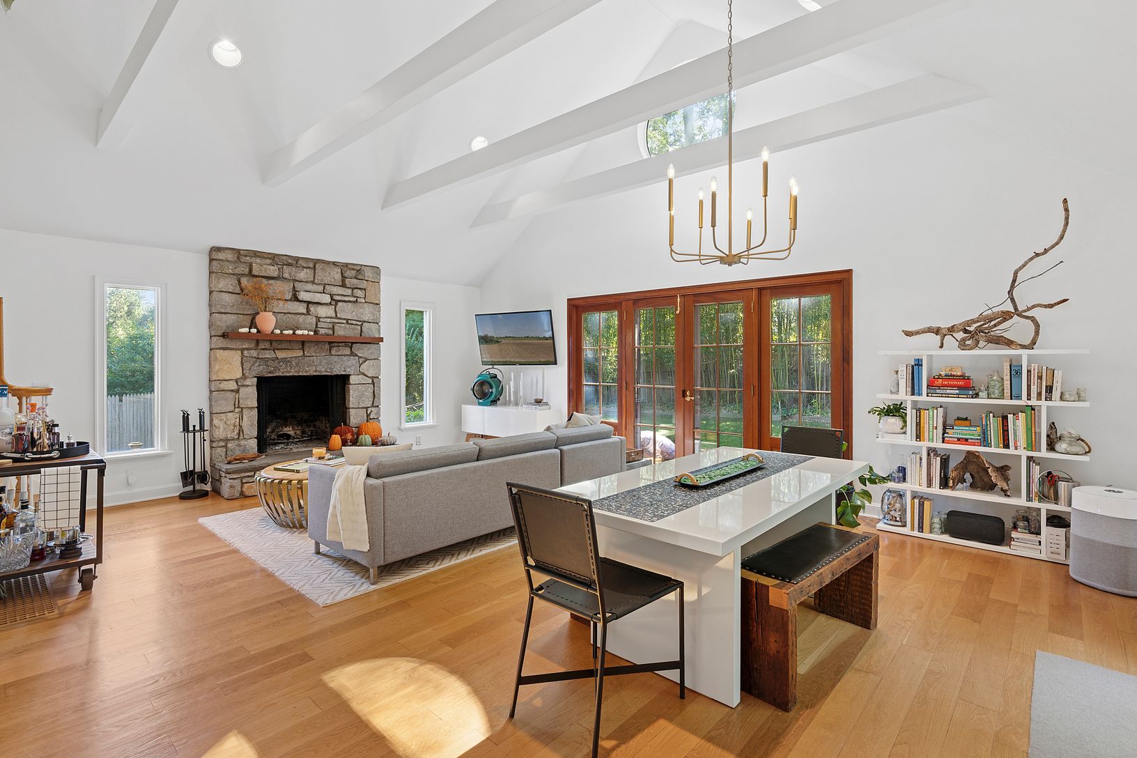Tucked away at the end of a quiet Wading River lane, 3 Breezy Point Road is where design meets soul. This custom-built gem blends architectural artistry with effortless living - a refined retreat wrapped in coastal calm. Step inside and you'll feel it immediately: soaring ceilings, hand-crafted mahogany doors and windows, and a striking Norman Jaffe-designed fireplace anchoring the living room with quiet confidence. The chef's kitchen is equal
