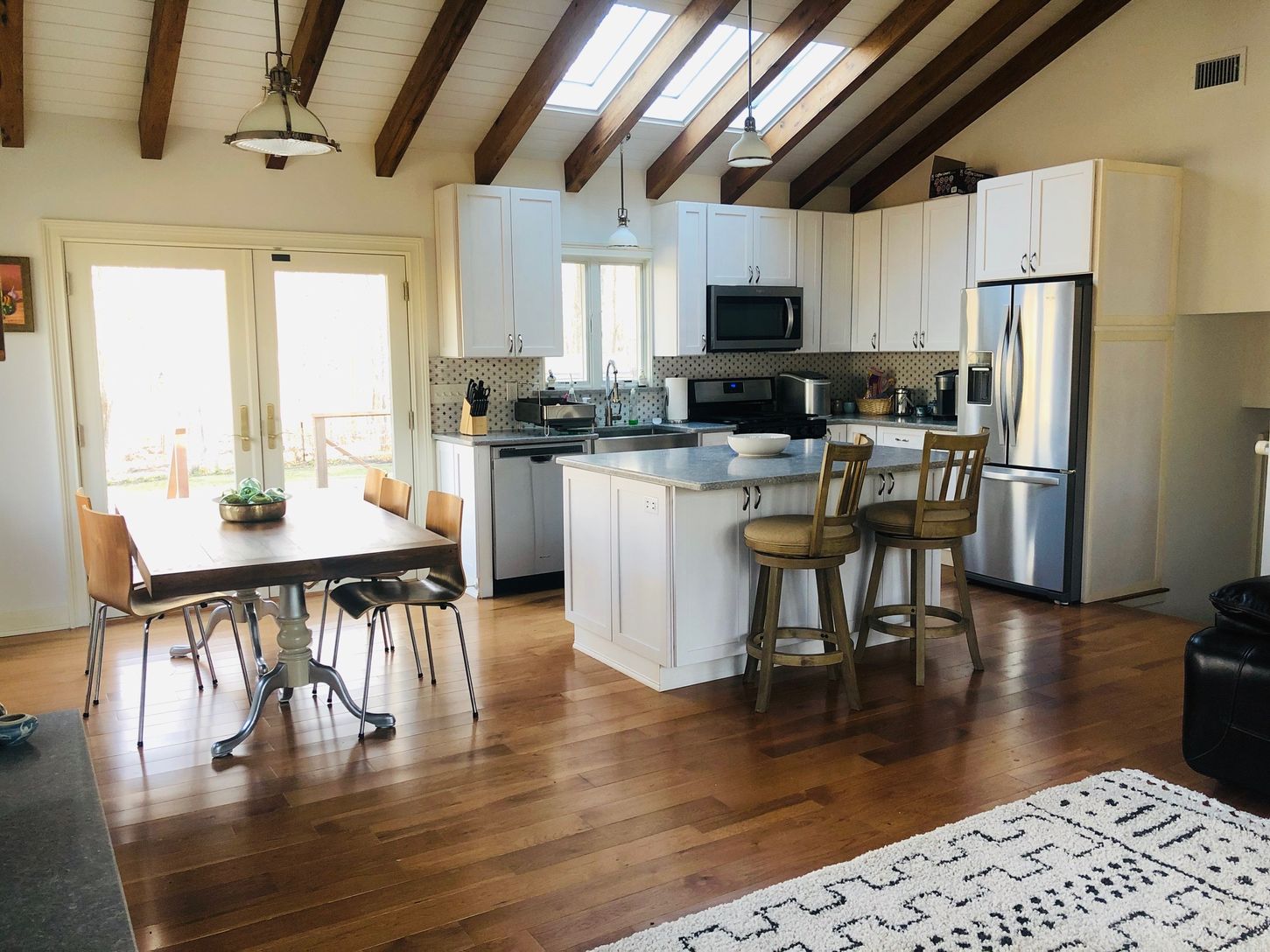 ust a few doors from the Silver Beach Association private beach on Peconic Bay, this 3 bedroom, 2 bath newly renovated house is the perfect summer getaway. The open plan living room with vaulted ceiling open to the dining area and the kitchen with sliders to a back deck. A half stair up leads to two bedrooms with a bath and a half stair down has a laundry room and an additional bedroom and bathroom. The back yard and pool area are beautifully