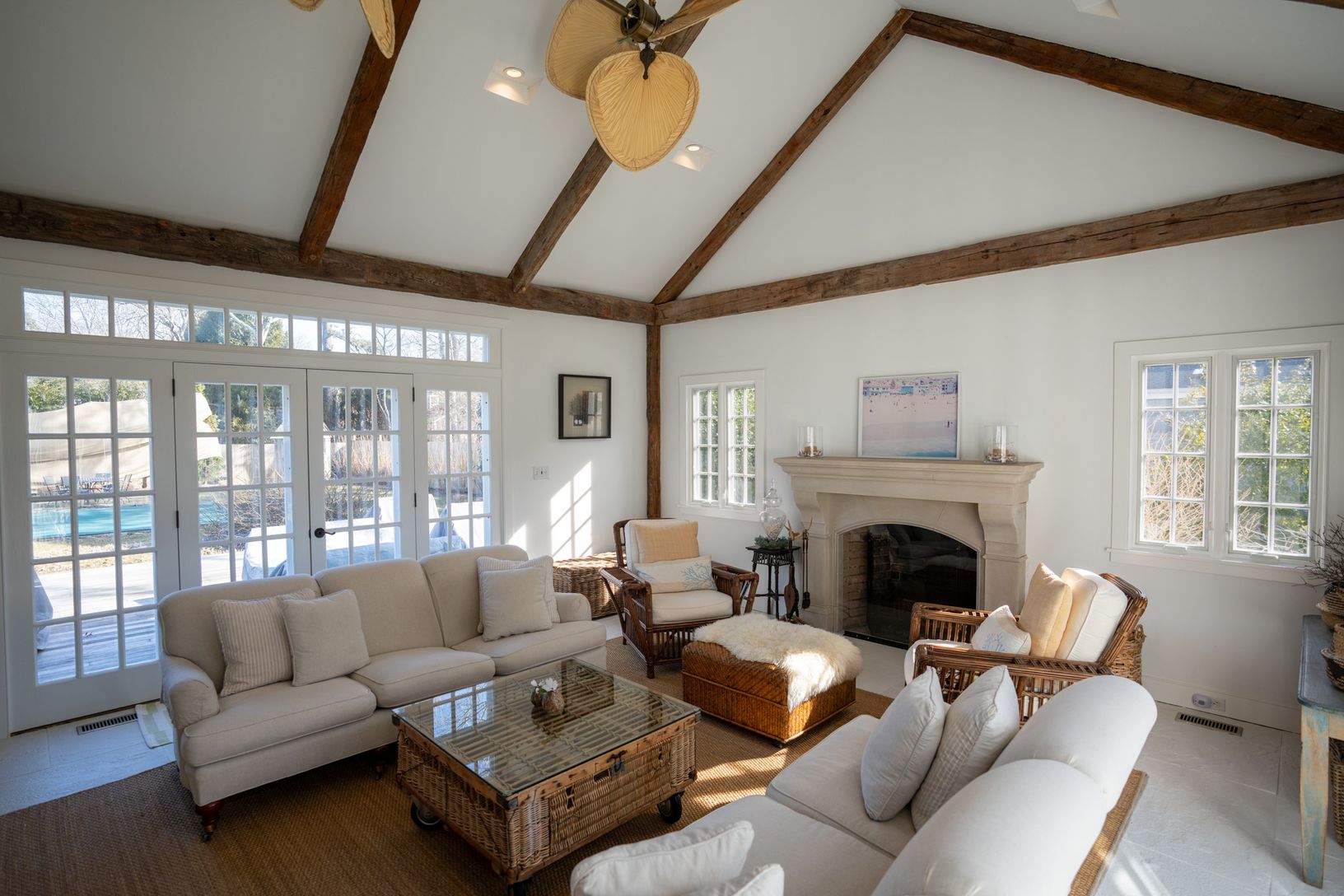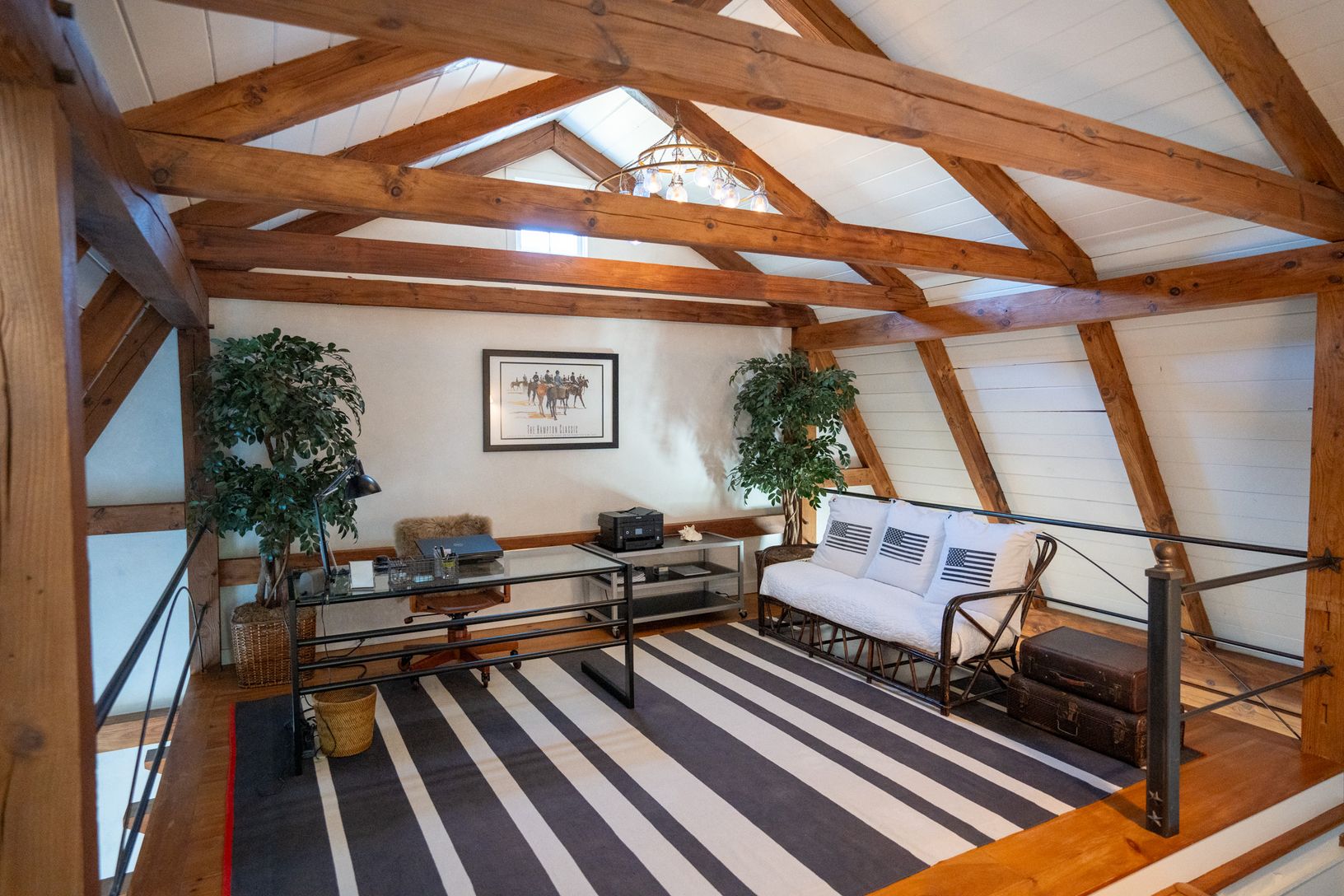 The home boasts an open and airy layout, with exposed beams and vaulted ceilings enhancing the spaciousness of the kitchen, dining room, loft, and grea