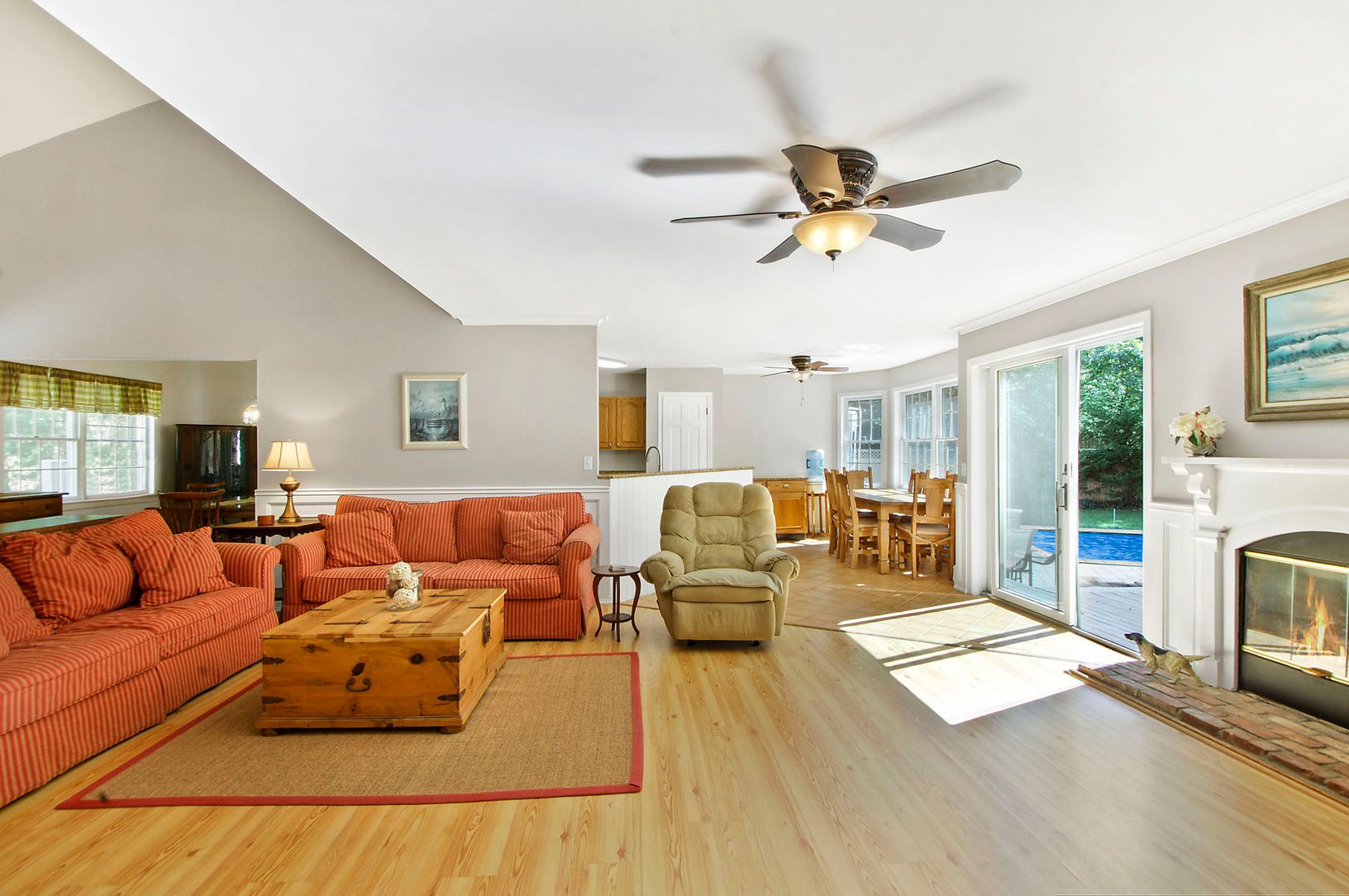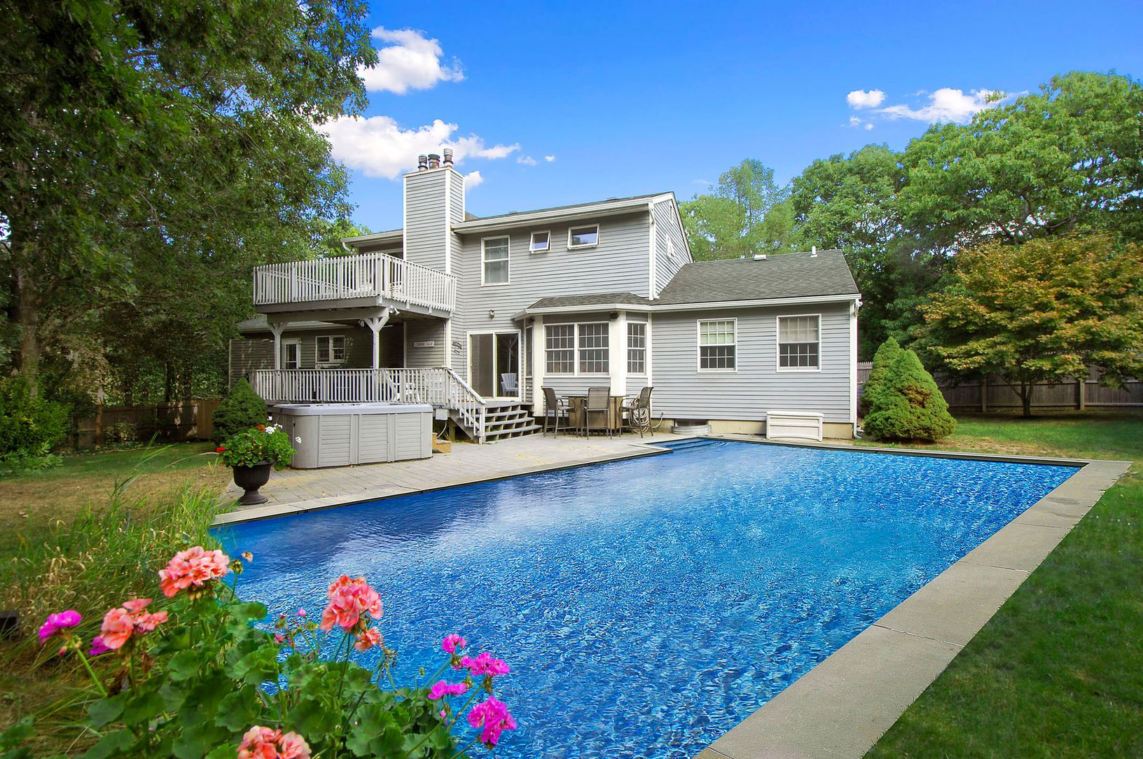 Close to East Hampton village shopping and local restaurants, this Post Modern home features an open floor plan with a cathedral ceiling in the entry, living room with fireplace, formal dining room, kitchen with granite countertops and stainless appliances. On the first floor there are two bedrooms and two baths and a bonus room/ secondary master large enough to use as a guest suite with its own private entrance and bath and sitting area.