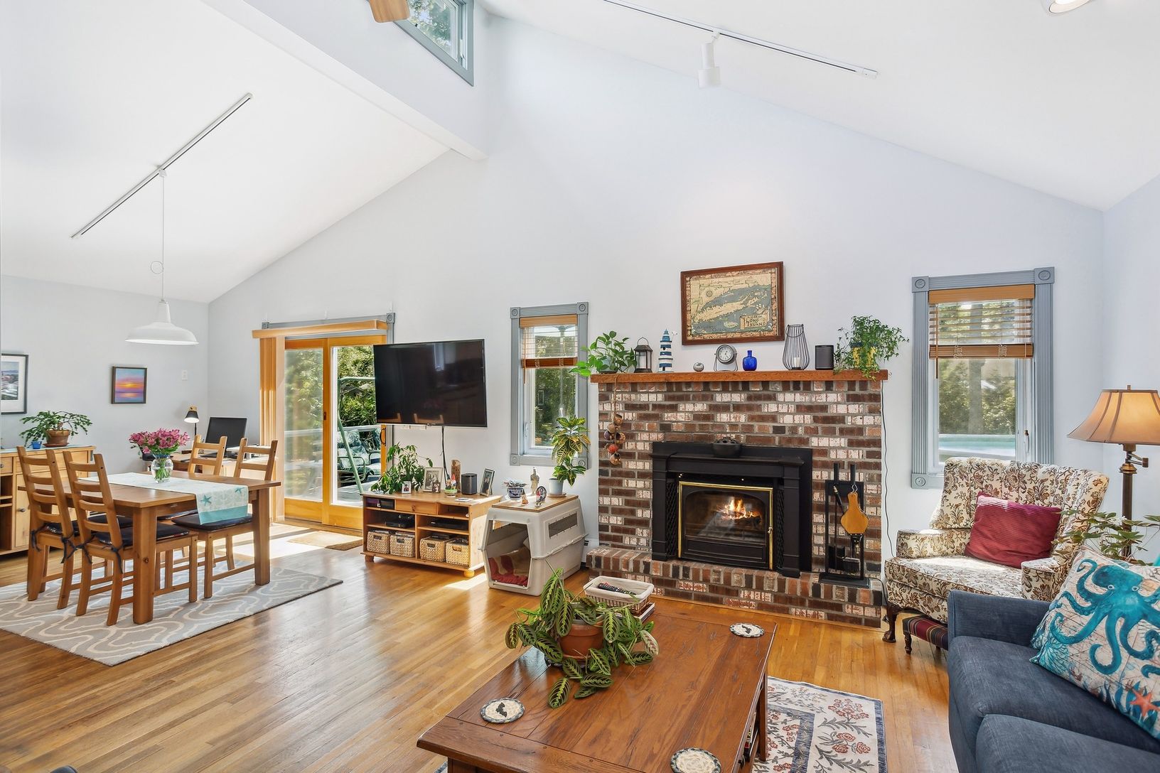 Located South of the Highway on a quiet cul-de-sac, this one-level, light-filled Contemporary home features three Bedrooms and two Full Bathrooms. The Open Concept living space includes a large Living Room with cozy wood-burning fireplace, built-in bookcases and vaulted ceilings; Dining Area with Sliding Glass Doors to Back Deck; and a large Kitchen with lots of Storage, expansive Countertop Work Areas, and Counter Seating. The outdoor space i