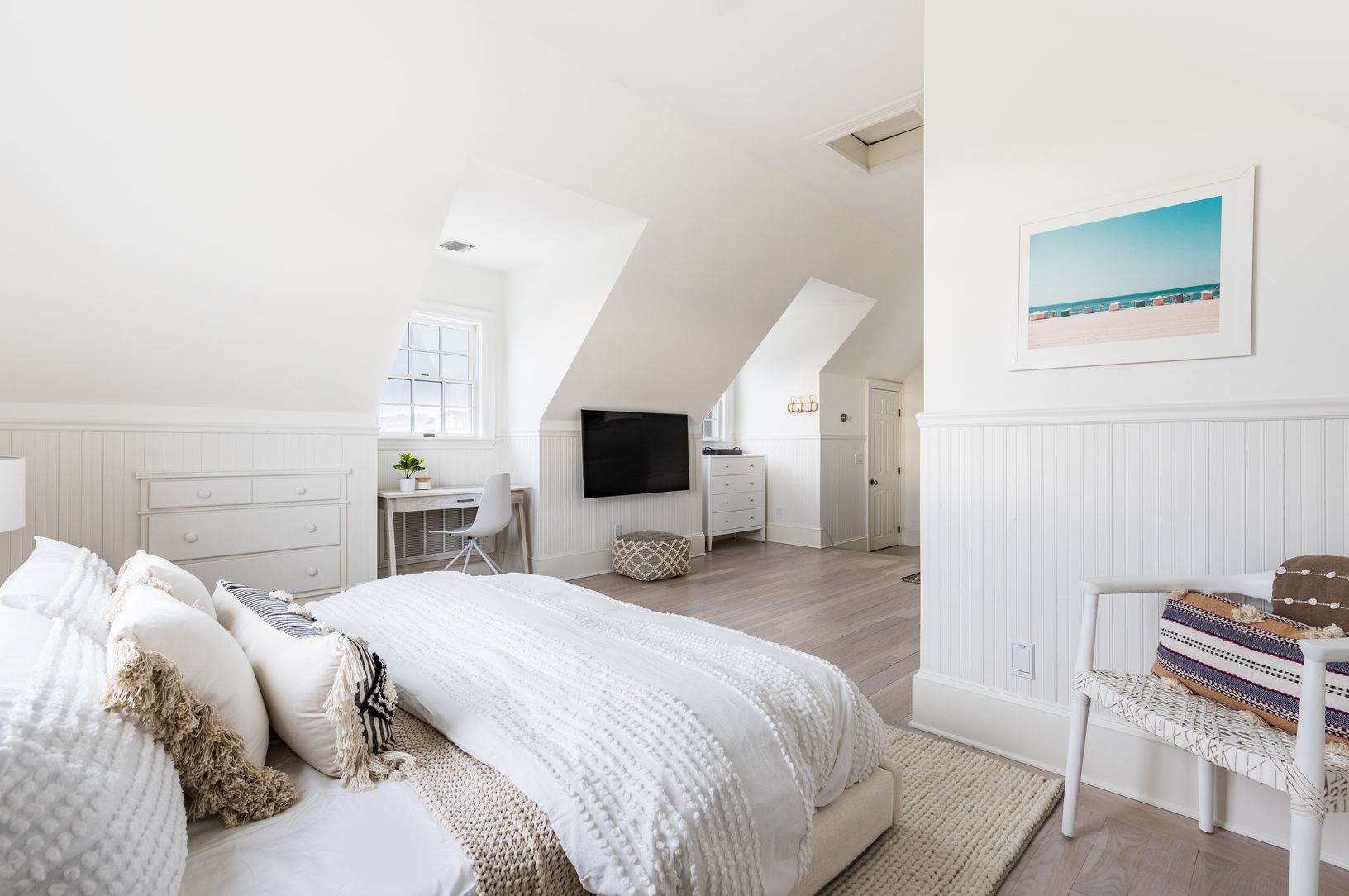 Renovated to perfection, this Montauk home has all the amenities for convenient living in a premiere location. Situated atop a hill overlooking the lake and bay, this gorgeous light-filled and immaculately maintained home features an entirely updated interior. The first floor is spacious with a cozy living room with fireplace seamlessly flowing to the open dining area and gourmet kitchen with stainless appliances and large center island, all o