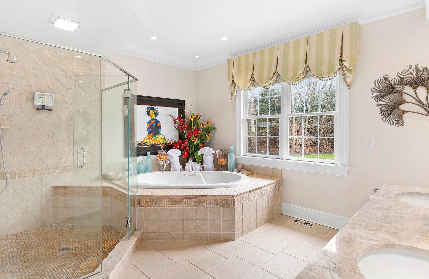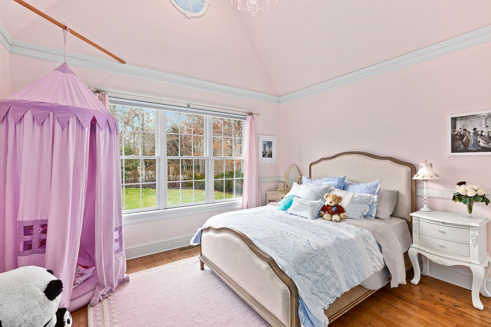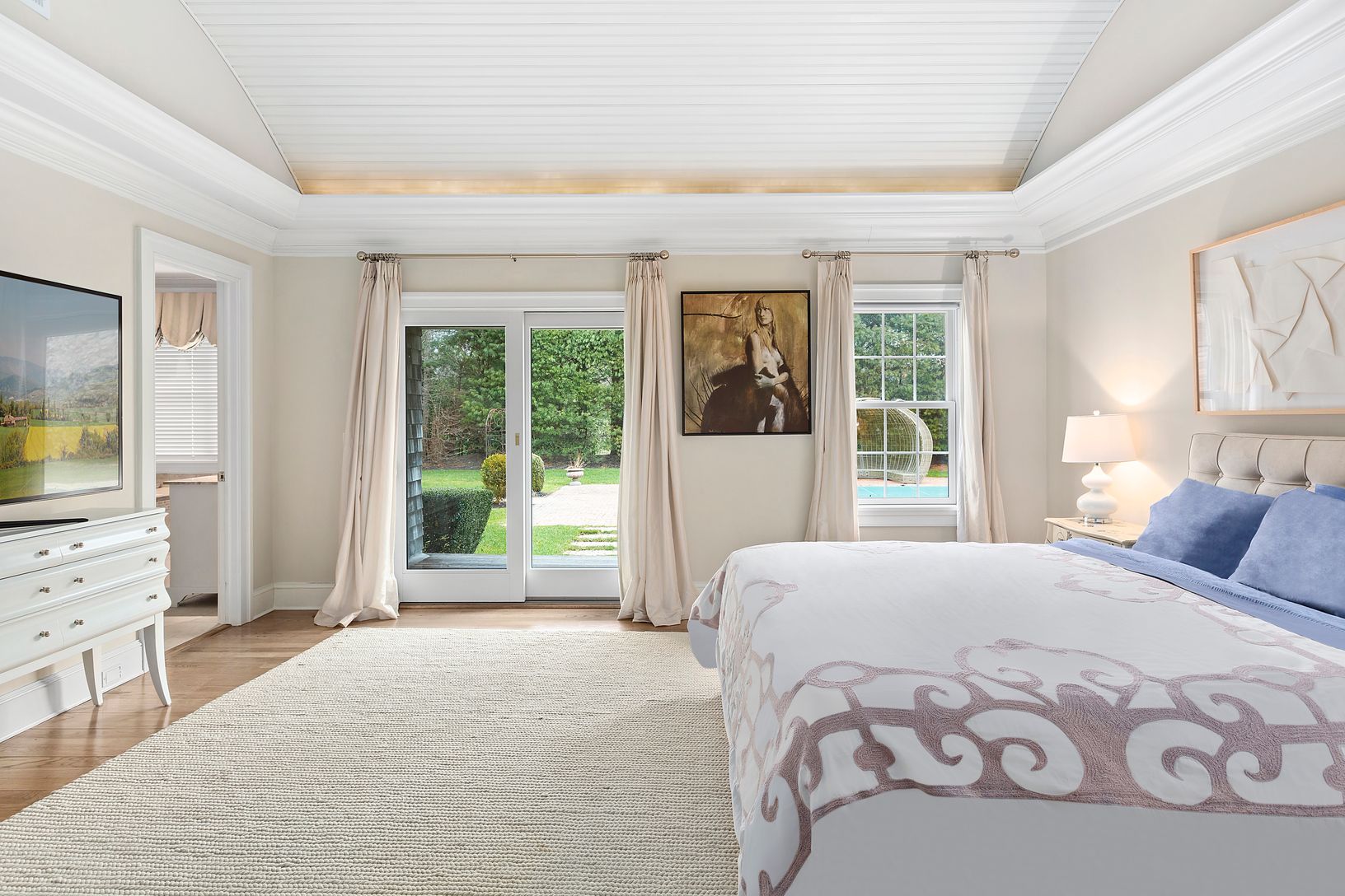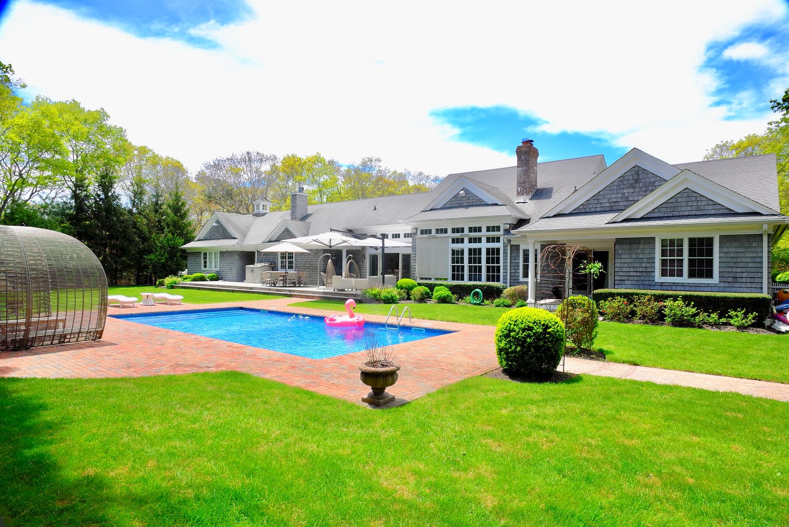 This gorgeous five bedroom, three and one-half bath home sits on a beautifully landscaped one +/- acre lot in the desirable Pinesfield Beach community in East Quogue. With custom millwork throughout, the main floor boasts a great room/den with wood-burning fireplace, butler's pantry and beverage bar, gourmet chef's eat-in kitchen with granite countertops and a center island, a formal living area with cathedral ceilings and fireplace, a powder