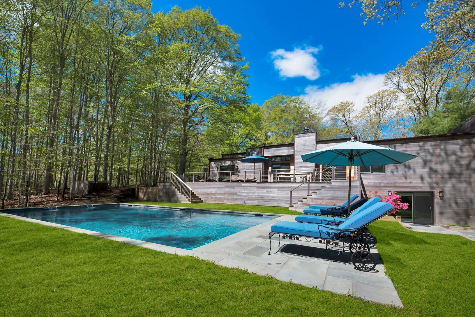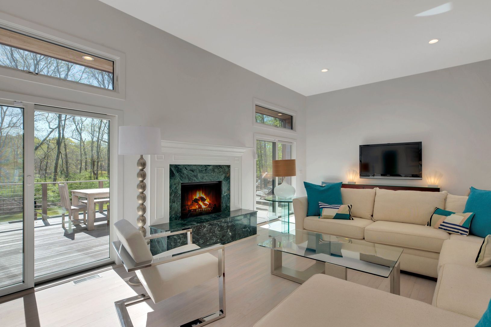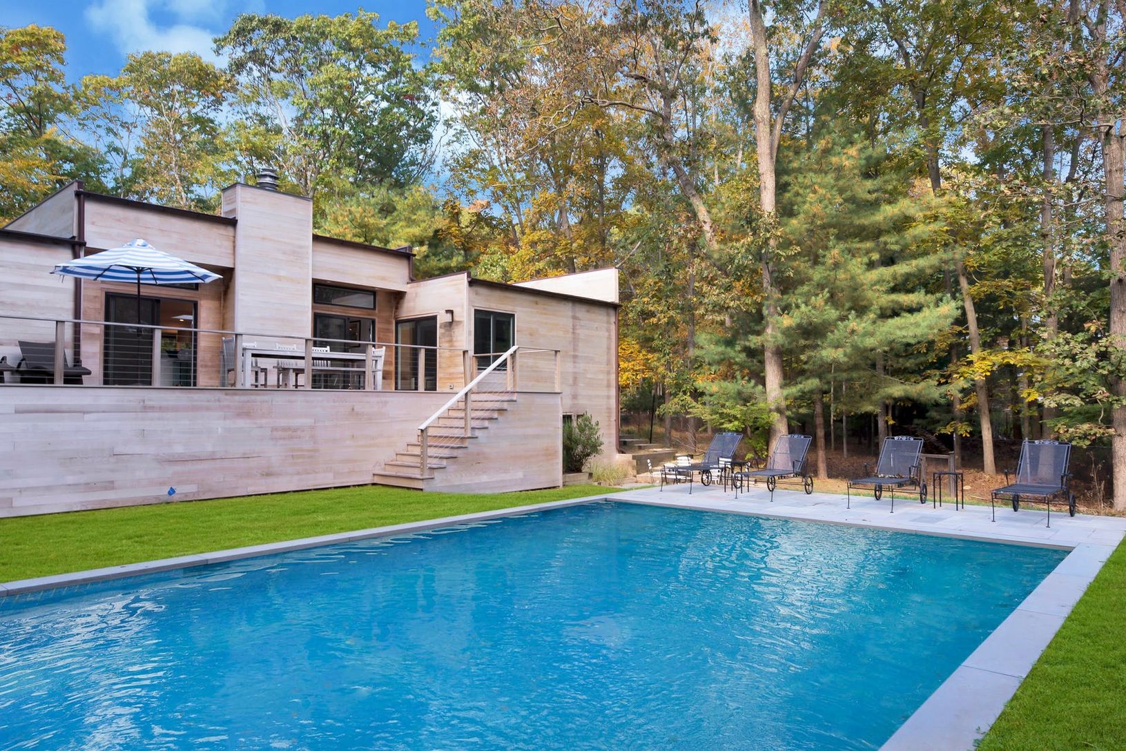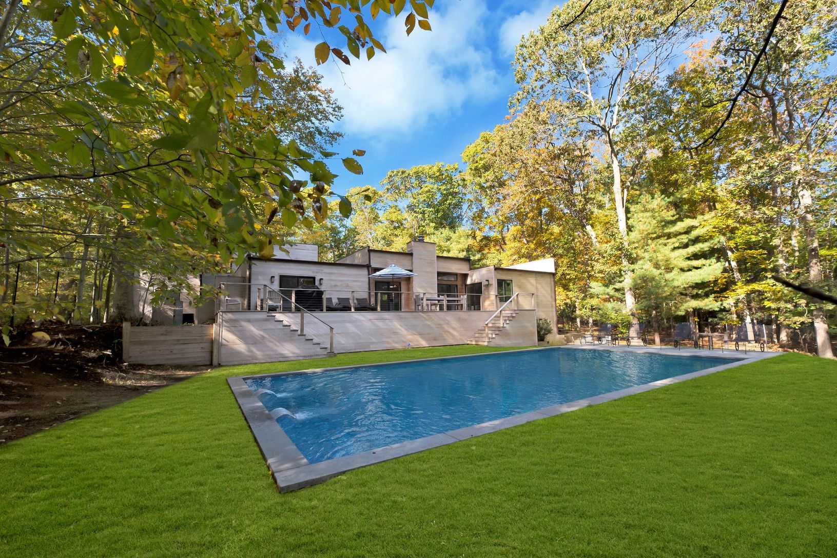 Minutes to the Village of East Hampton and ocean beaches, high in wooded terrain, sits this modern gem renovated top to bottom with first-rate components and a fresh aesthetic for the best of beach living. An incredible chef's kitchen with quartz countertops, granite island, and Thermador appliances opens to a high-ceilinged living area with a marble fireplace flanked by sliding doors leading to a mahogany deck overlooking a 20' x 40' gunite,