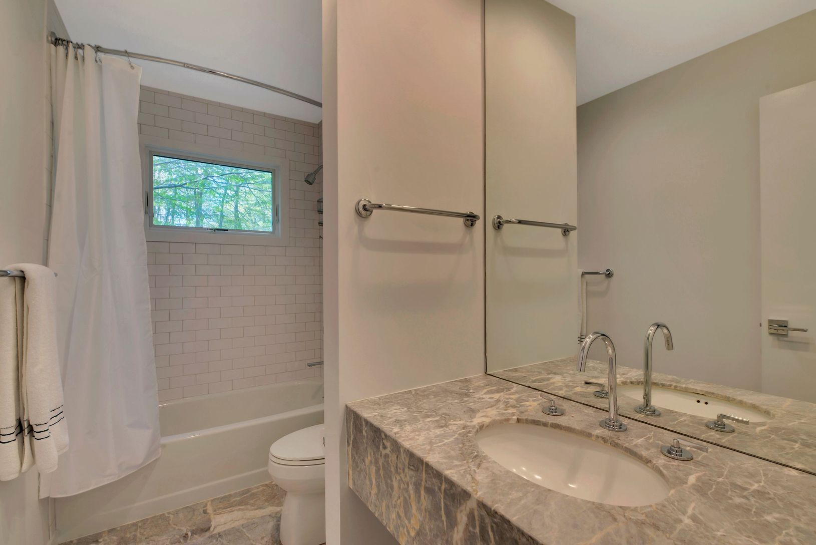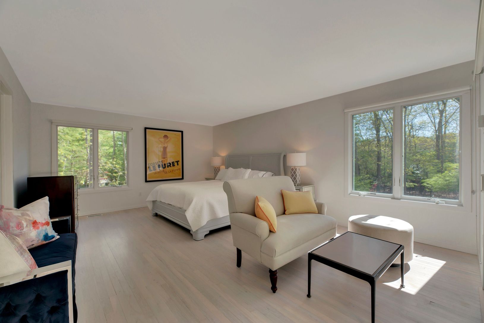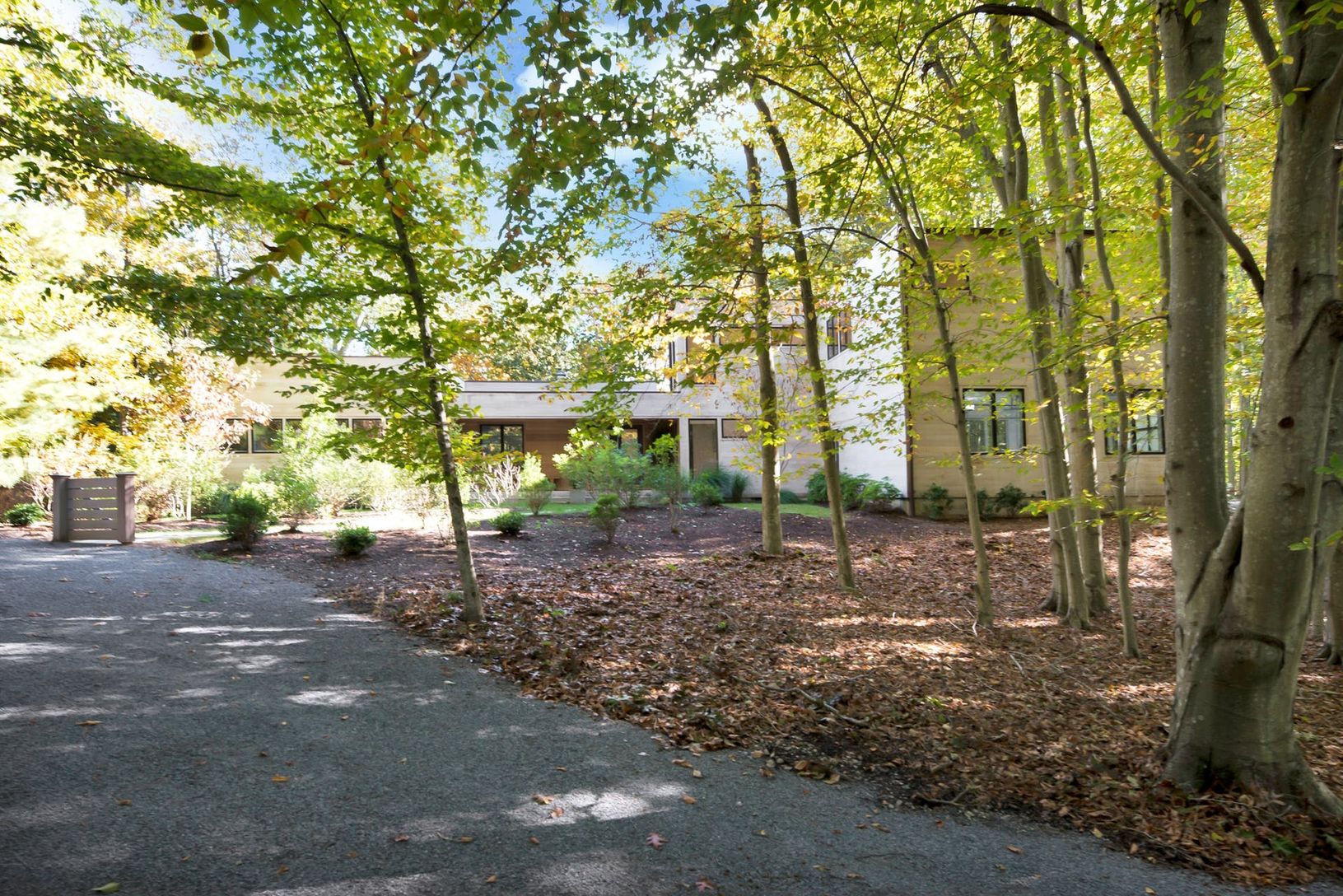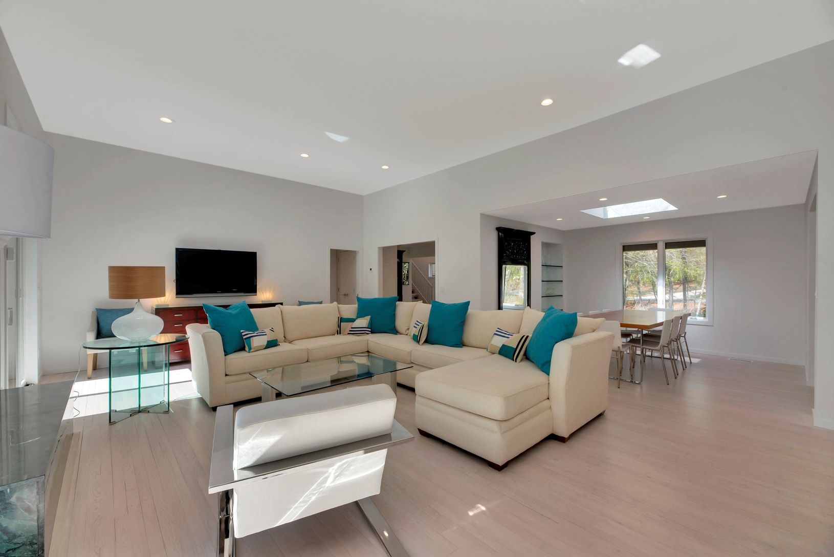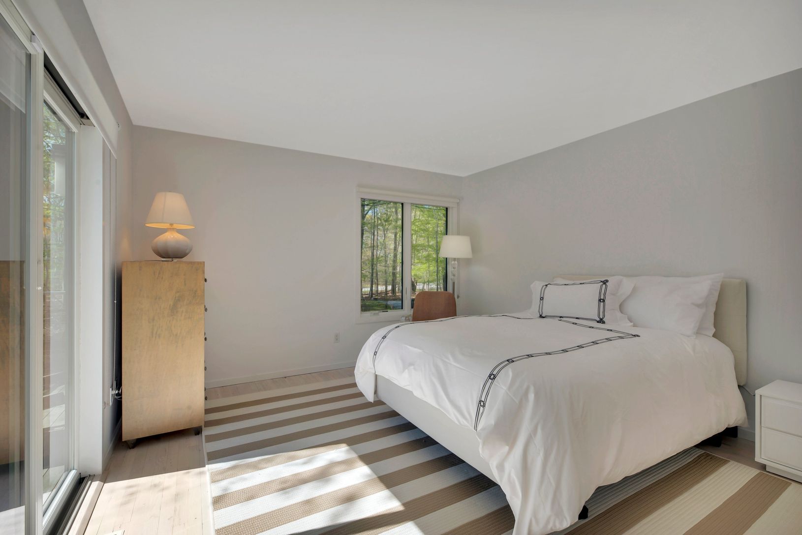 Minutes to the Village of East Hampton and ocean beaches, high in wooded terrain, sits this modern gem renovated top to bottom with first-rate components and a fresh aesthetic for the best of beach living. An incredible chef's kitchen with quartz countertops, granite island, and Thermador appliances opens to a high-ceilinged living area with a marble fireplace flanked by sliding doors leading to a mahogany deck overlooking a 20' x 40' gunite,