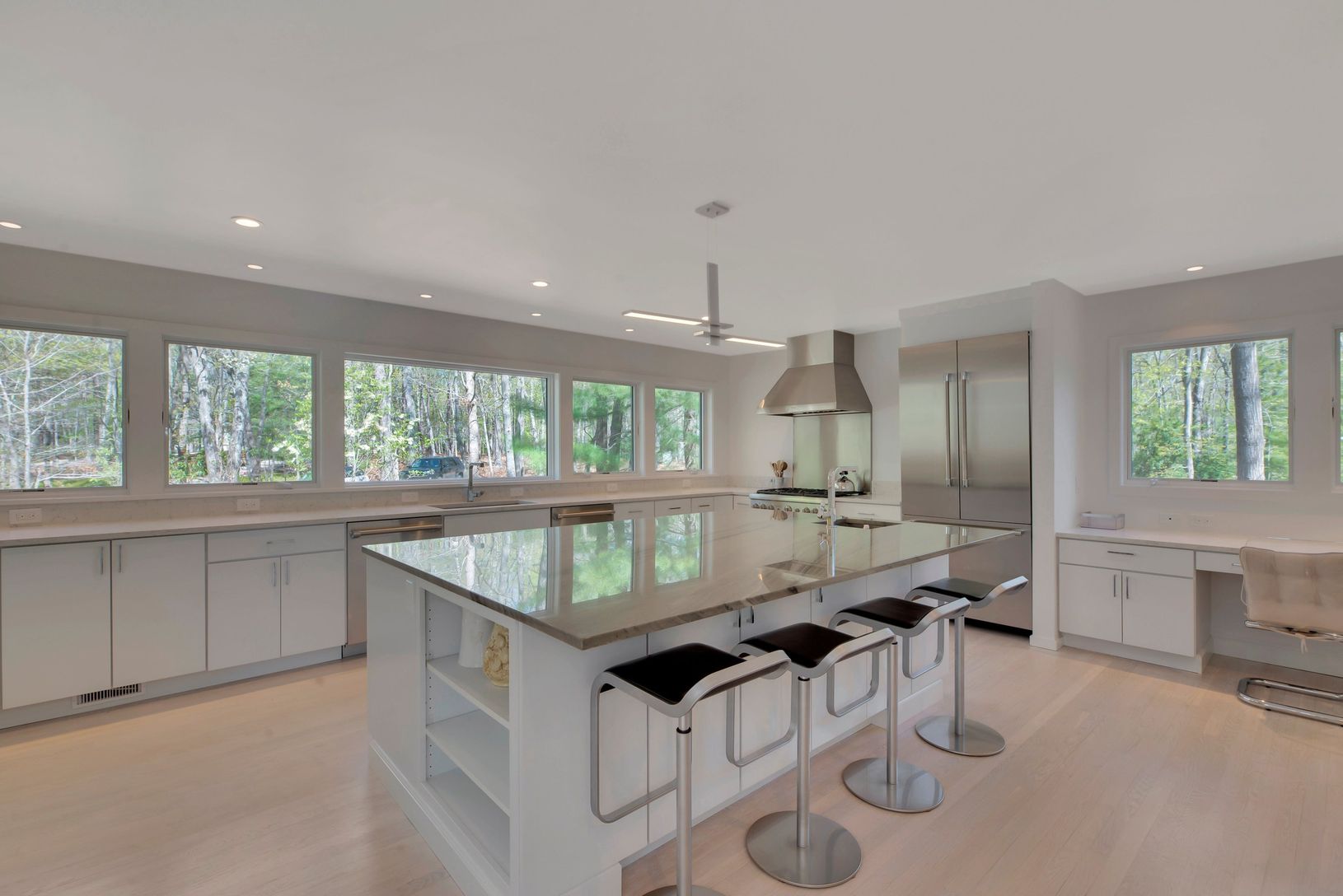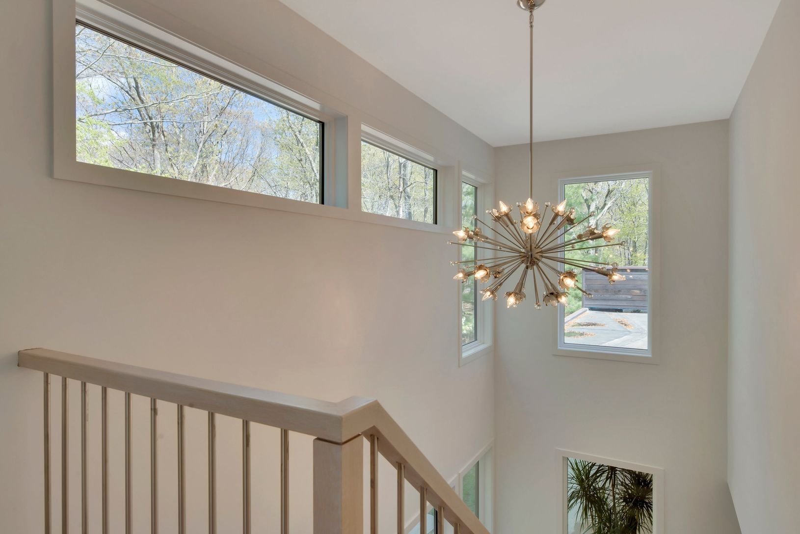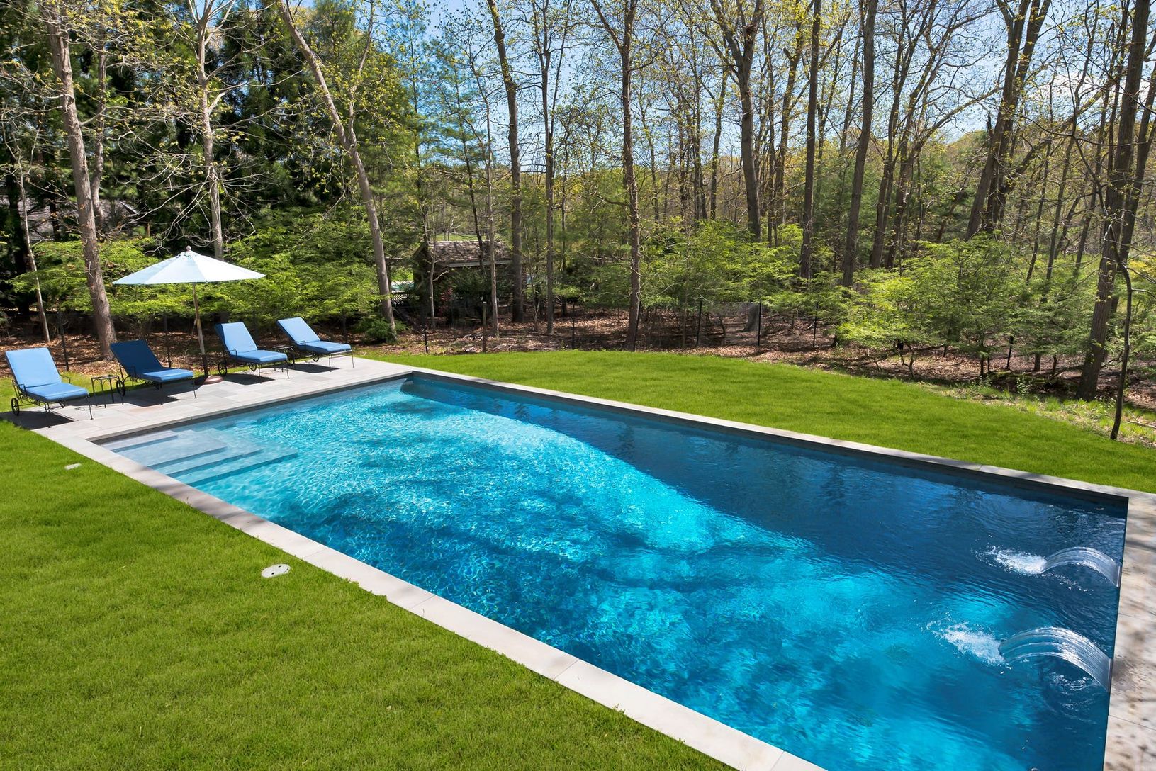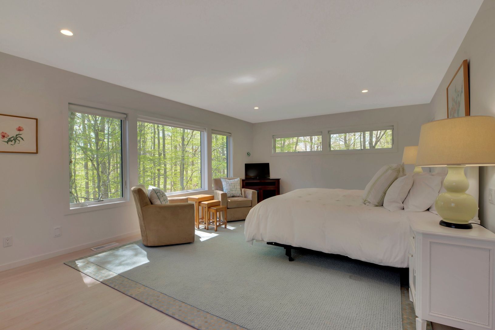 Minutes to the Village of East Hampton and ocean beaches, high in wooded terrain, sits this modern gem renovated top to bottom with first-rate components and a fresh aesthetic for the best of beach living. An incredible chef's kitchen with quartz countertops, granite island, and Thermador appliances opens to a high-ceilinged living area with a marble fireplace flanked by sliding doors leading to a mahogany deck overlooking a 20' x 40' gunite,