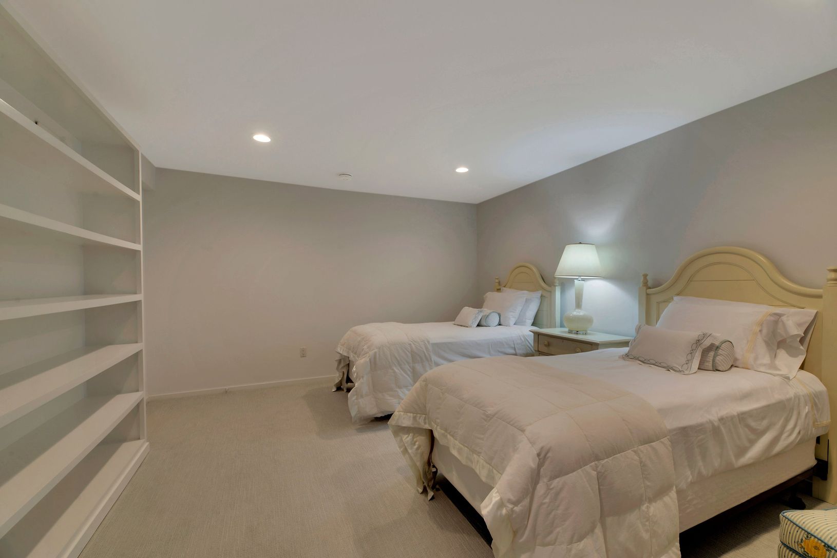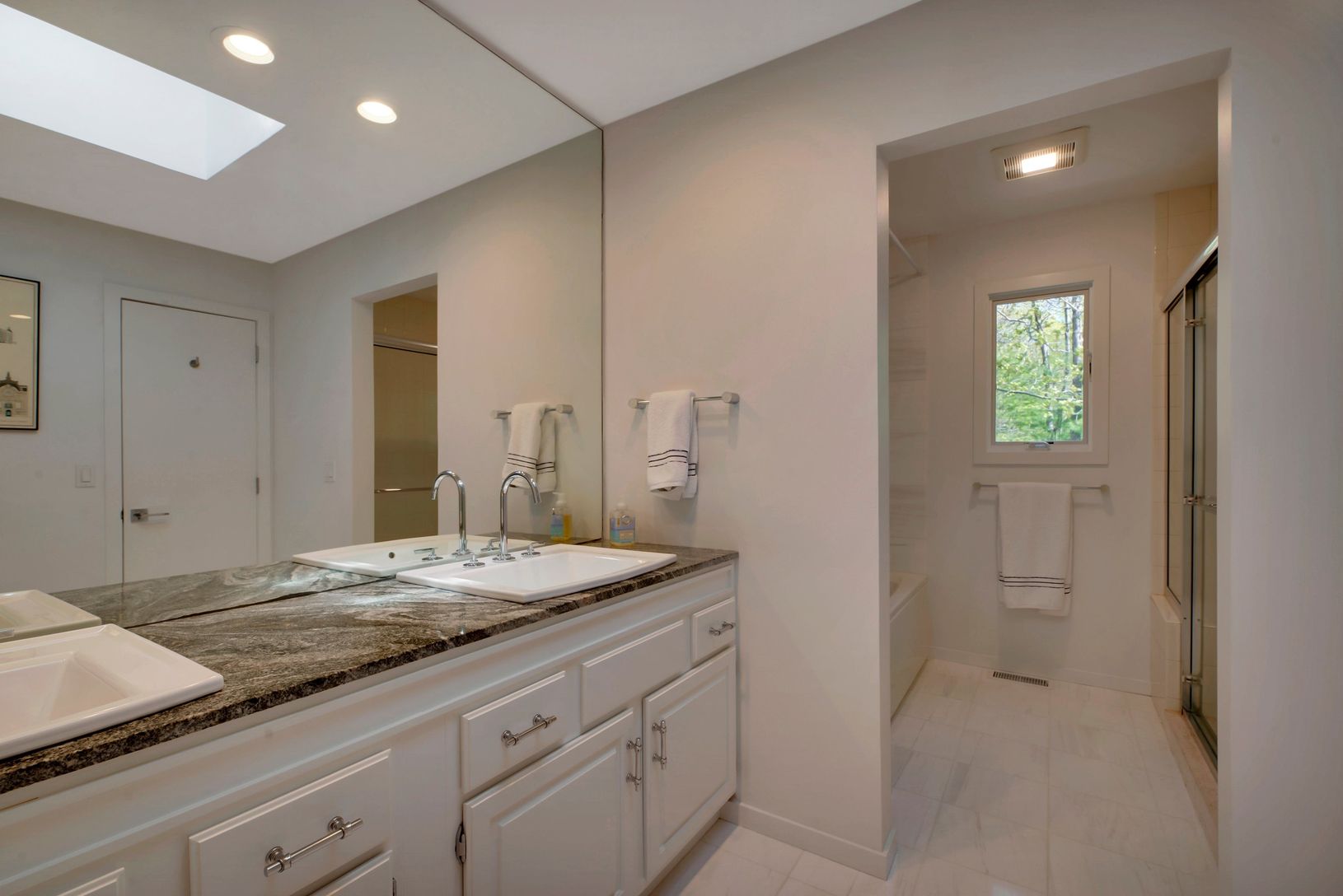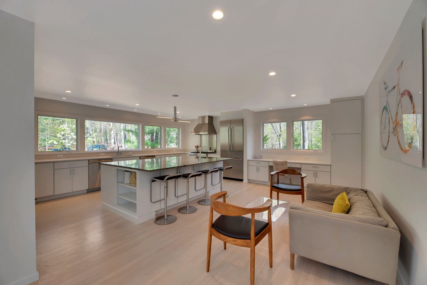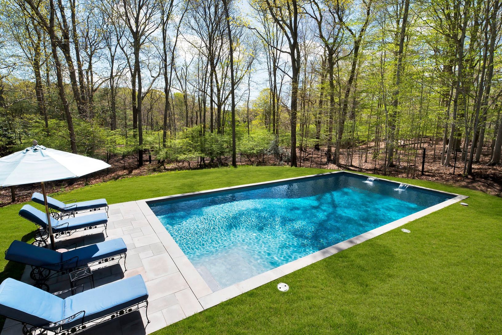 Minutes to the Village of East Hampton and ocean beaches, high in wooded terrain, sits this modern gem renovated top to bottom with first-rate components and a fresh aesthetic for the best of beach living. An incredible chef's kitchen with quartz countertops, granite island, and Thermador appliances opens to a high-ceilinged living area with a marble fireplace flanked by sliding doors leading to a mahogany deck overlooking a 20' x 40' gunite,