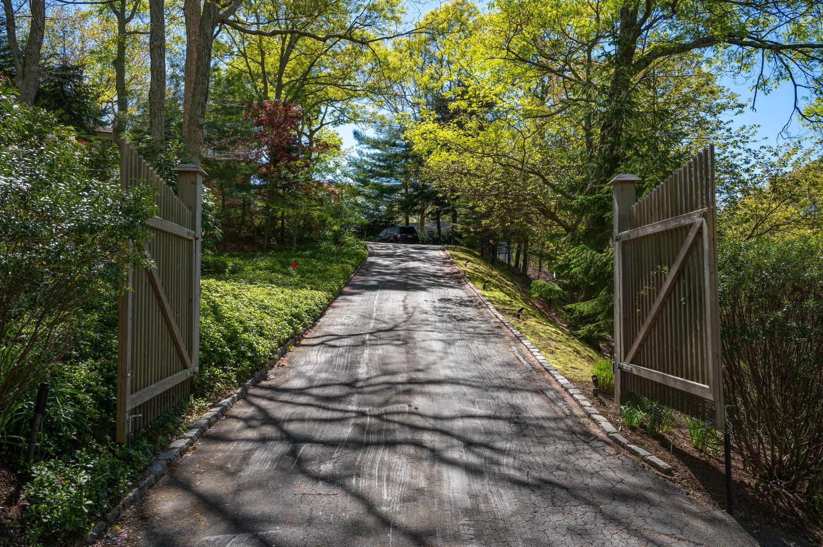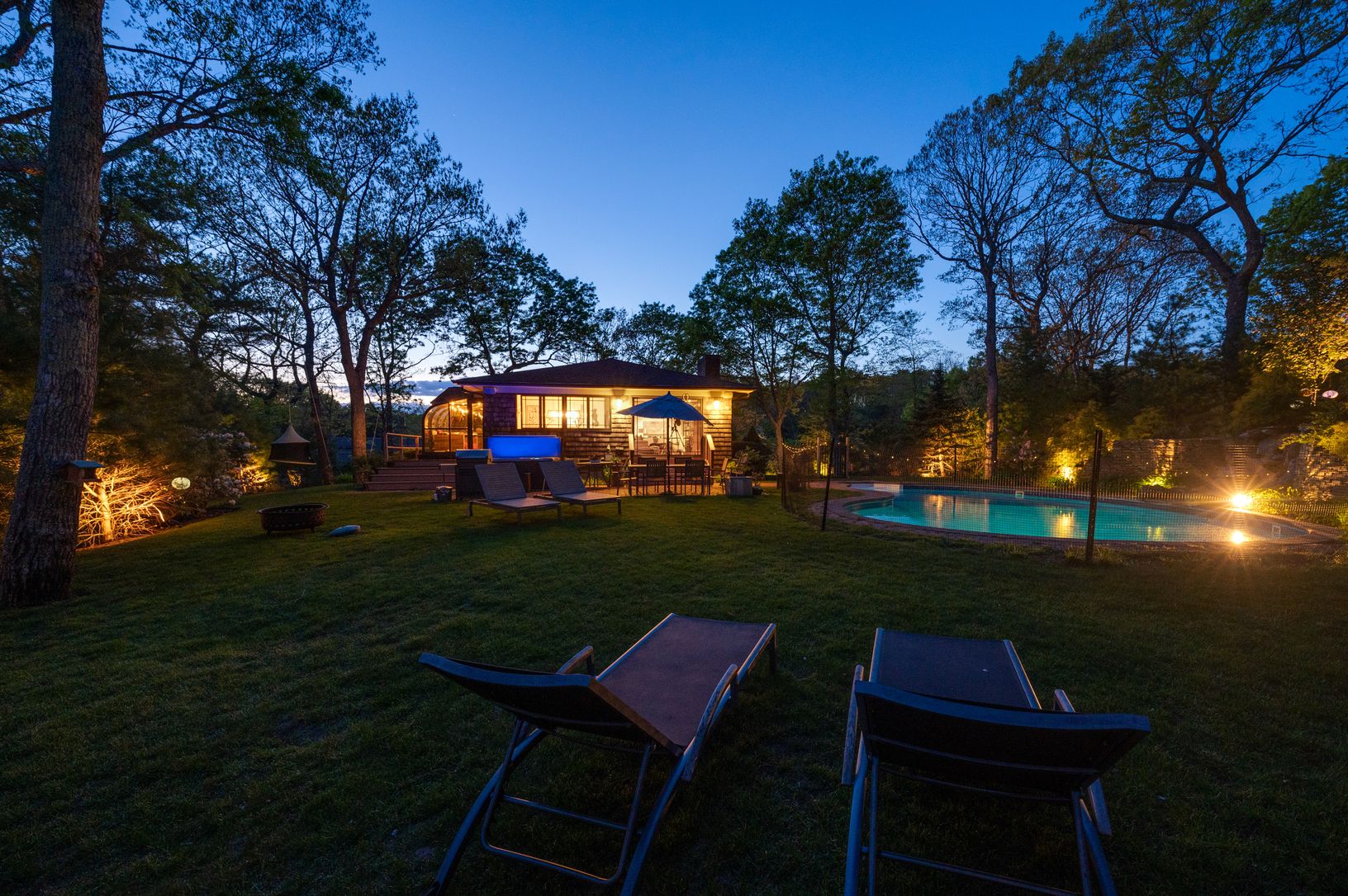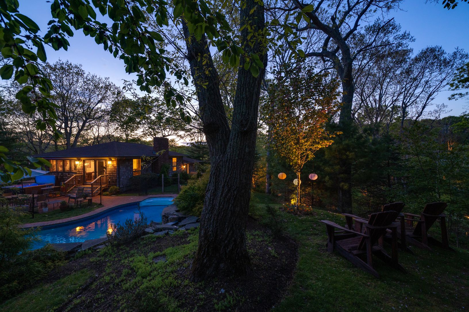 Tucked away in the exclusive Landfall section of the Northwest Woods in East Hampton, this stylish contemporary home is perched atop a hill beyond private gates, offering ultimate seclusion and tranquility.