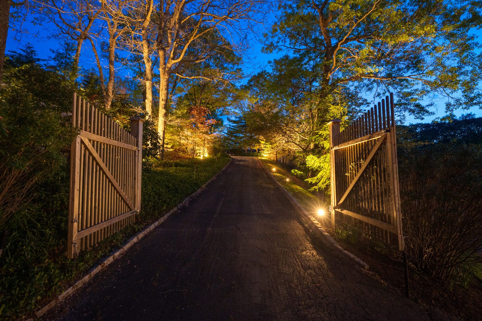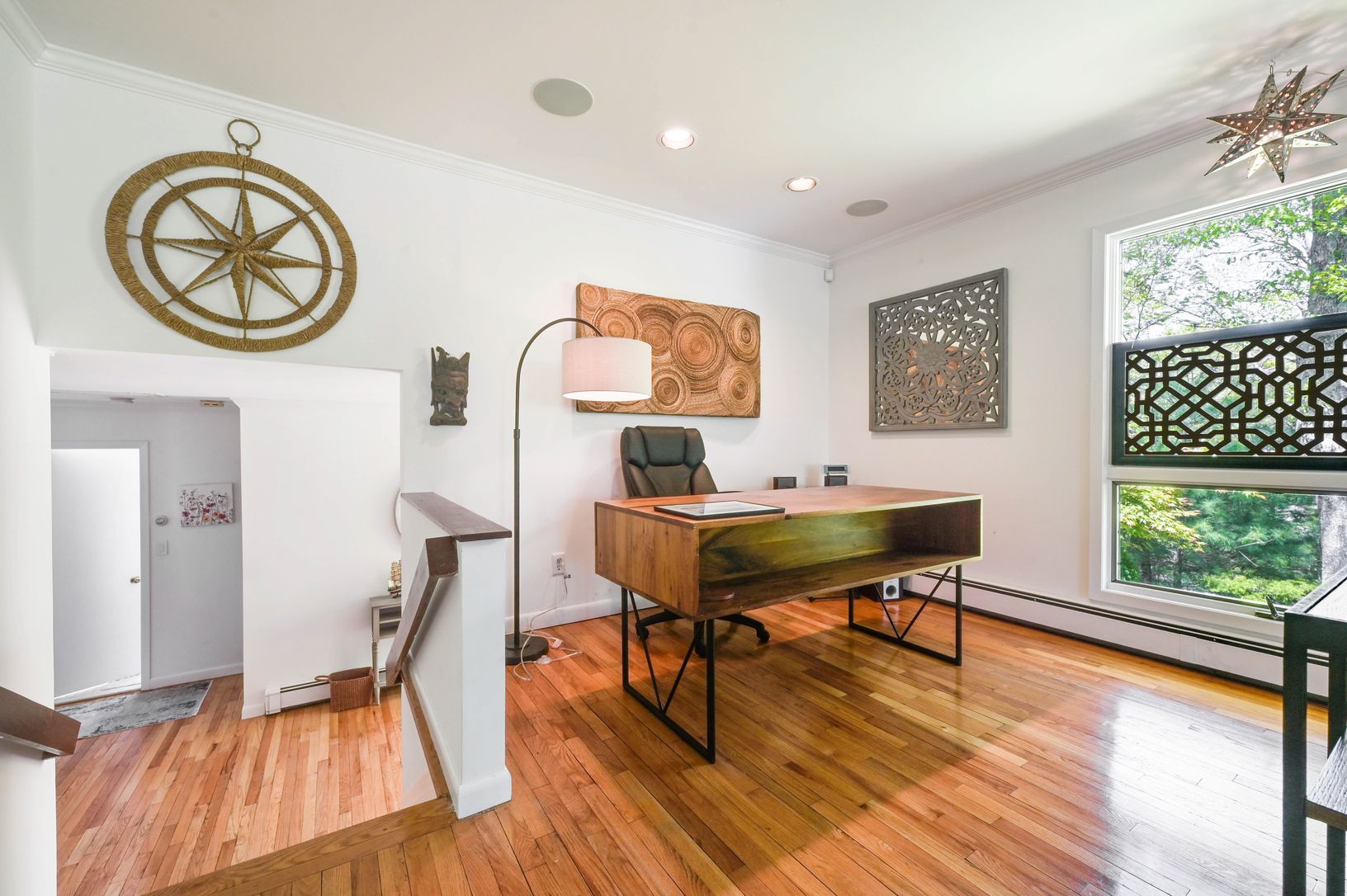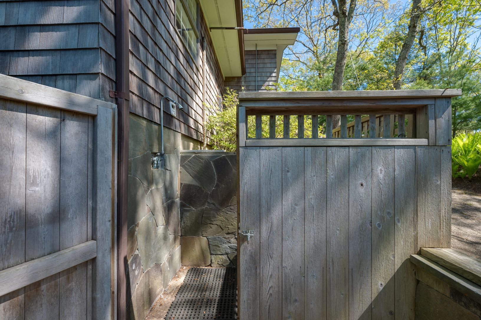 Tucked away in the exclusive Landfall section of the Northwest Woods in East Hampton, this stylish contemporary home is perched atop a hill beyond private gates, offering ultimate seclusion and tranquility.