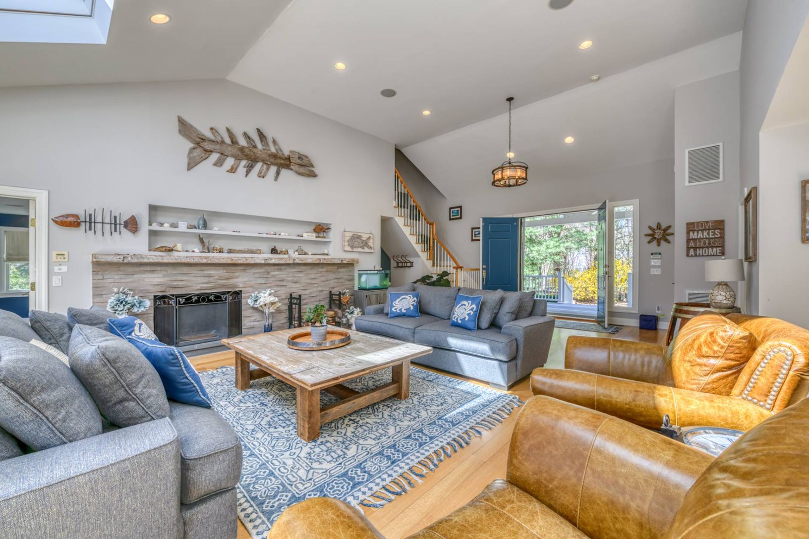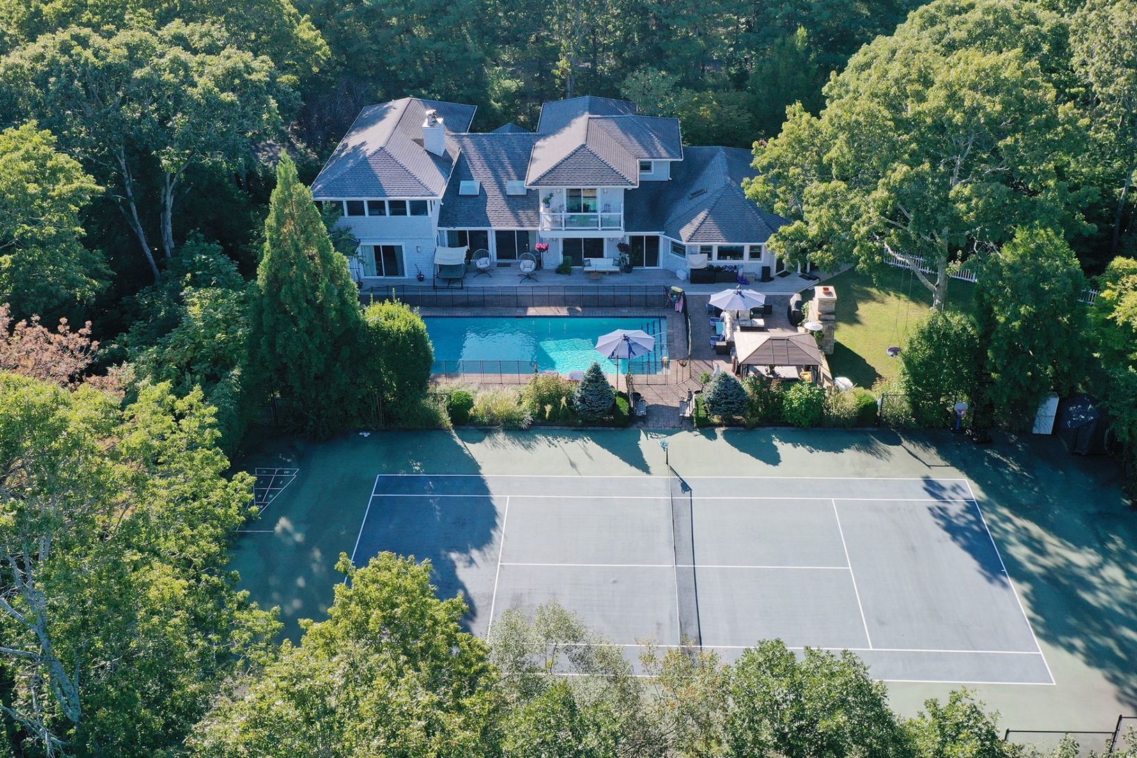 Available Extended Season Memorial Day - September 30th for $145k ~ Nestled on a private 2-acre cul-de-sac in the prestigious Crossings at Quogue, this exquisite Hamptons residence epitomizes summer luxury, offering an expansive 6,000 +/- sq. ft. of living space across three meticulously designed levels including finished lower level. The grand, light-filled living room features cathedral ceilings and extends seamlessly into a sophisticated di