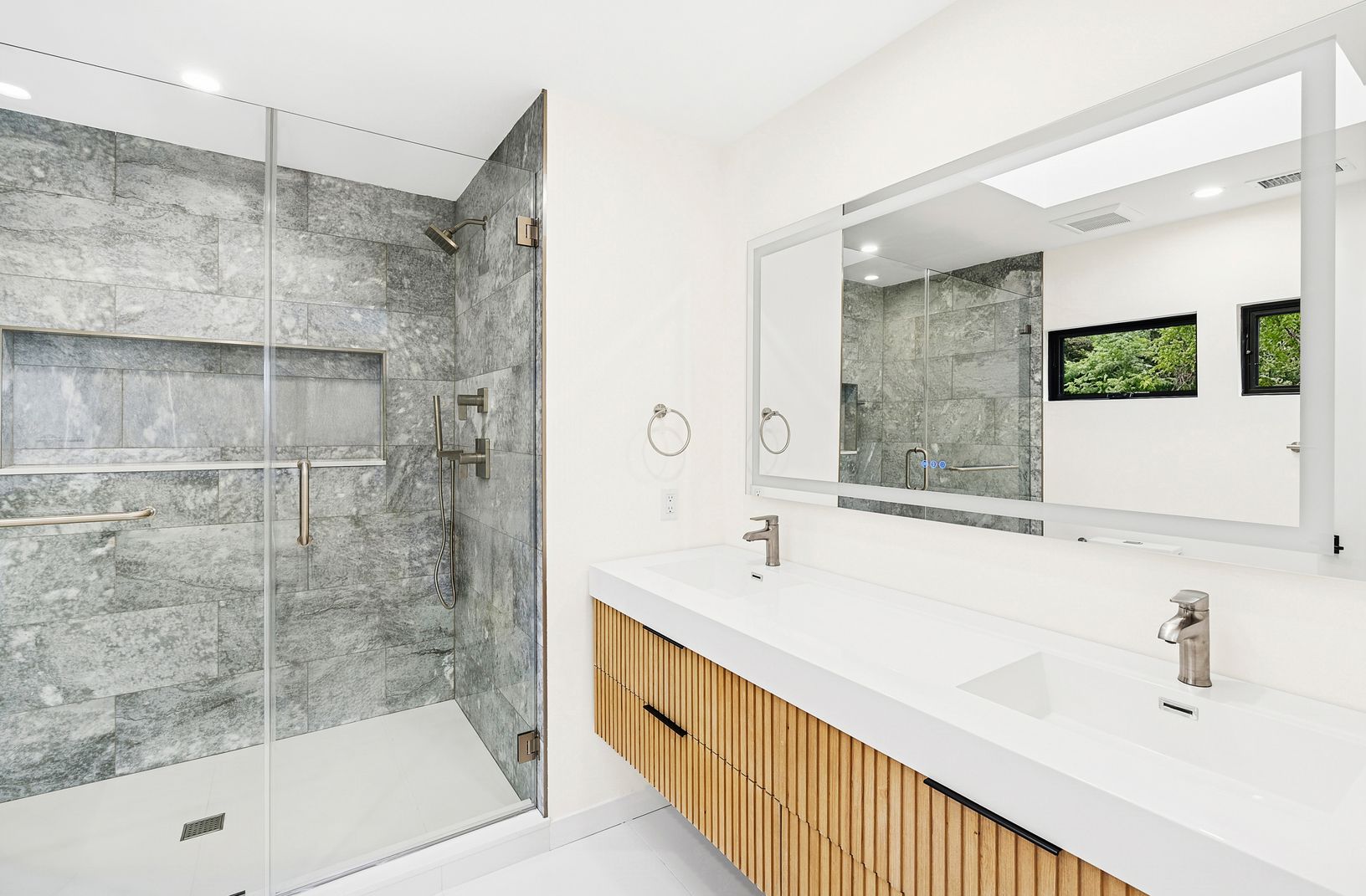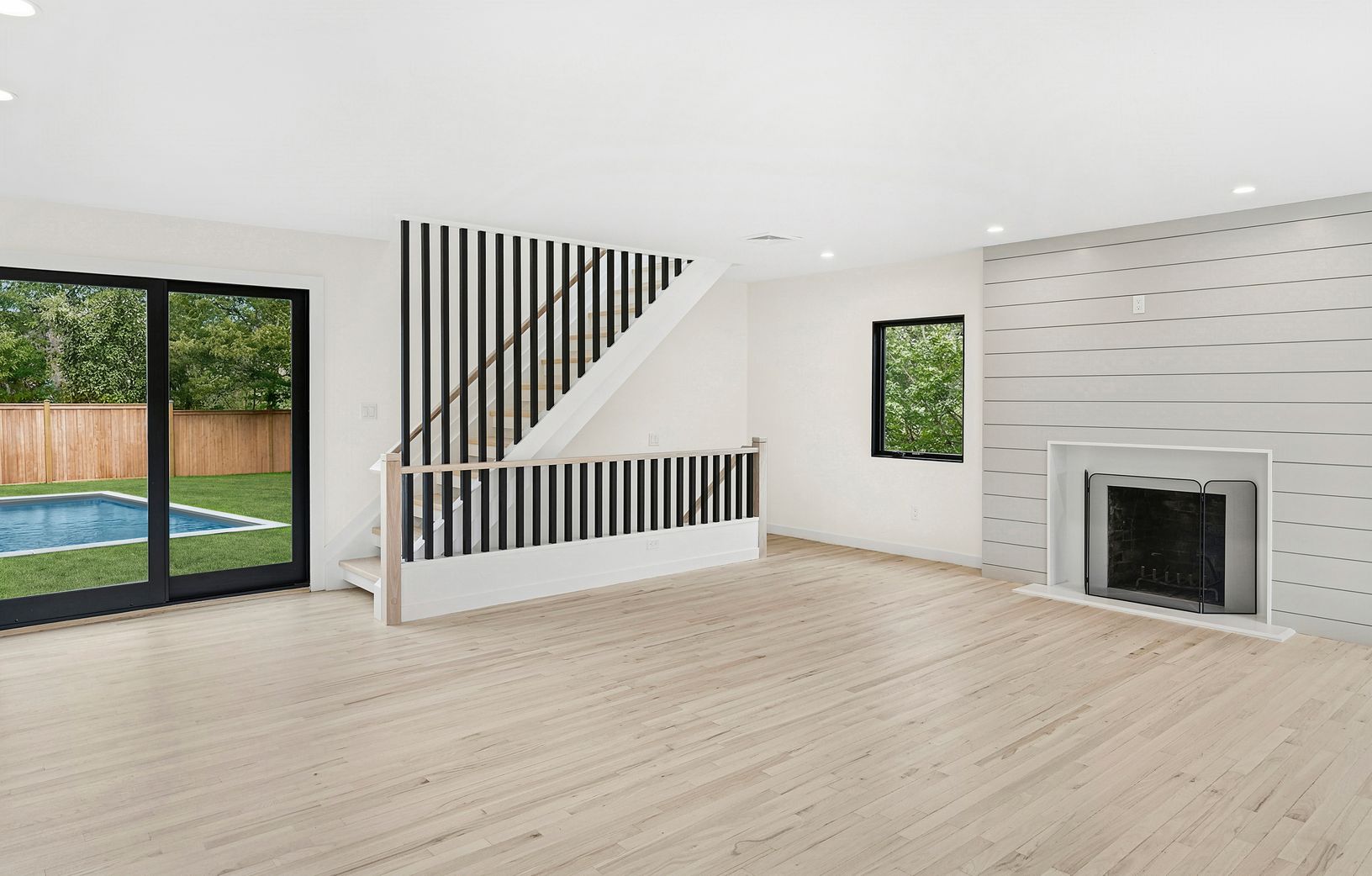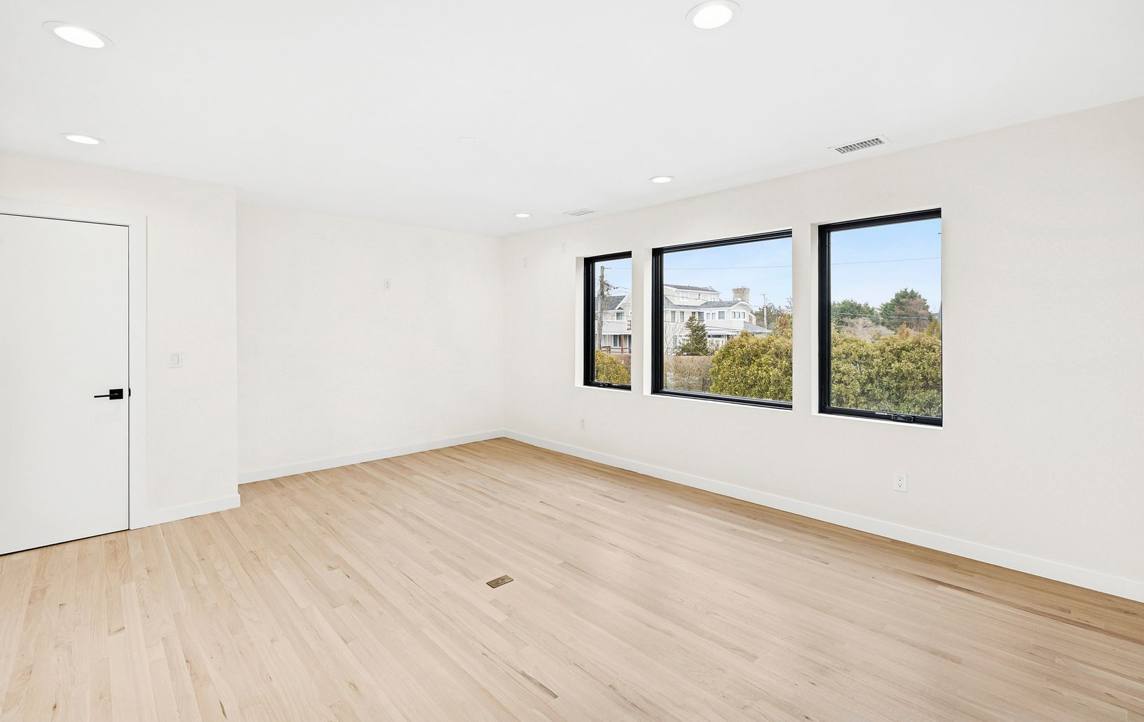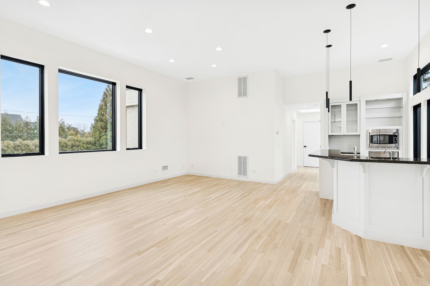 Modern five-bedroom, four-bath residence offering approximately 2,900 sq. ft. of light-filled living space with red oak floors, new Marvin Elevate windows, and a wood-burning fireplace. The home features a wet bar, second-story roof deck with trellis, and a sleek kitchen with flat-panel cabinetry, white quartz countertops, ceramic backsplash, Kohler fixtures, and a full appliance package including a Thor electric range and Frigidaire refrigera