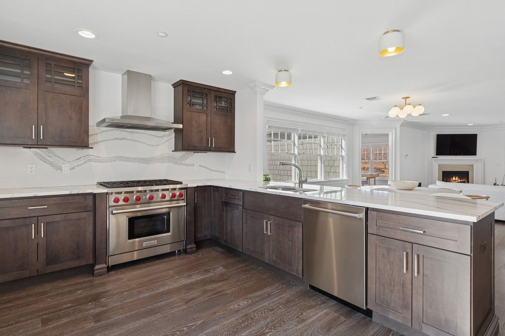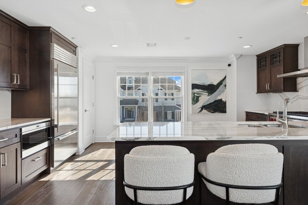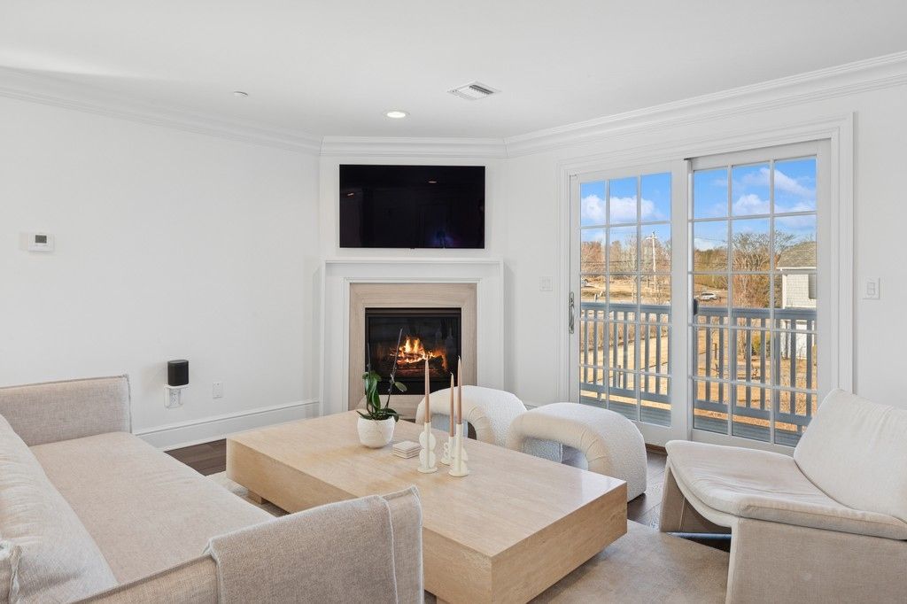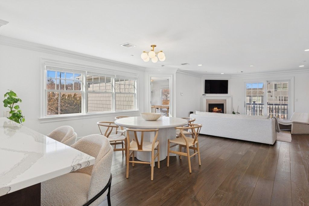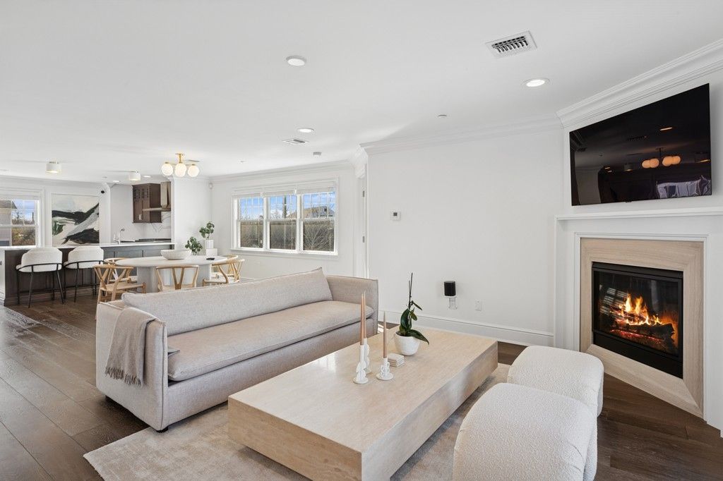 Discover refined Hamptons living in this bright, oversized, and nearly untouched upstairs condo at Southampton Pointe, an exclusive boutique development. Thoughtfully designed with an expansive layout, this elegant residence boasts top-tier Wolf, Sub-Zero, and Bosch appliances in the eat-in kitchen, which seamlessly flows into a sun-drenched dining area. A gas fireplace serves as a striking centerpiece, anchoring the sophisticated yet inviting